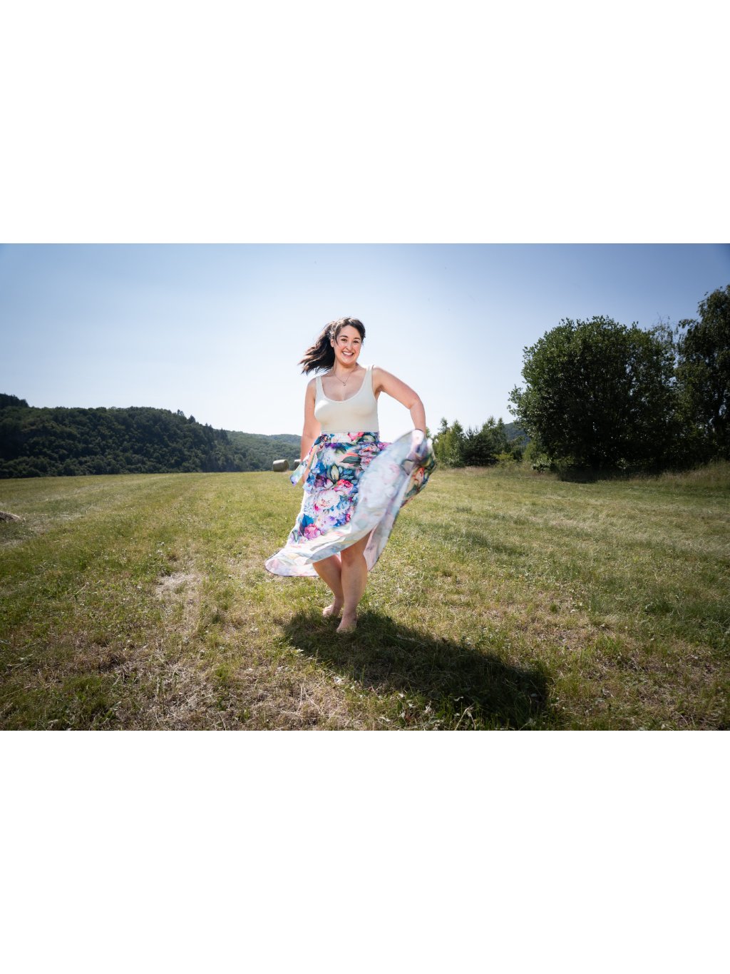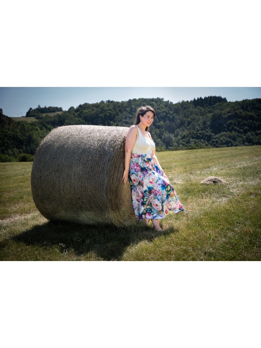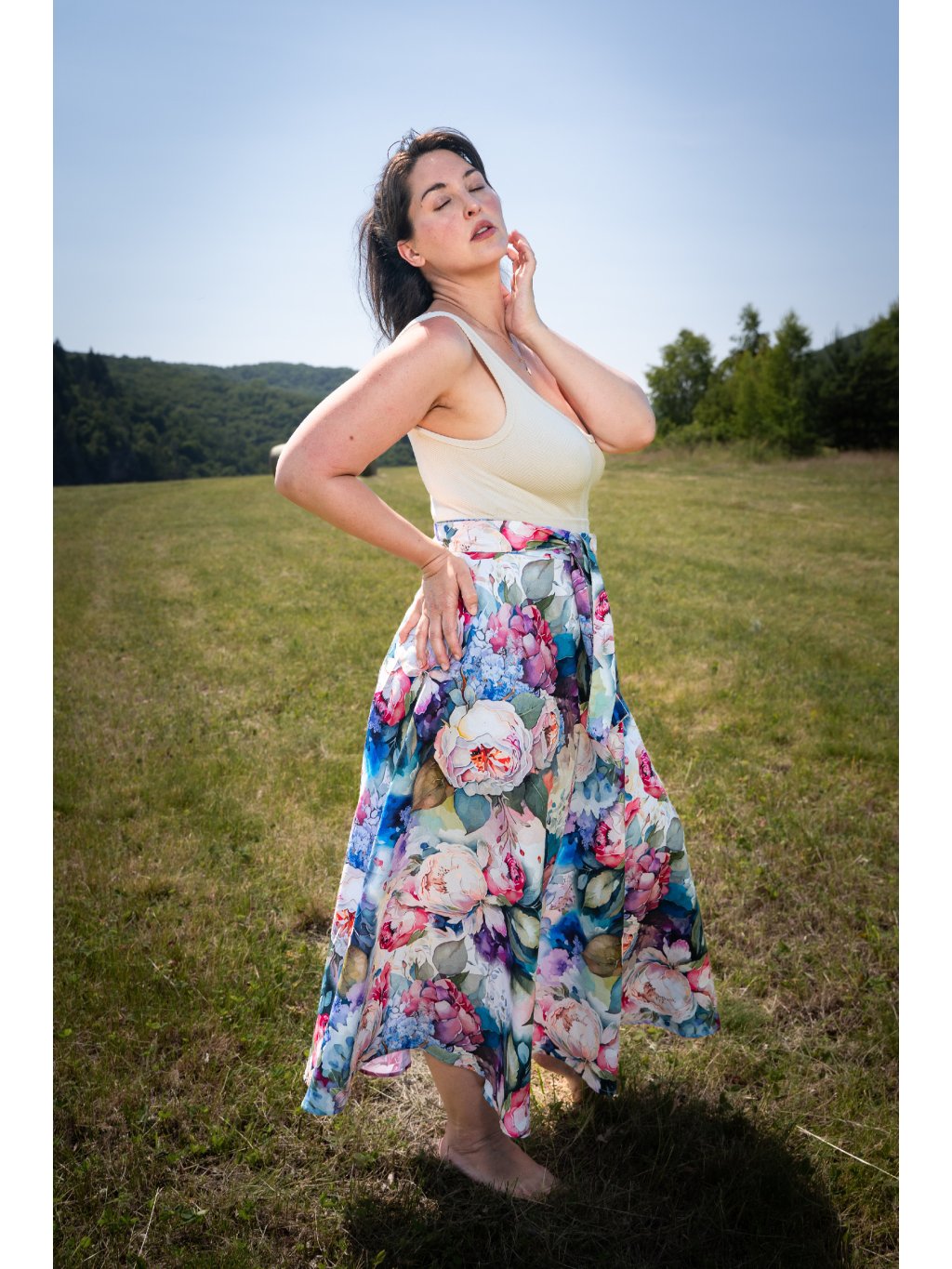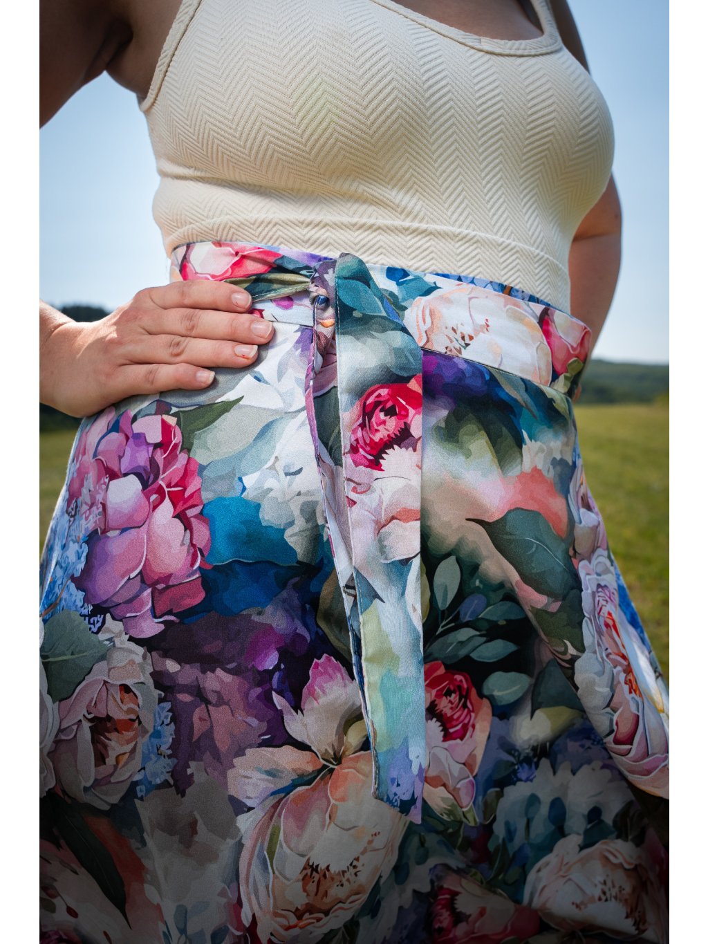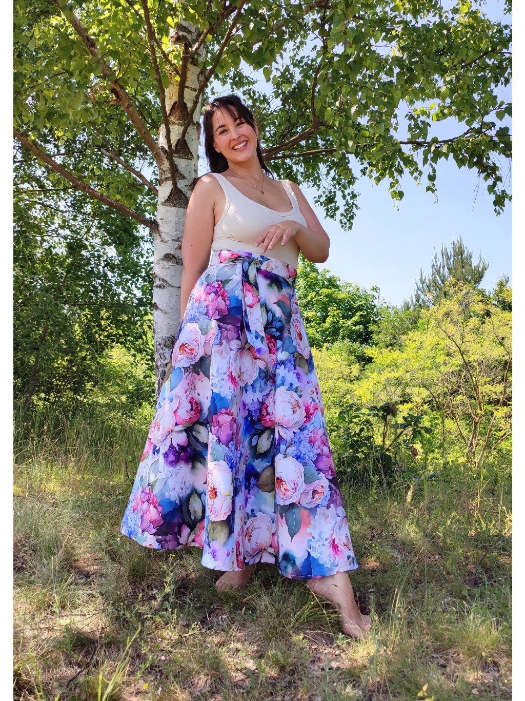 Něžná, zavinovací sukně půlkolového střihu.
