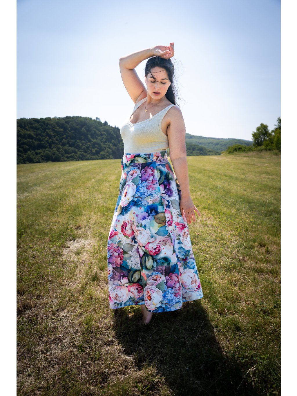 Dlouhá půlkolová sukně - satén - pivoňky