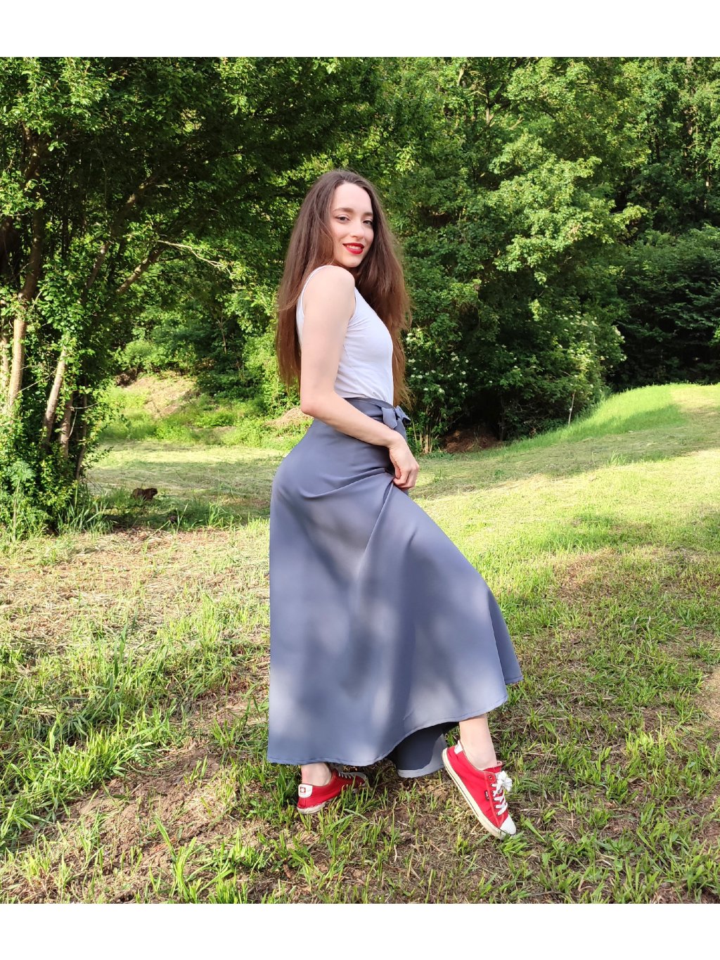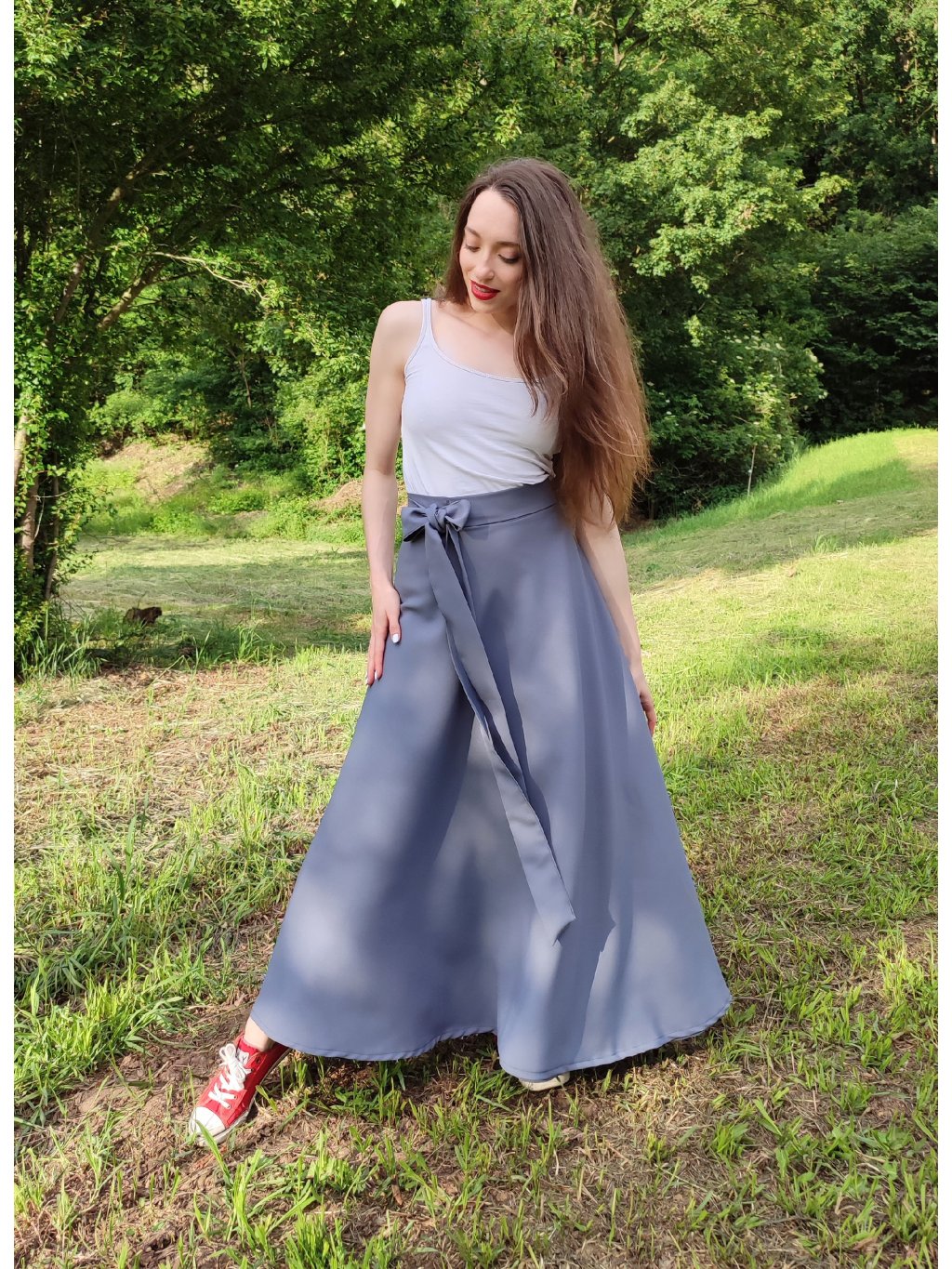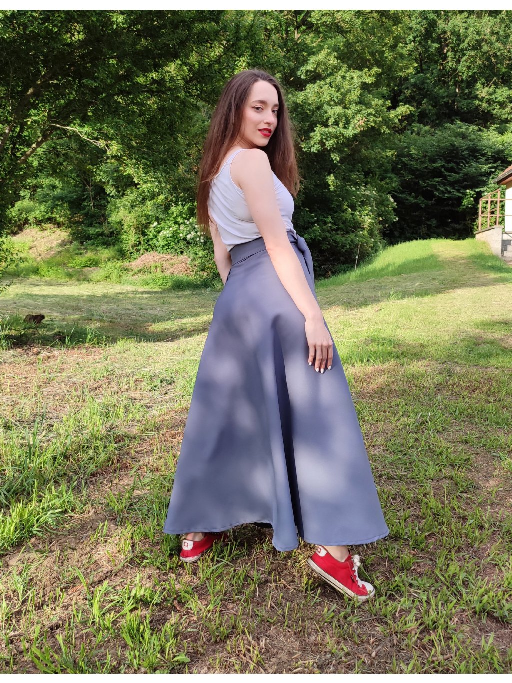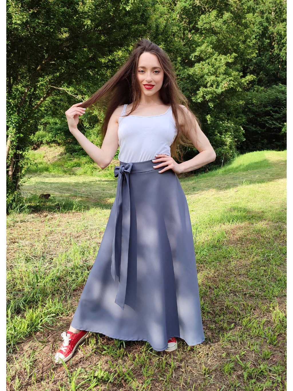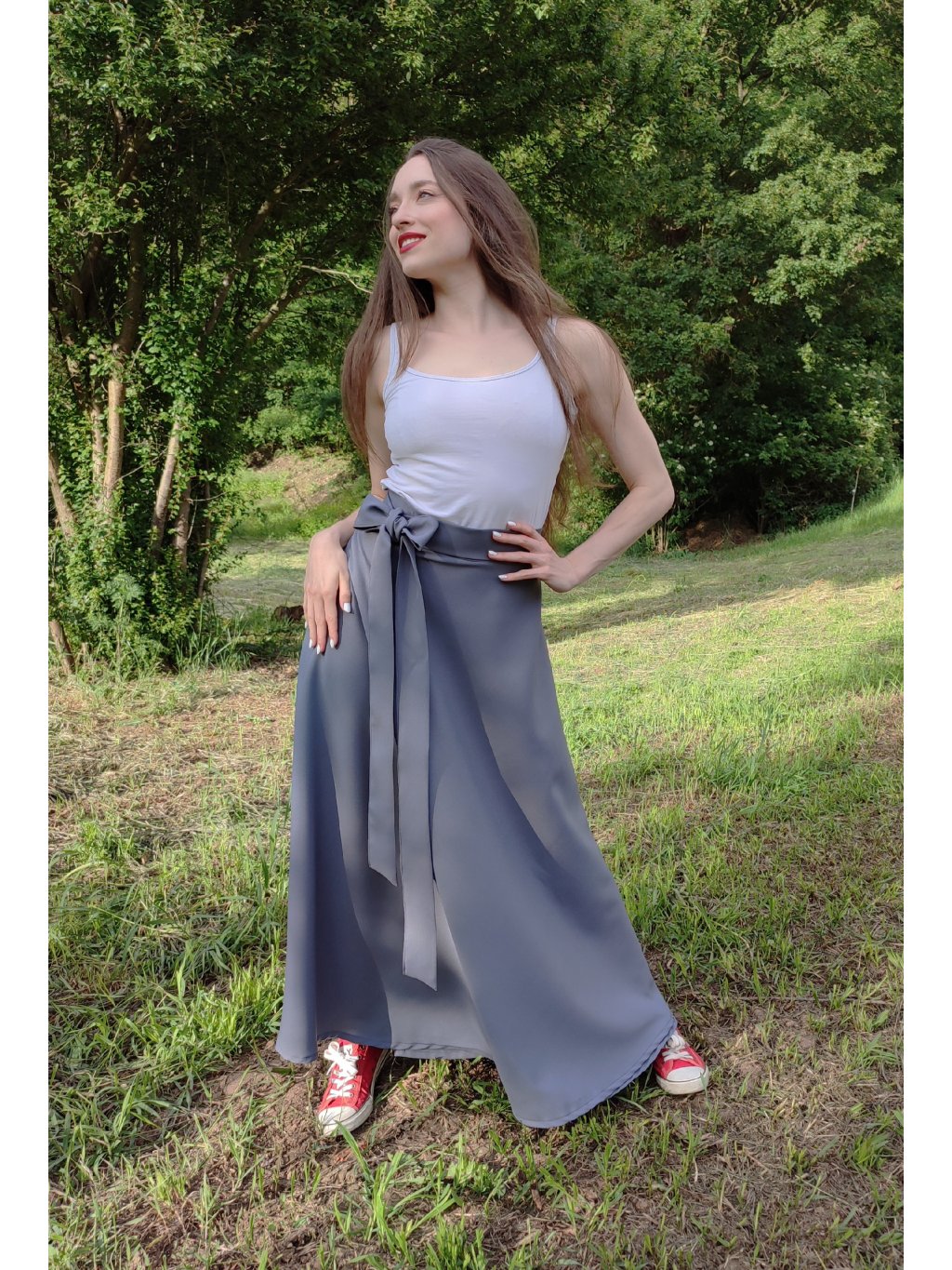 Zavinovací sukně půlkolového střihu v šedé barvě.