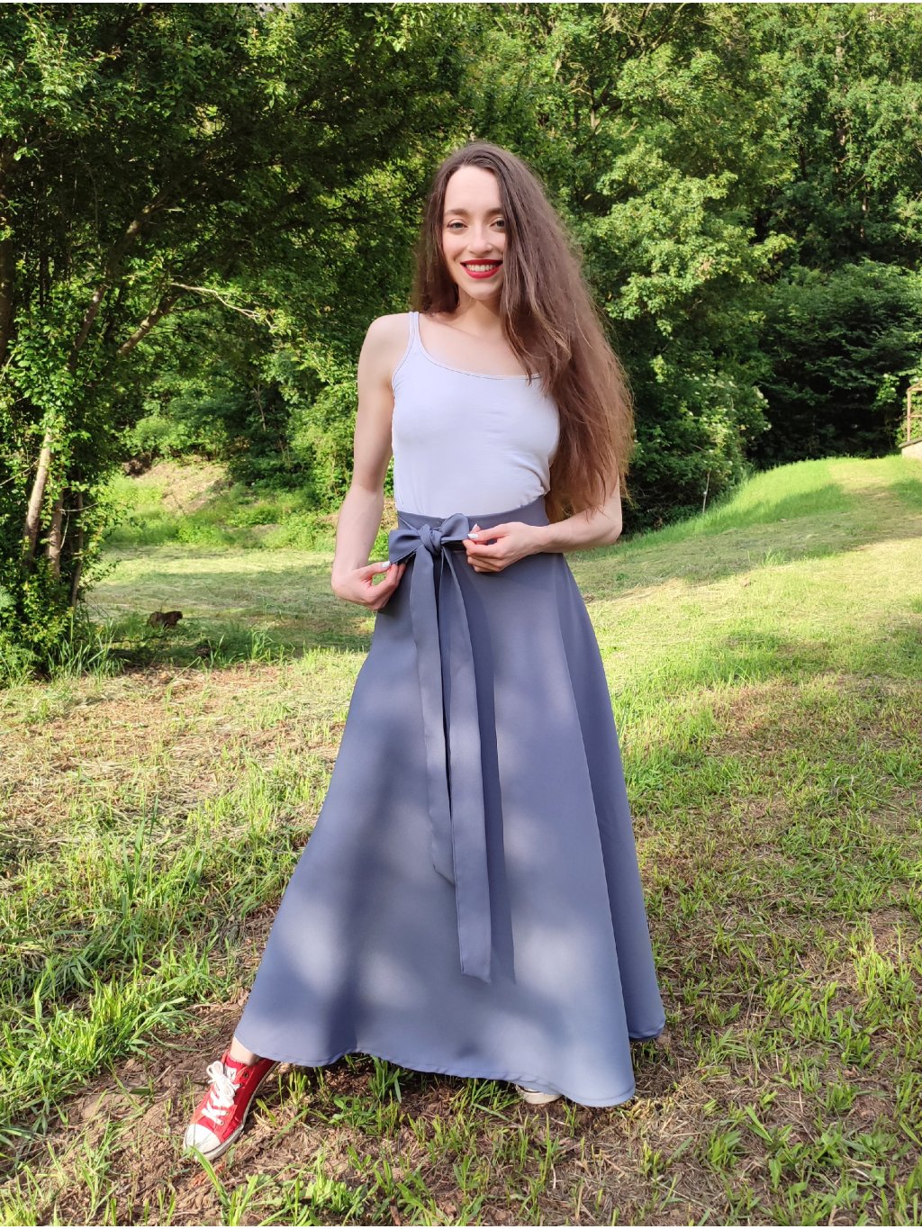 Ušita z umělého vlákna příjemného na omak, které krásně splývá, ale přesto drží bohatý objem. Pohodlný střih, pouze oviňte kolem pasu a uvažte mašli či uzlík.