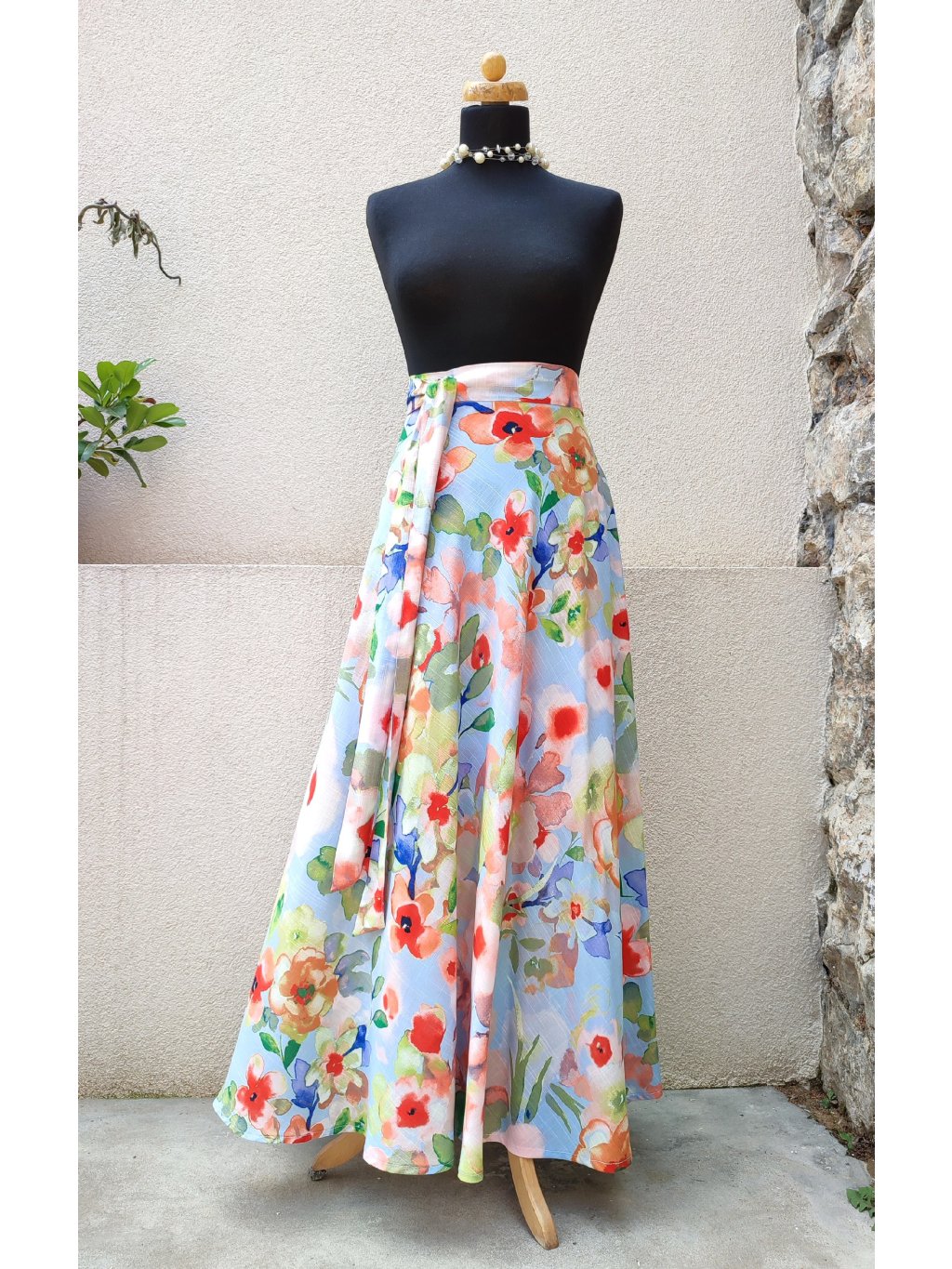 Něžná, zavinovací sukně půlkolového střihu.