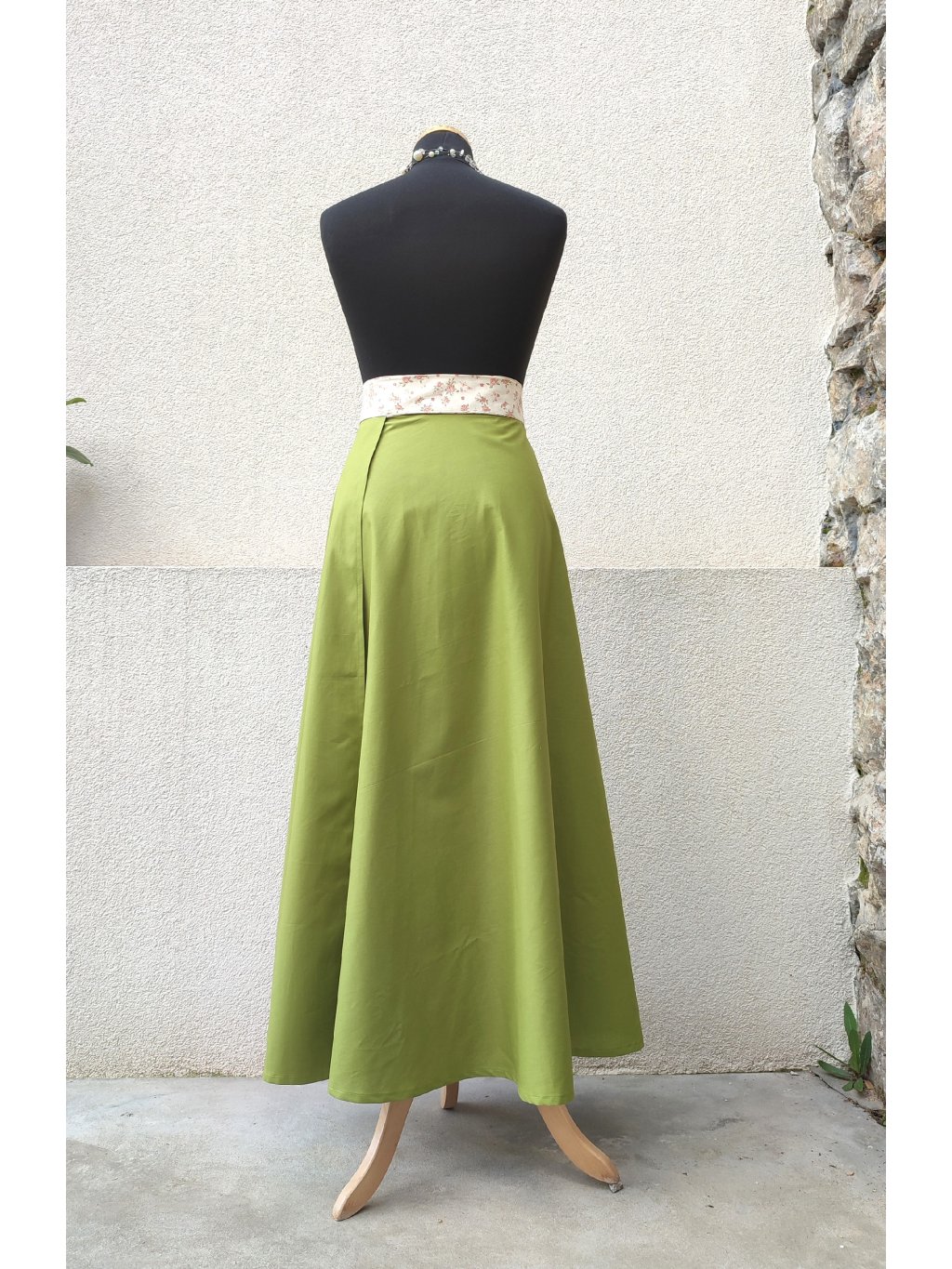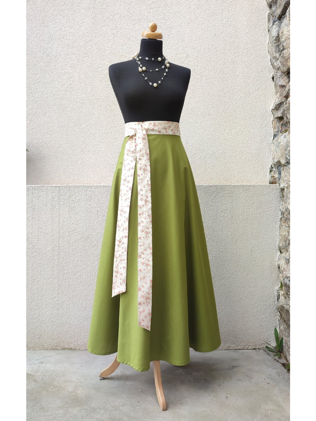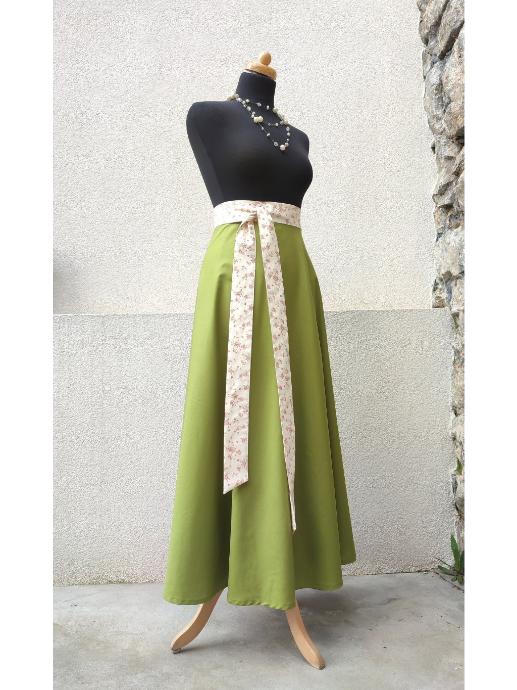 Dlouhá půlkolová sukně - zelená s něžným páskem