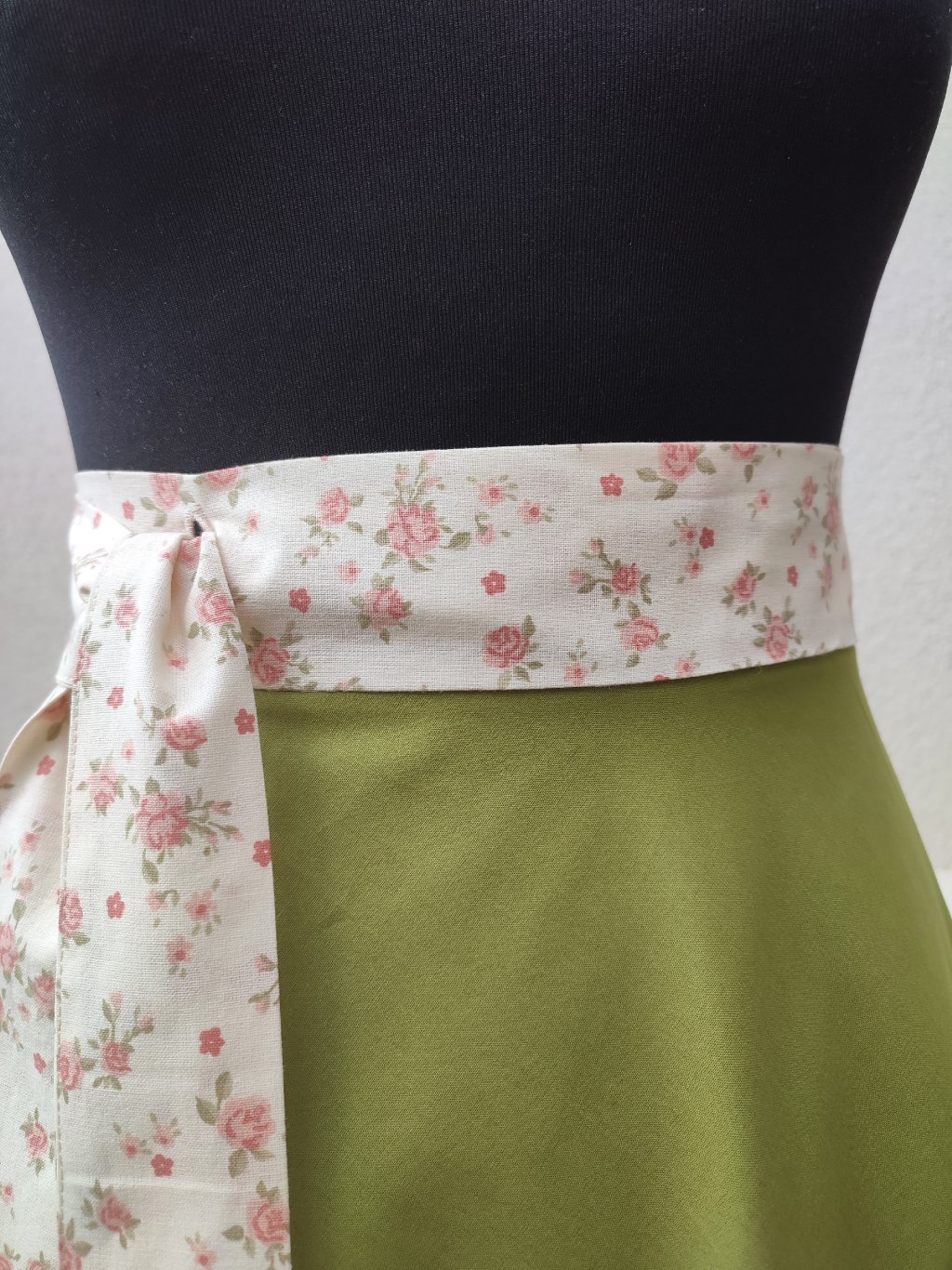Bavlna, olivový odstín mile kontrastuje s kytičkovým páskem.