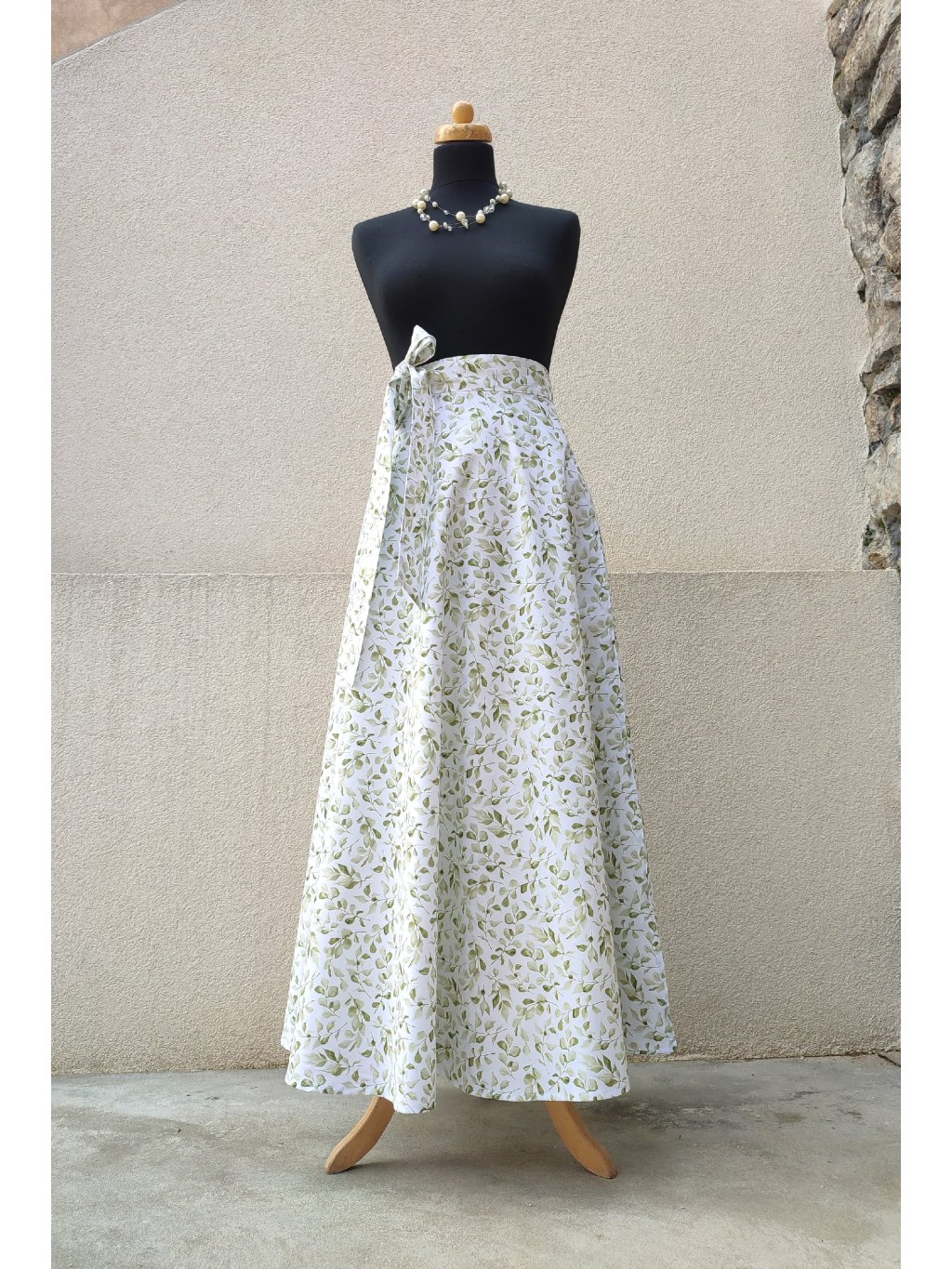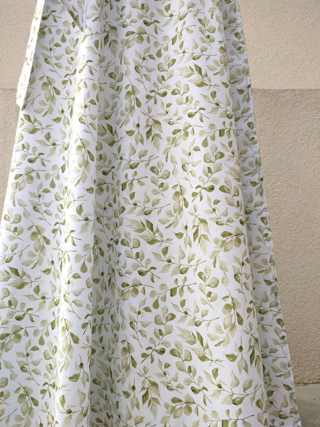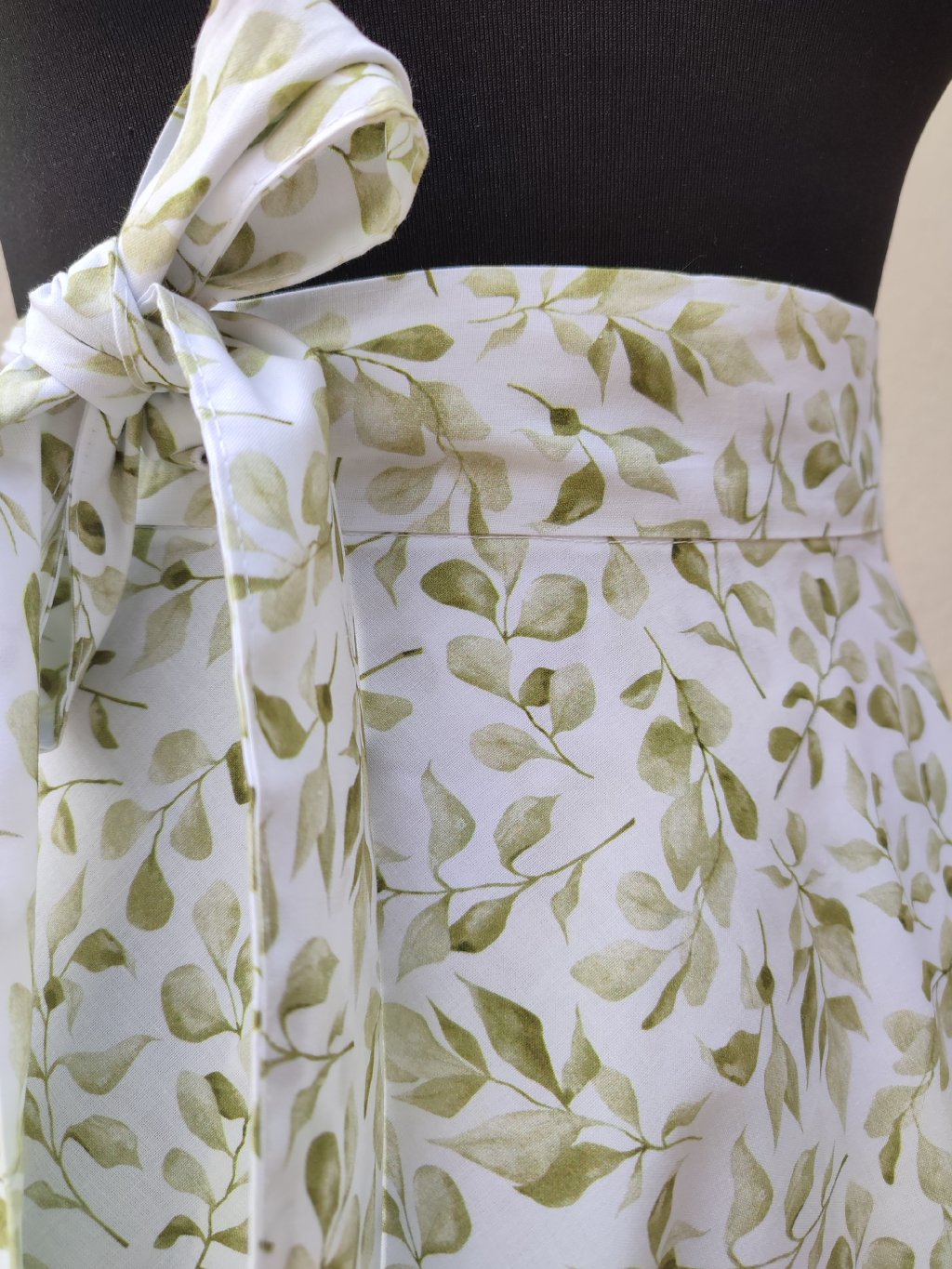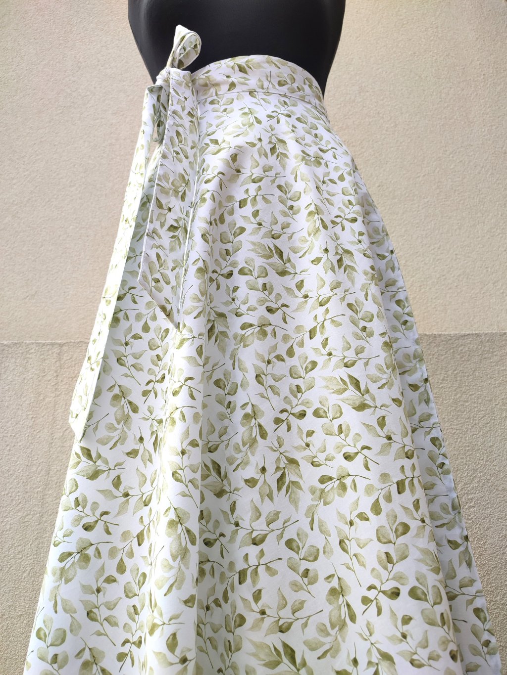 Zavinovací sukně půlkolového střihu, 100% bavlna s jemným, vzorkem zelených lístků.