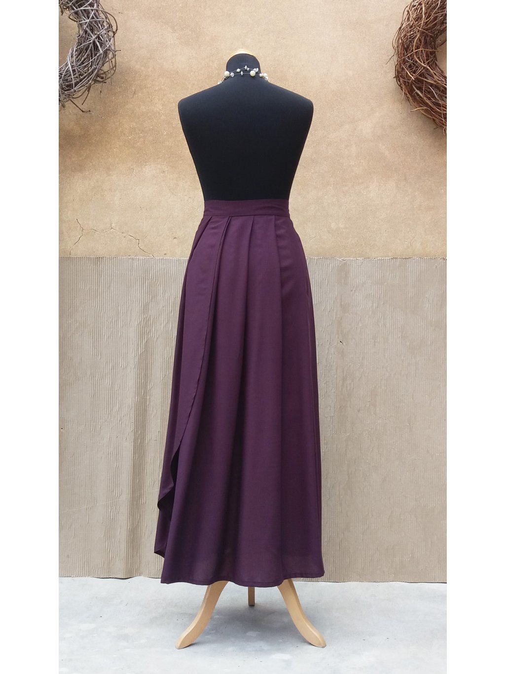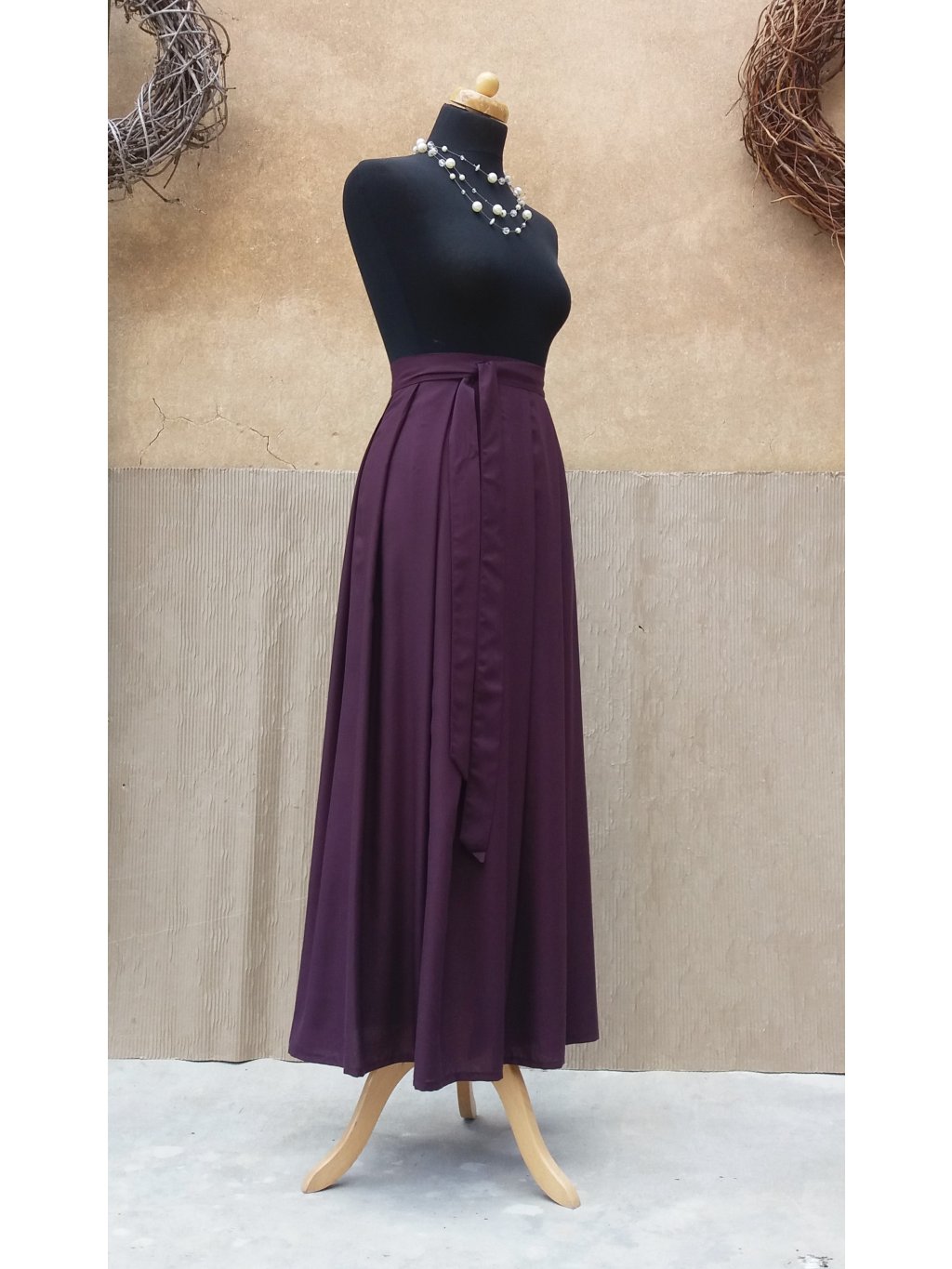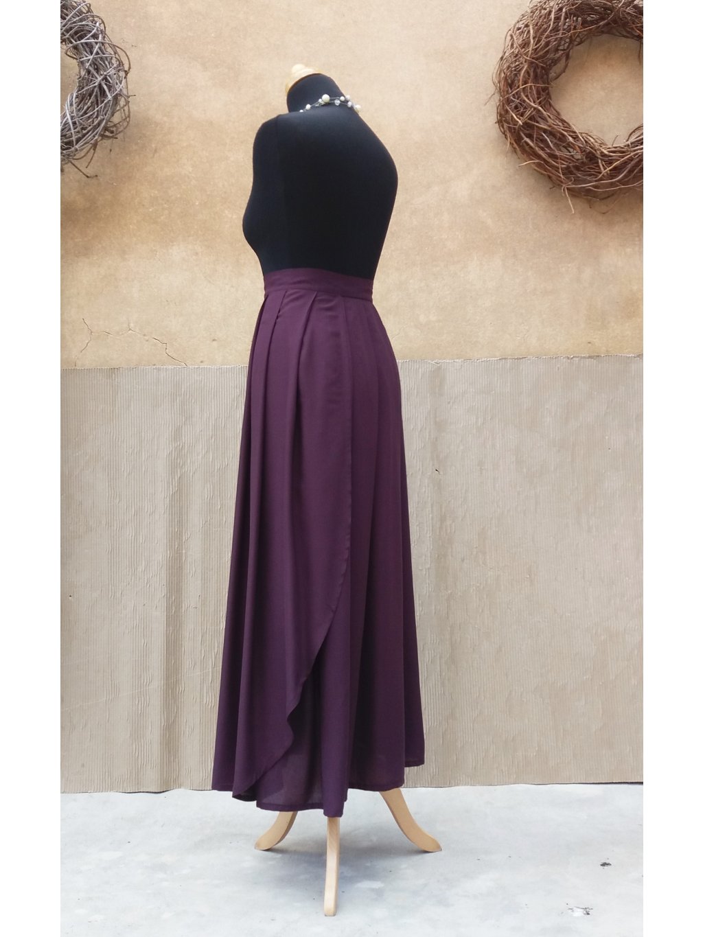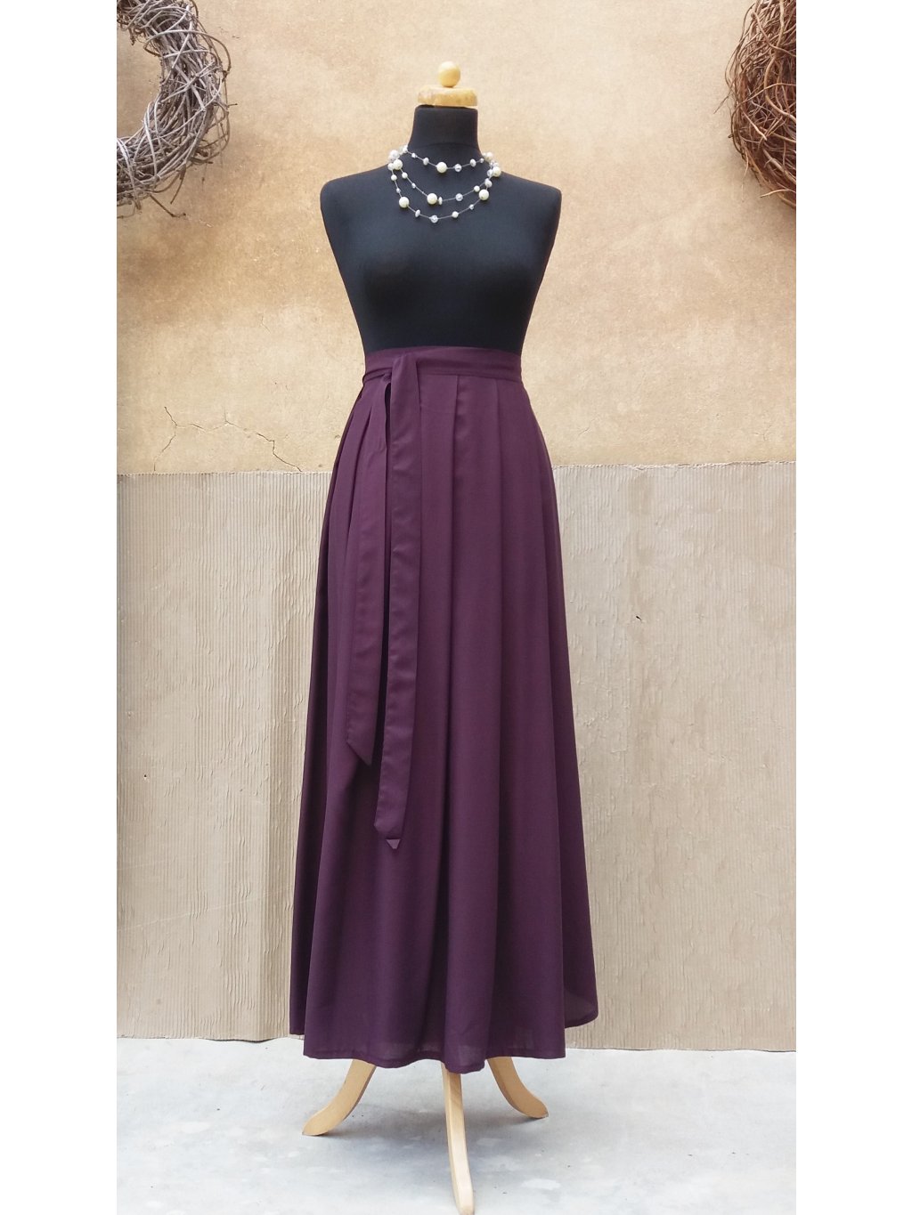 Dlouhá, zavinovací sukně ušitá z velmi jemné a hebké viskozy, barva hnědofialová. Materiál trochu prosvítá, látka je velmi příjemná na omak a dobře se nosí.