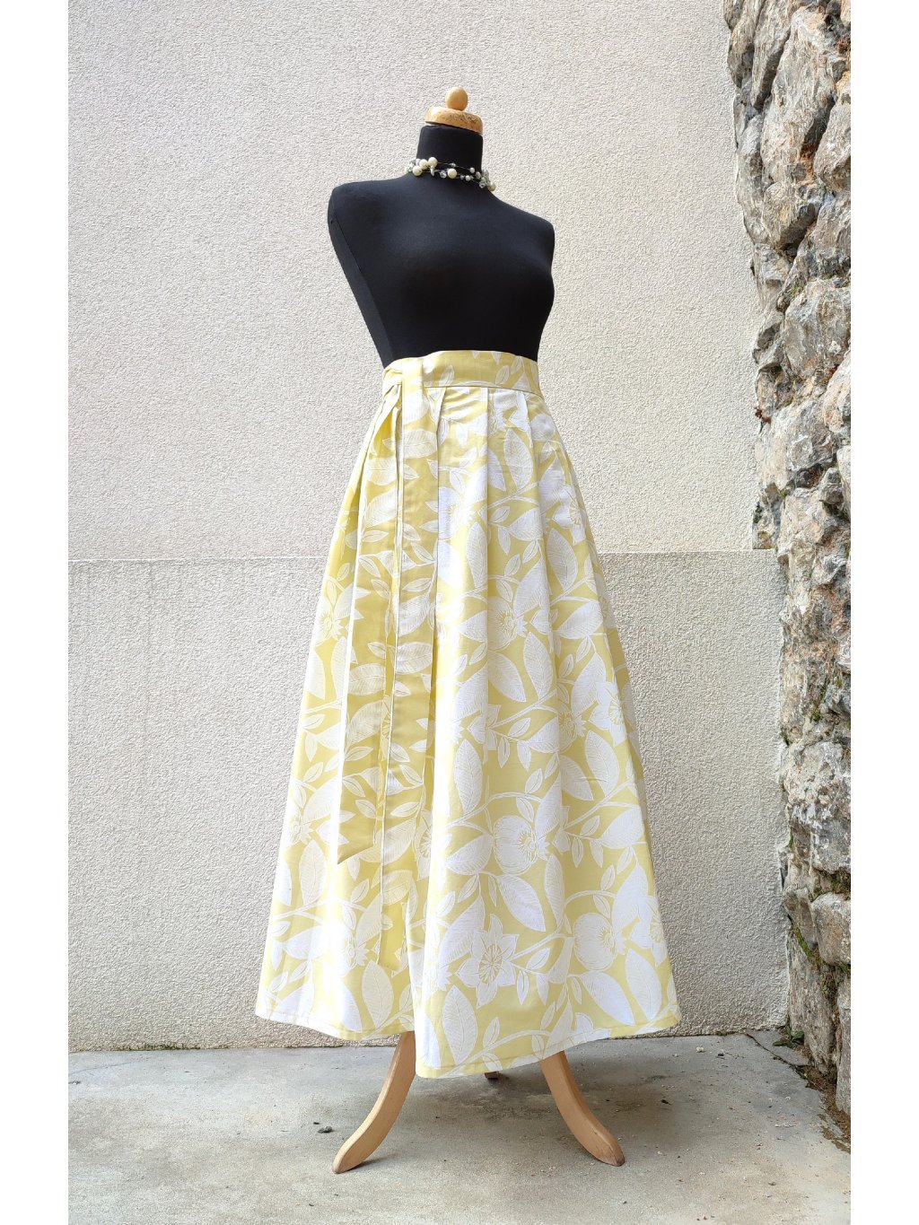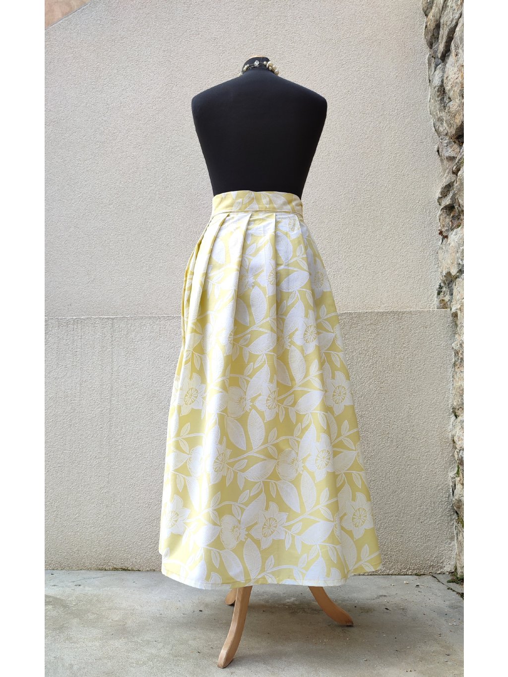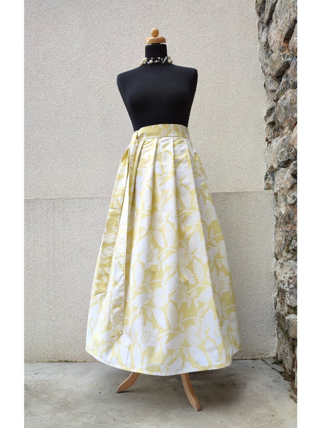 Zavinovací sukně ušitá z velmi pěkné látky. Kvalitní bavlna v jemně žlutém odstínu s tiskem bílých květů.
