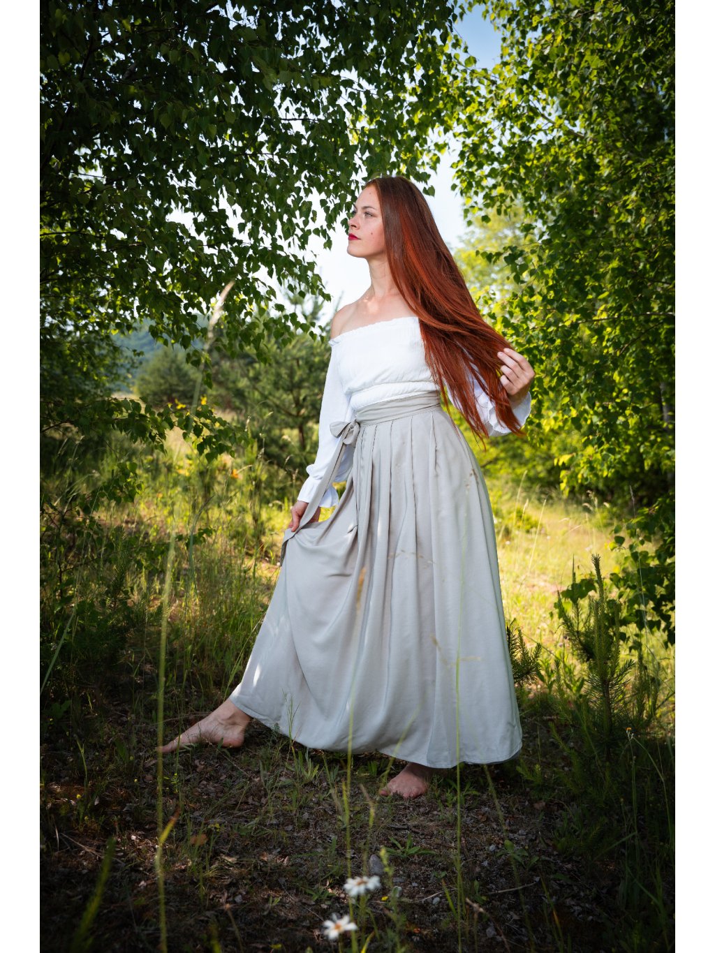 Dlouhá zavinovací sukně v barvě bílé kávy.