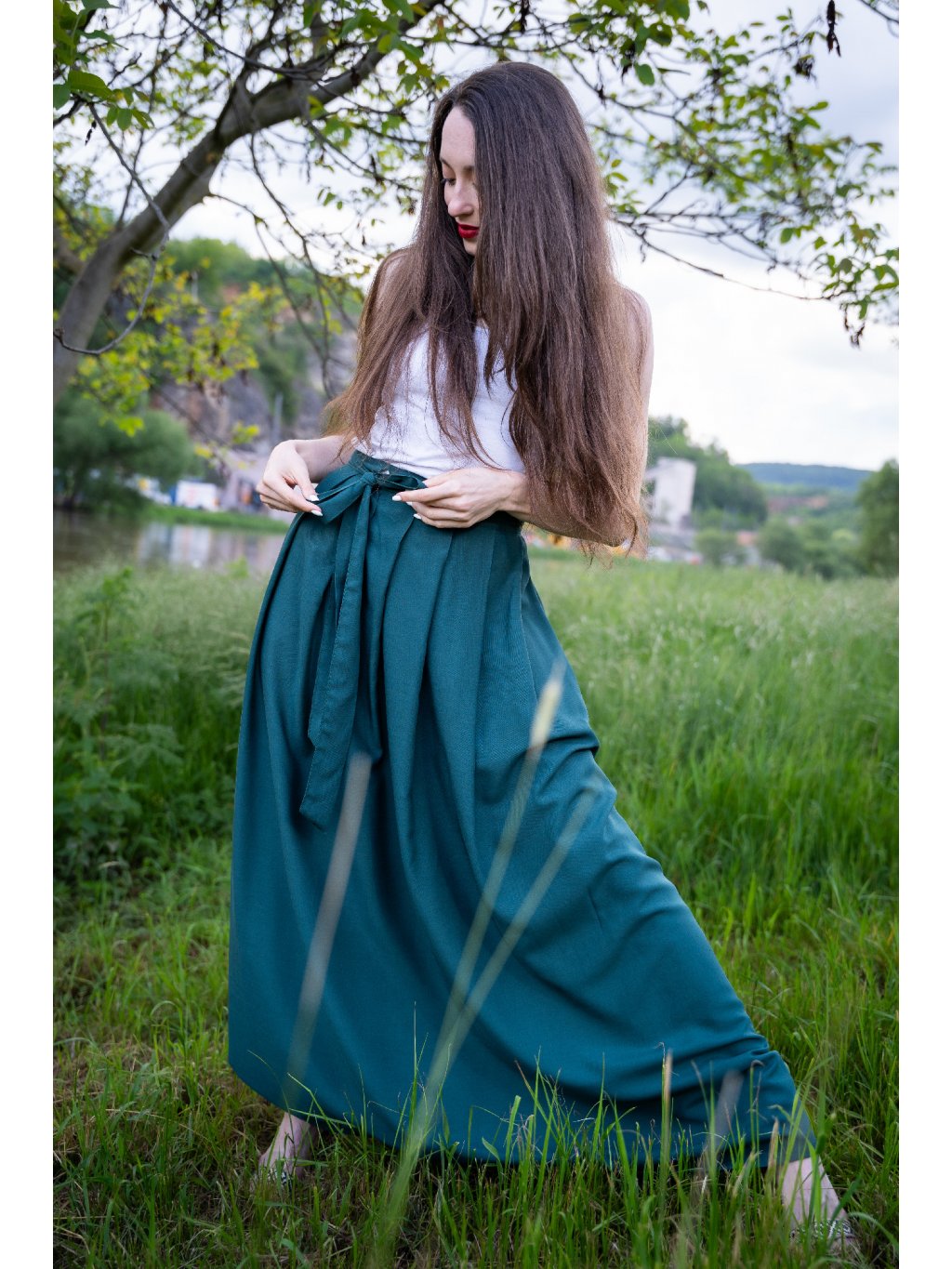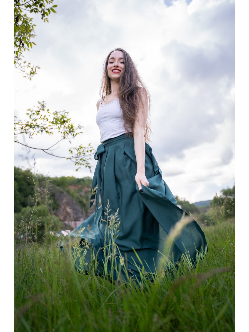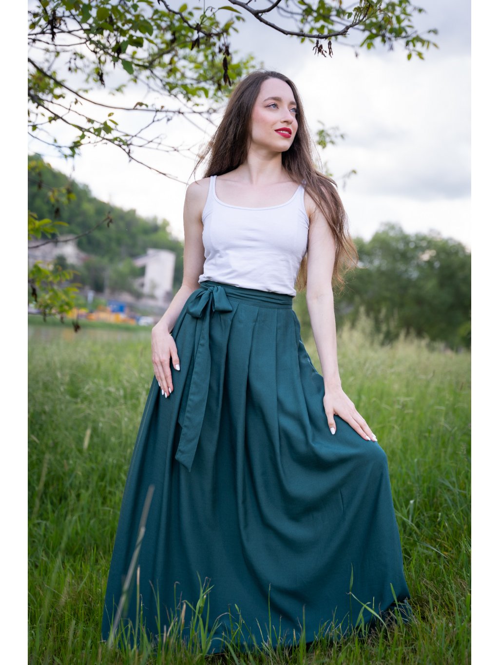 Smaragdová krása pro letní dny – dlouhá zavinovací sukně ušitá z jemné, splývavé viskózy, která pohladí při každém kroku.
