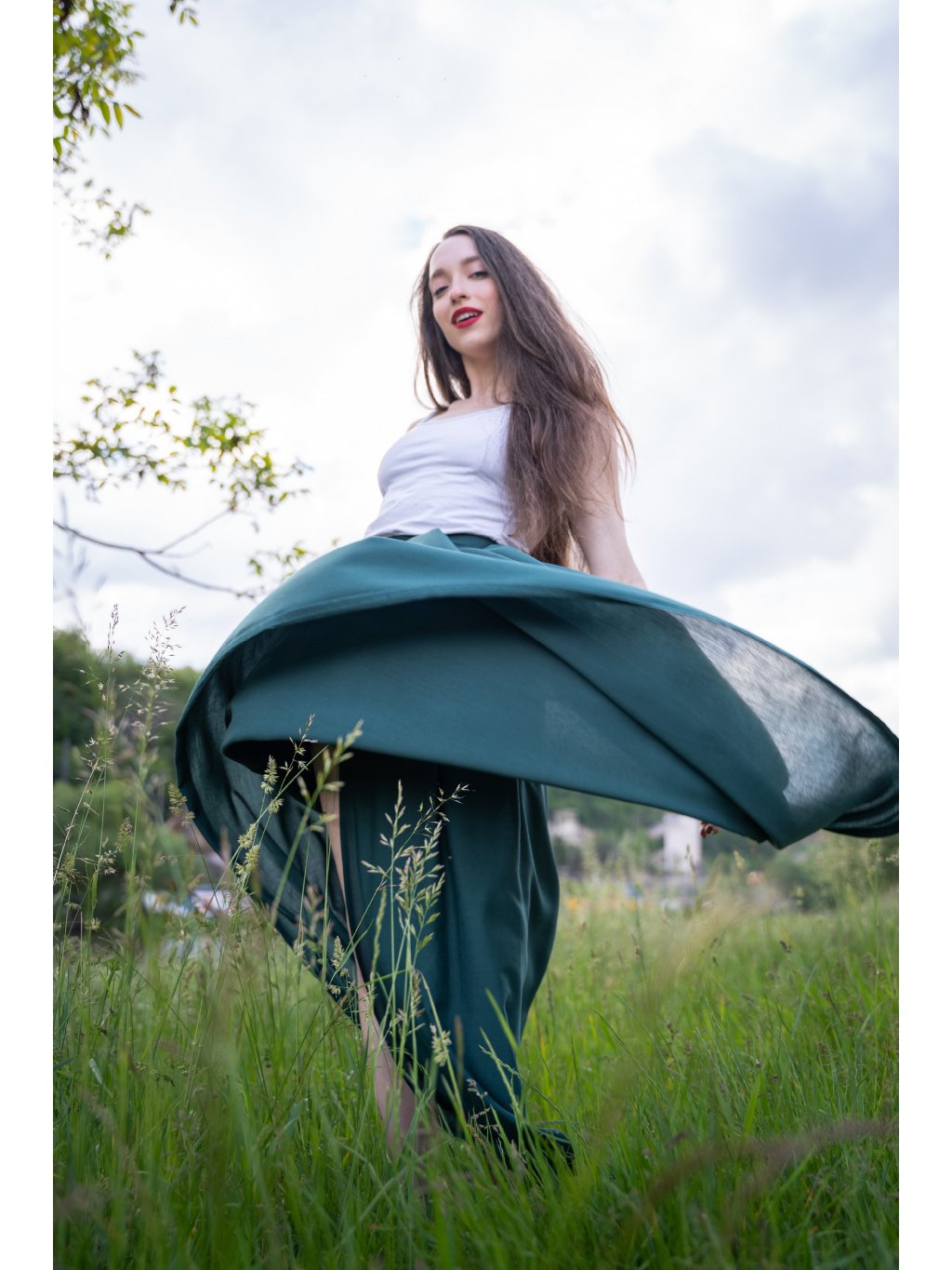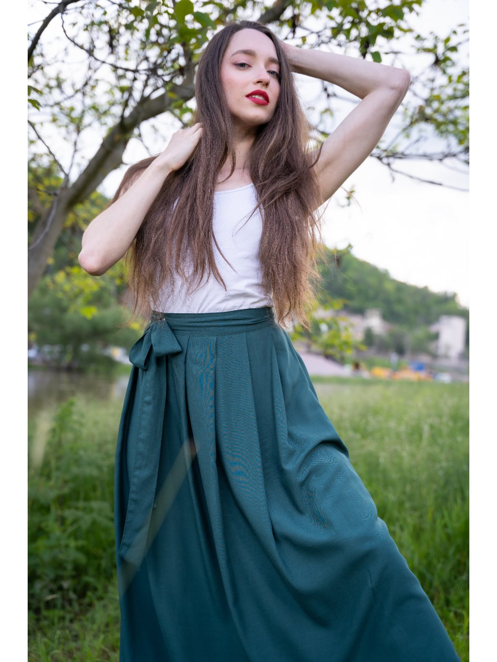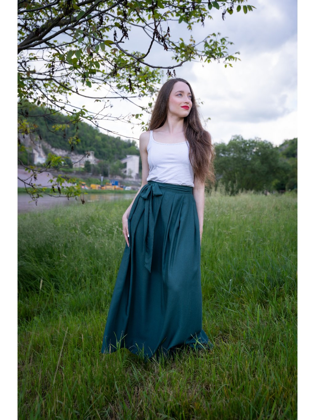 Smaragdová krása pro letní dny – dlouhá zavinovací sukně ušitá z jemné, splývavé viskózy, která pohladí při každém kroku.
