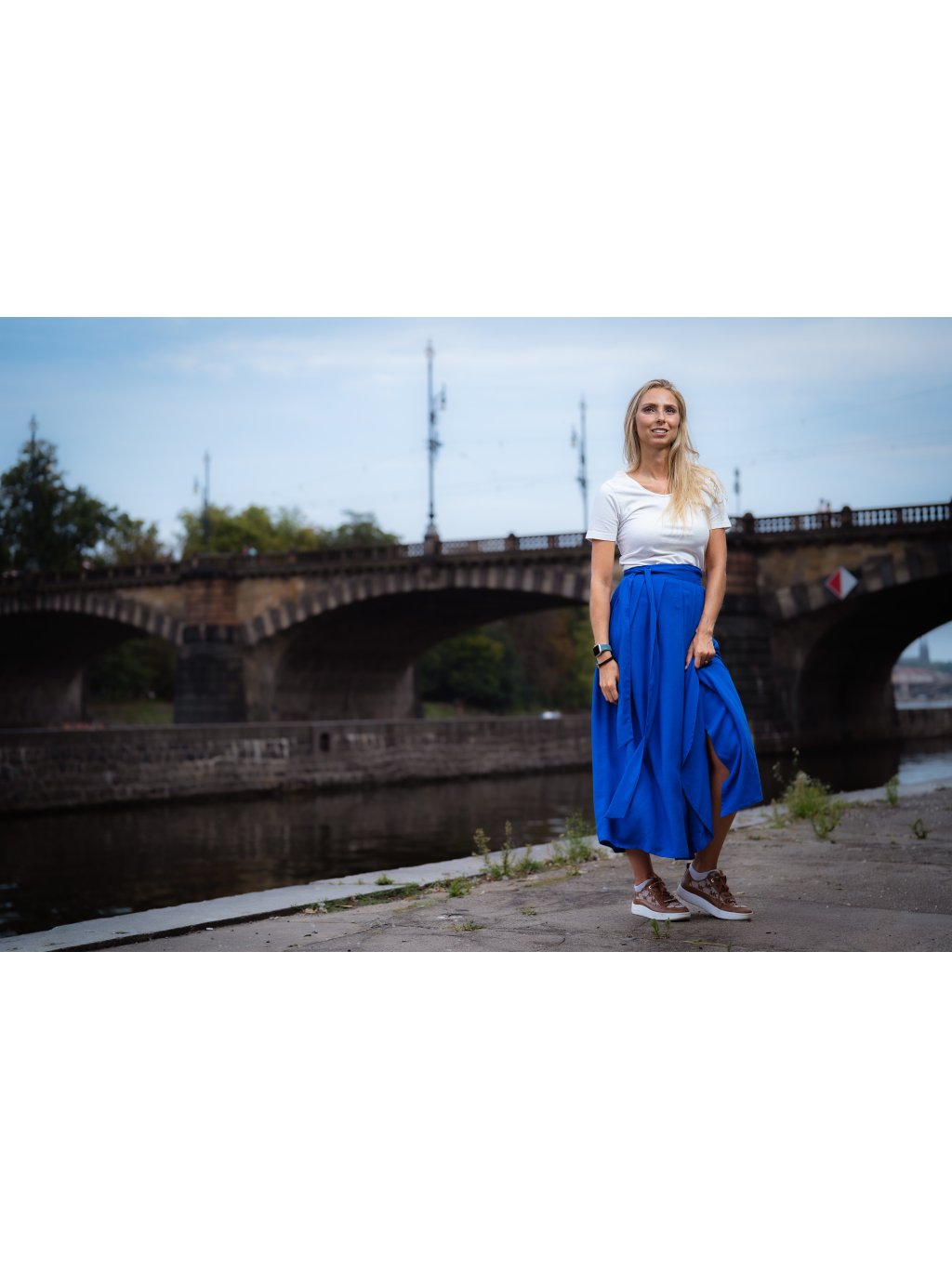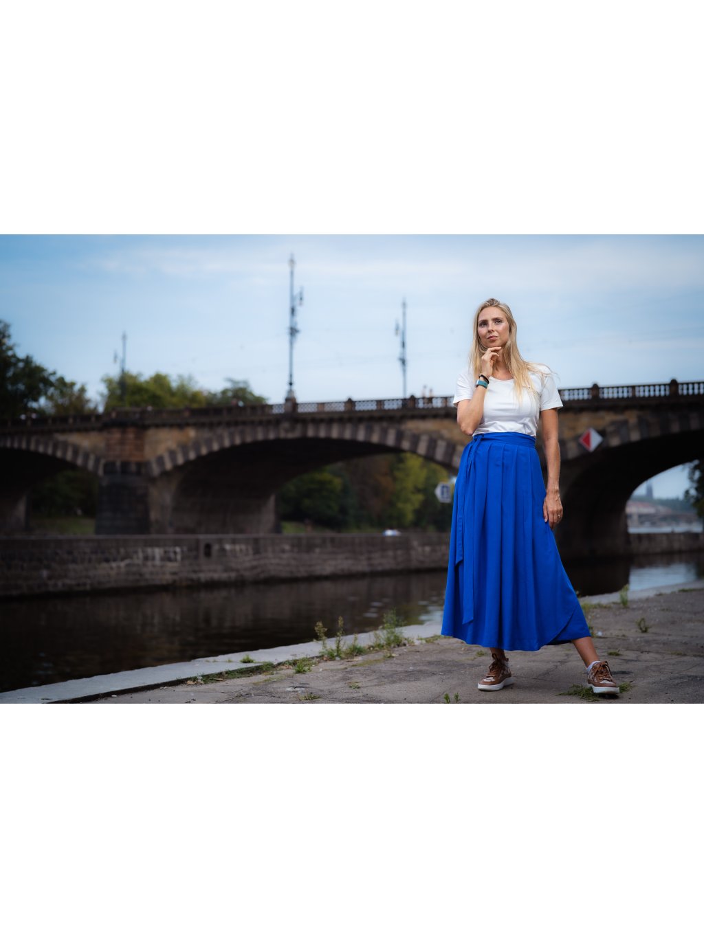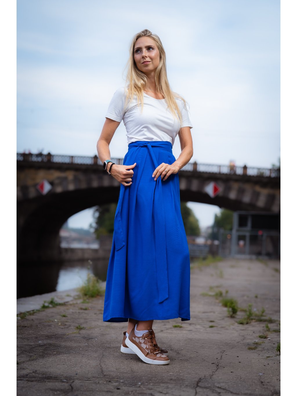 Zavinovací sukně v královské modři – lehká jako letní vánek, jemná jako dotek hedvábí.