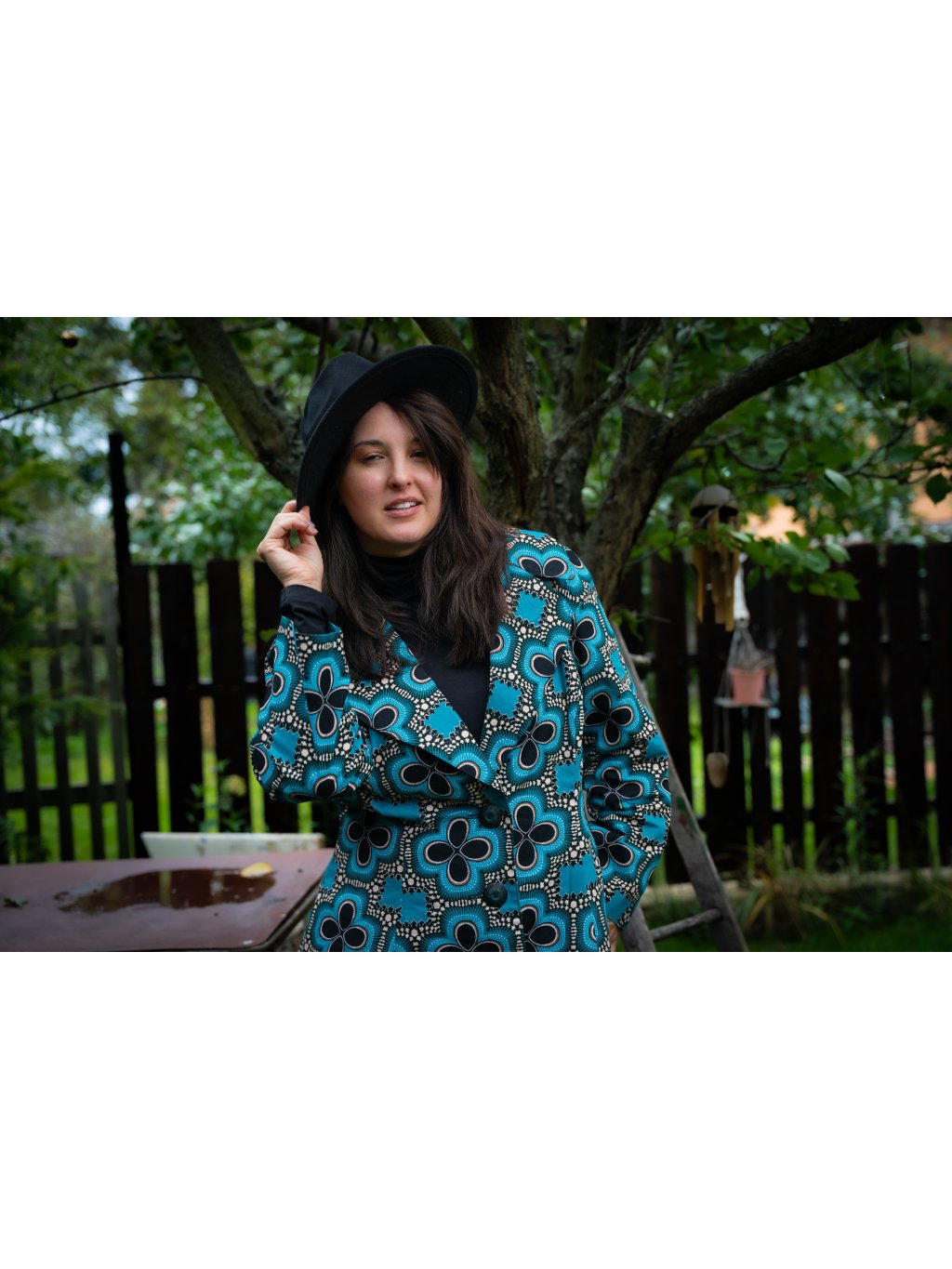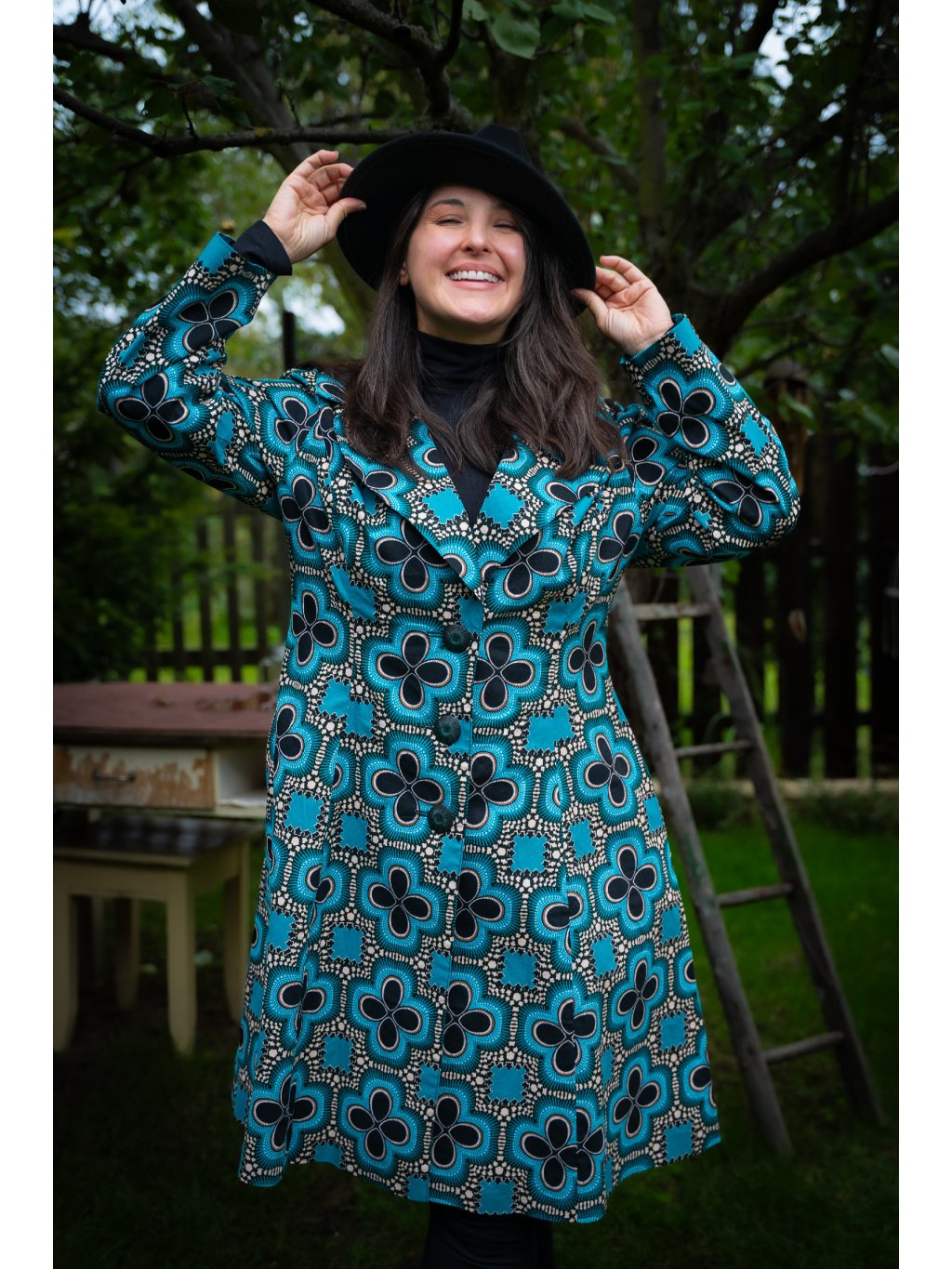 Kabátek ušitý z pevné, sytě tyrkysové látky (barva na fotkách zkresluje) s černými čtyrlístky.