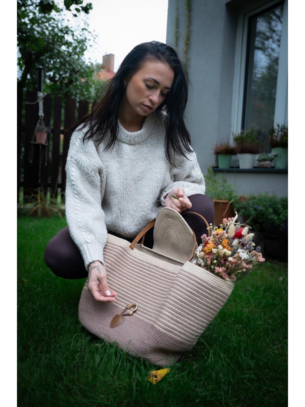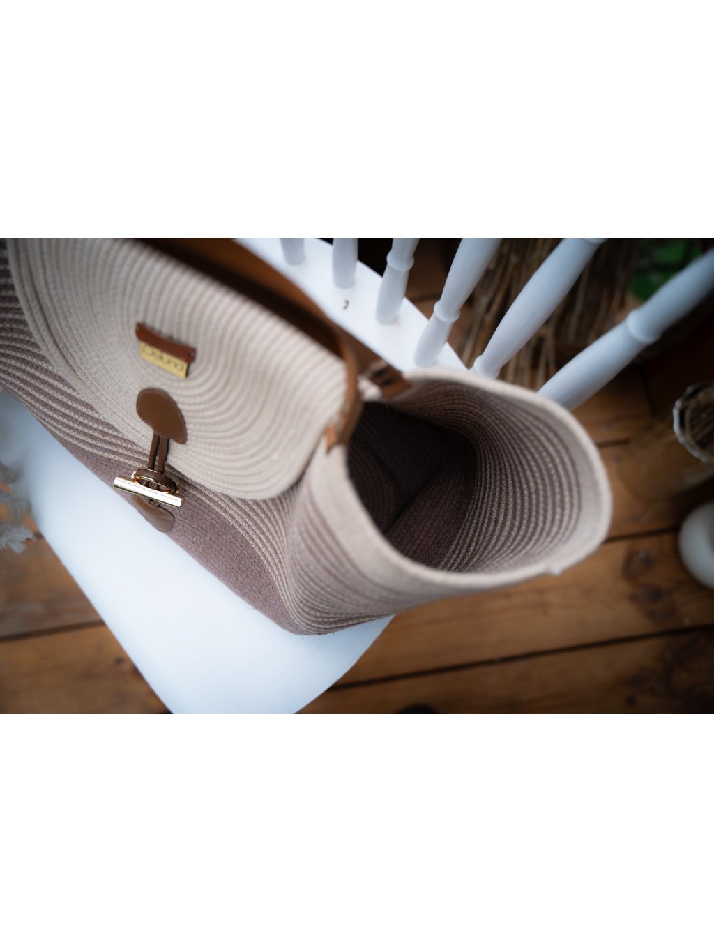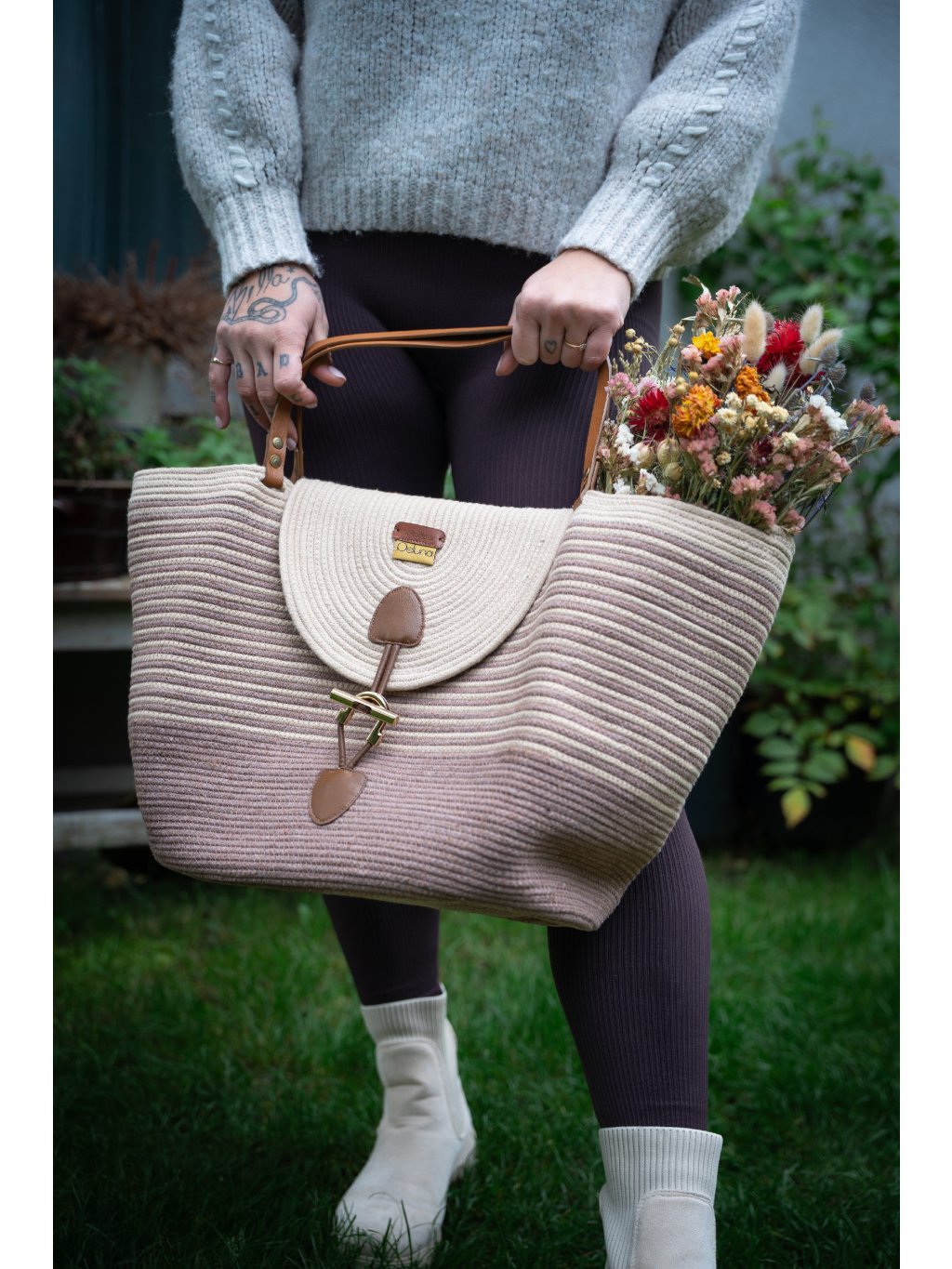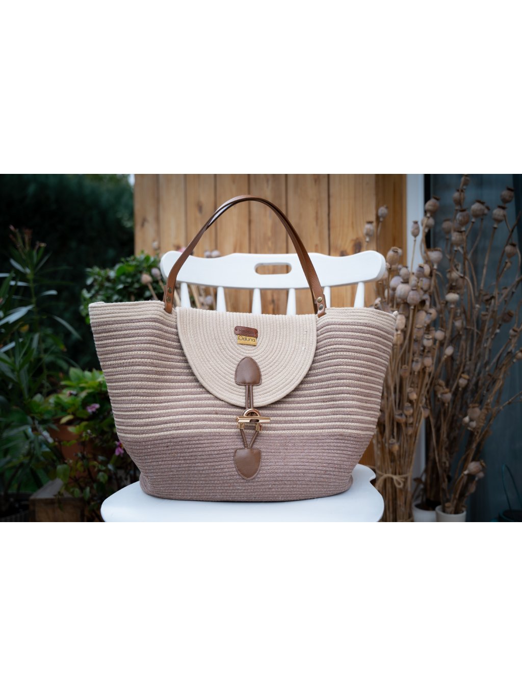 Tato elegantní kabelka Elegance je ručně ušitá z recyklované bavlněné šňůrky na šicím stroji pomocí cik cak stehu, který zajišťuje vysokou pružnost, pevnost a odolnost proti třepení okrajů, což prodlužuje životnost výrobku a umožňuje rychlejší a efektivnější výrobu.