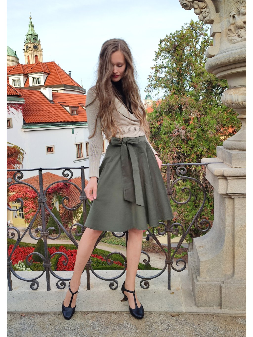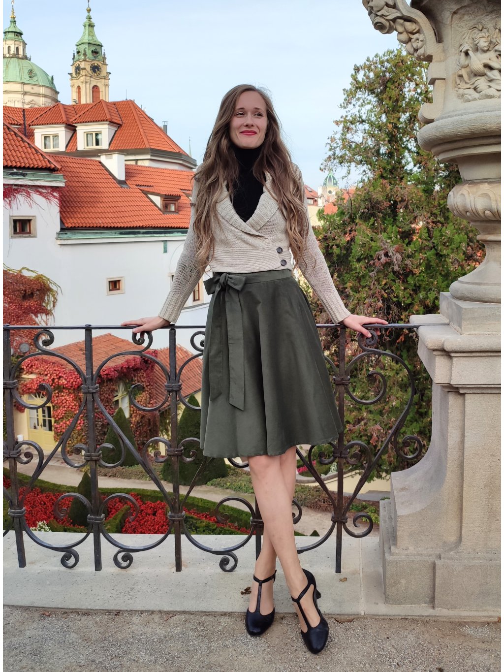 Elegantní zavinovací kolová sukně ušitá ze slabšího manšestru v krásném khaki odstínu.