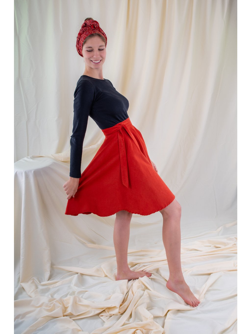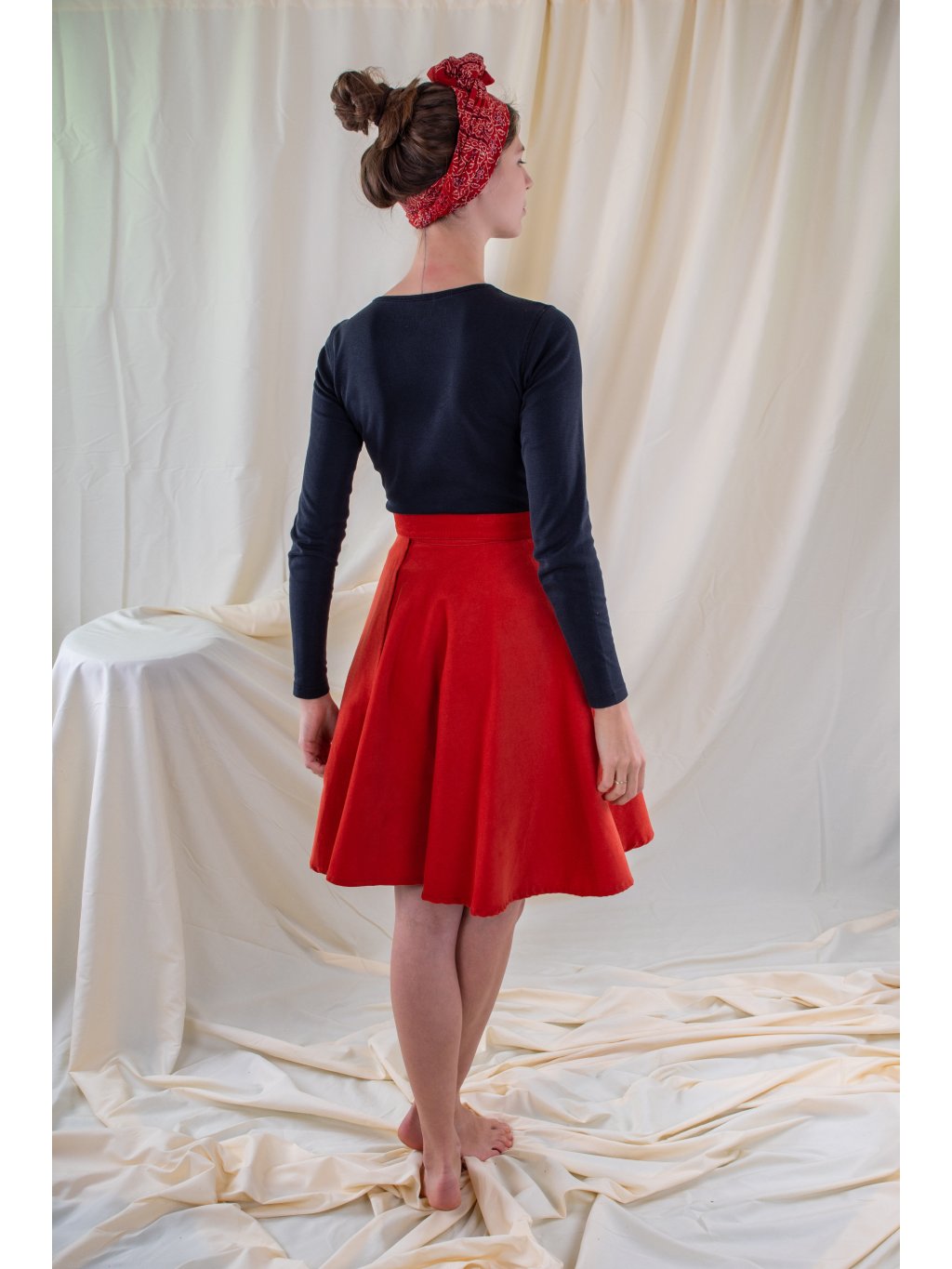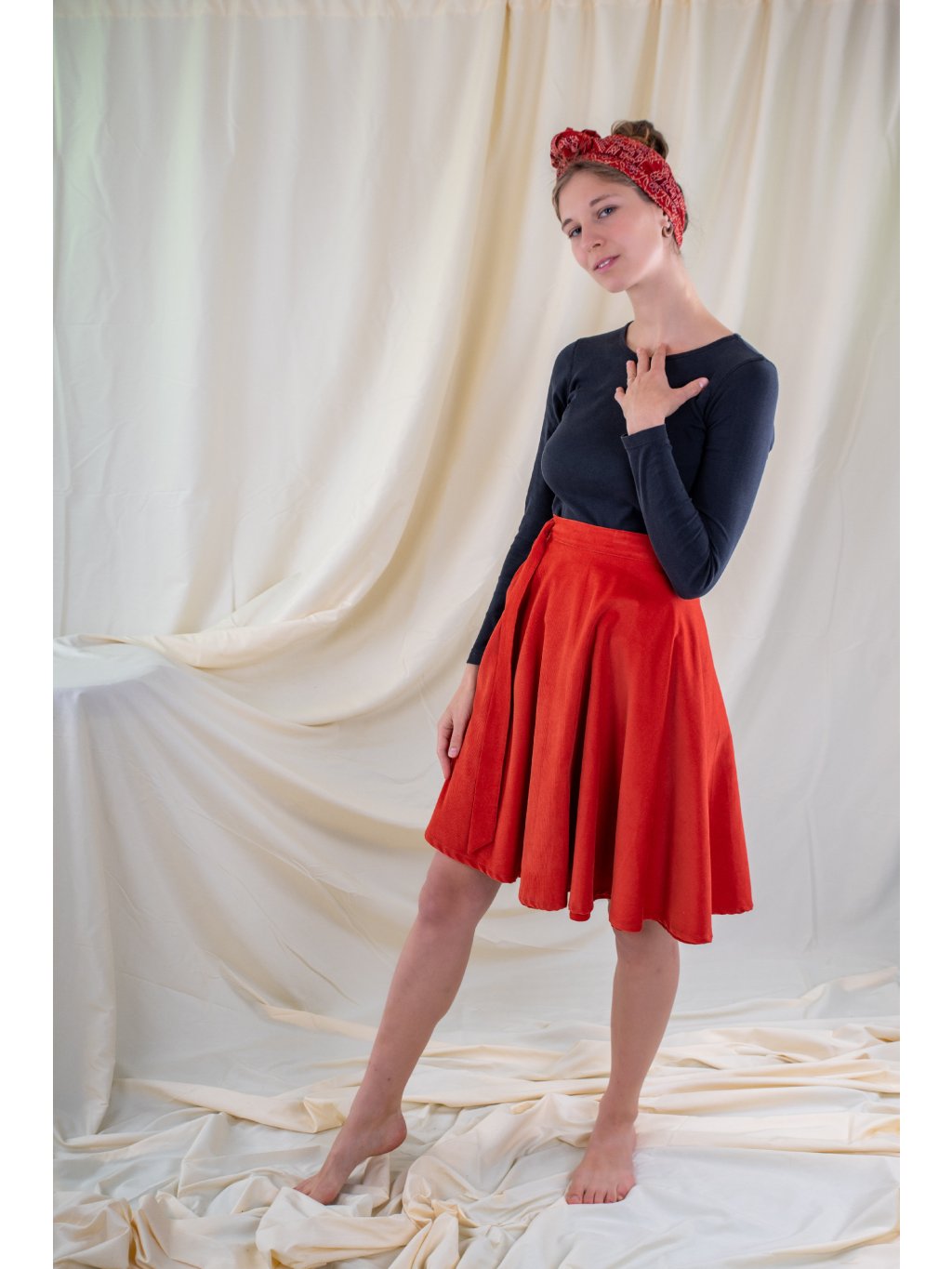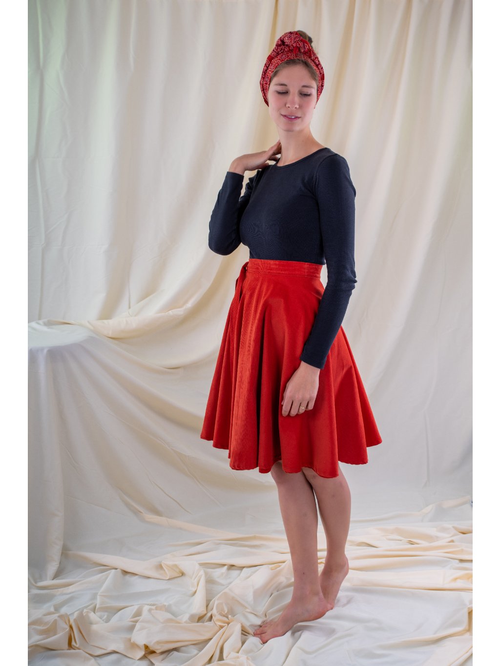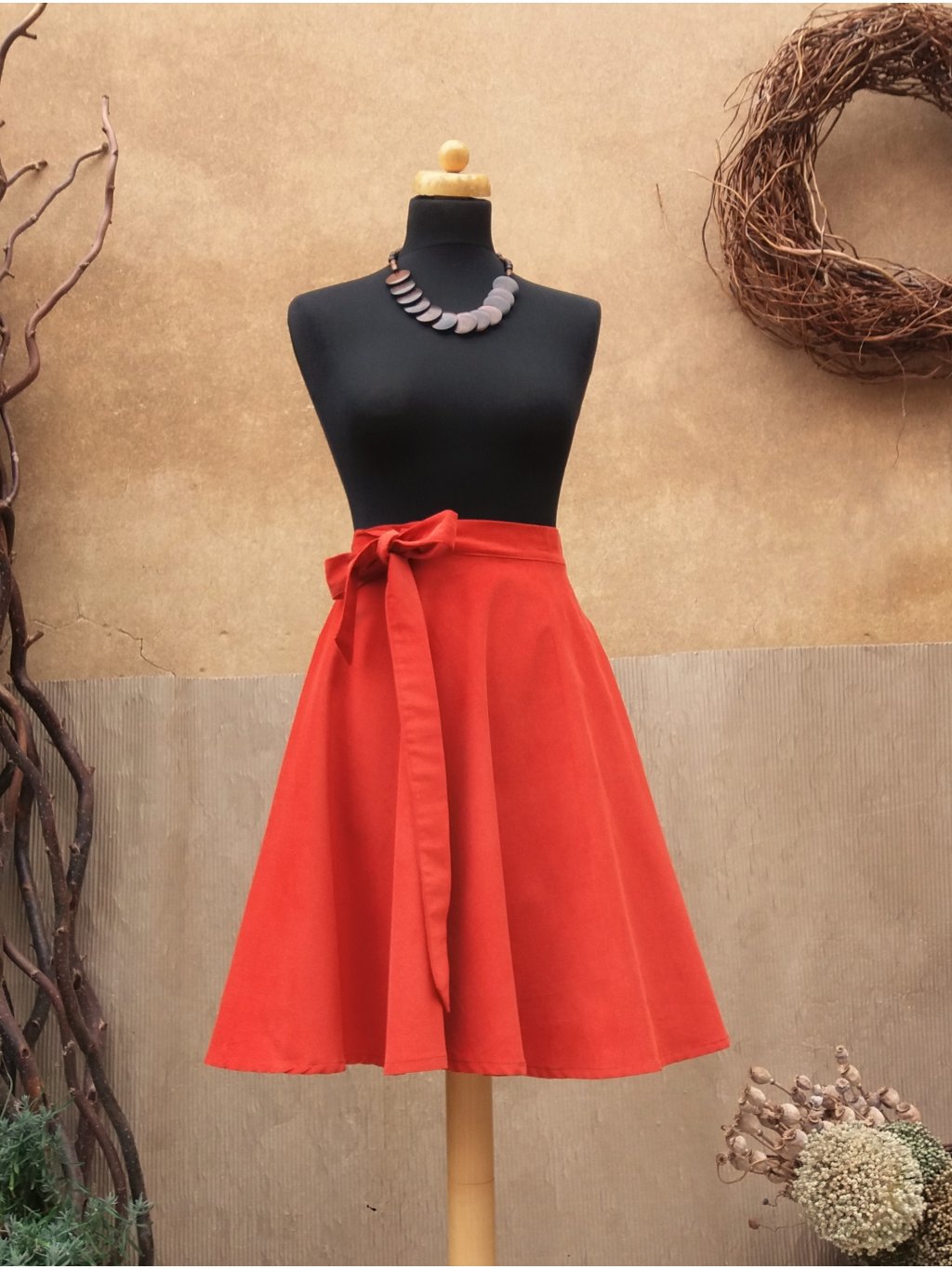 Zavinovací, kolová sukně ušitá ze slabšího manšestru v zemité, zrzavé barvě.