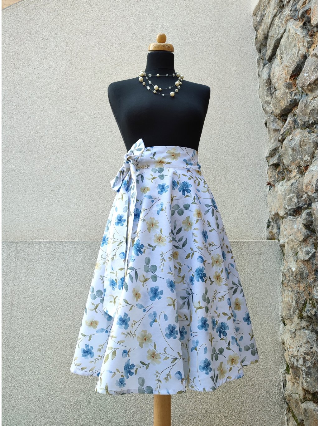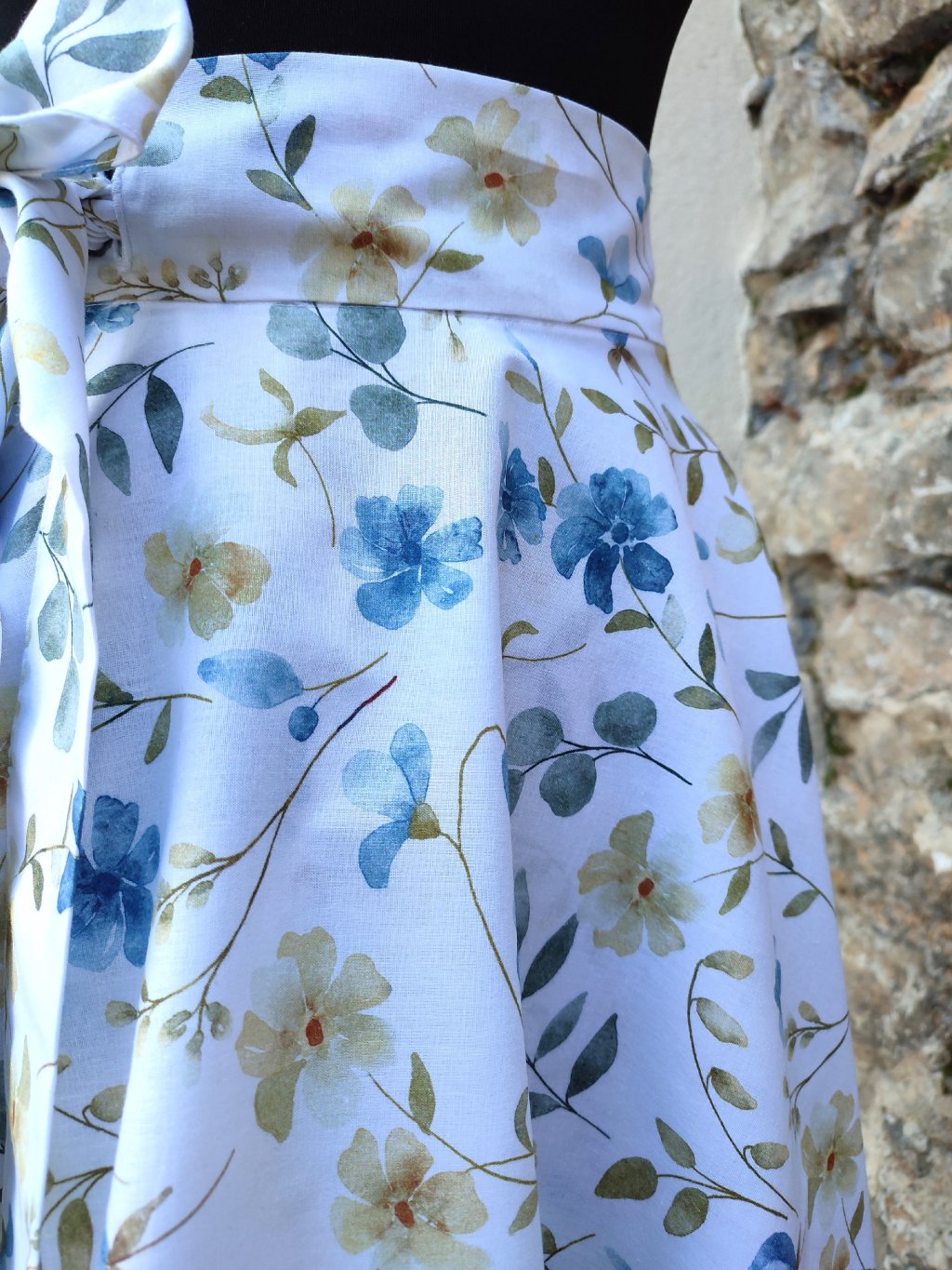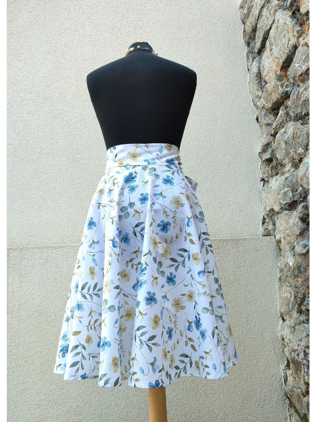 Zavinovací sukně kolového střihu, 100% jemná bavlna s akvarelovým potiskem květů.