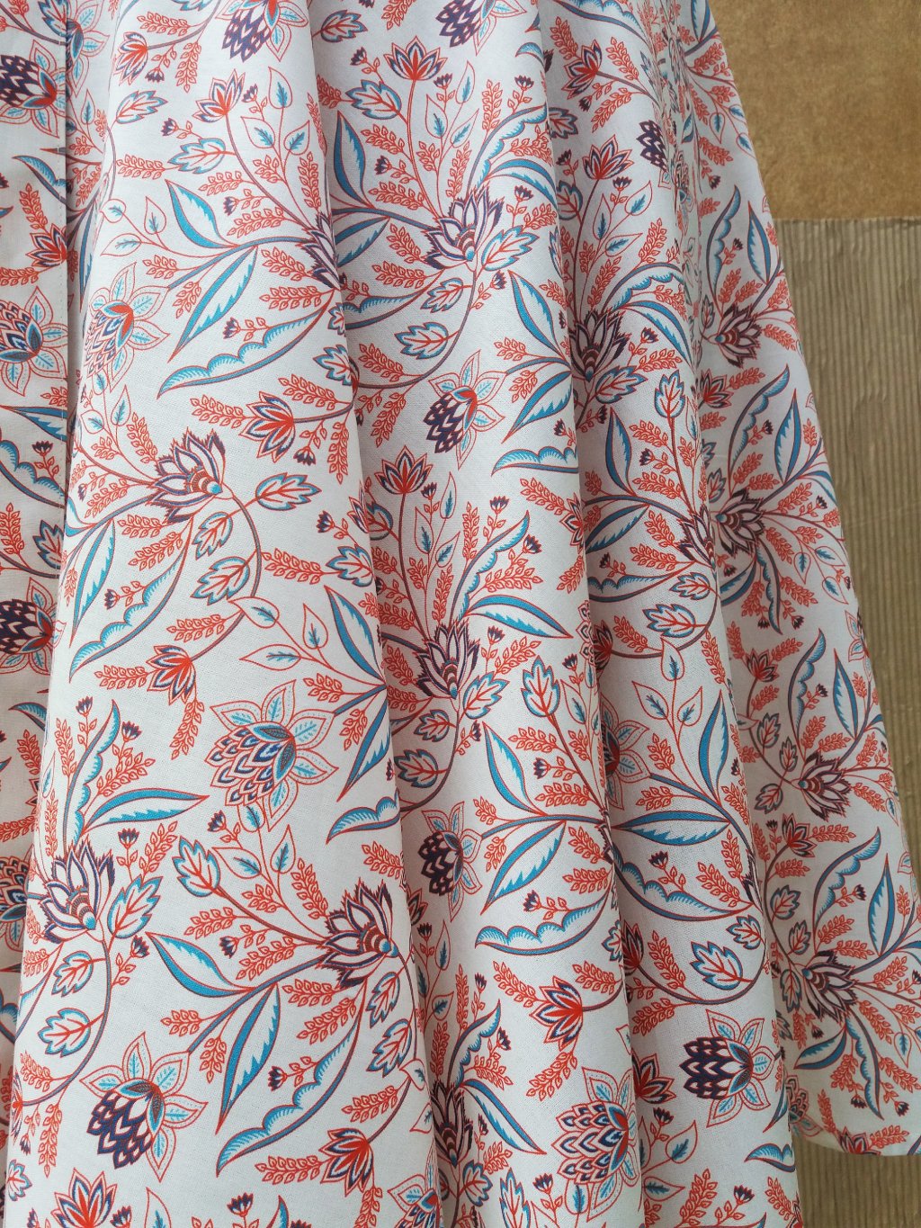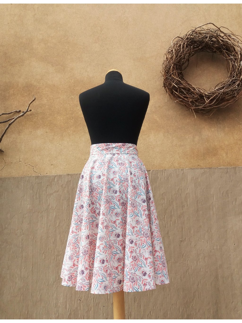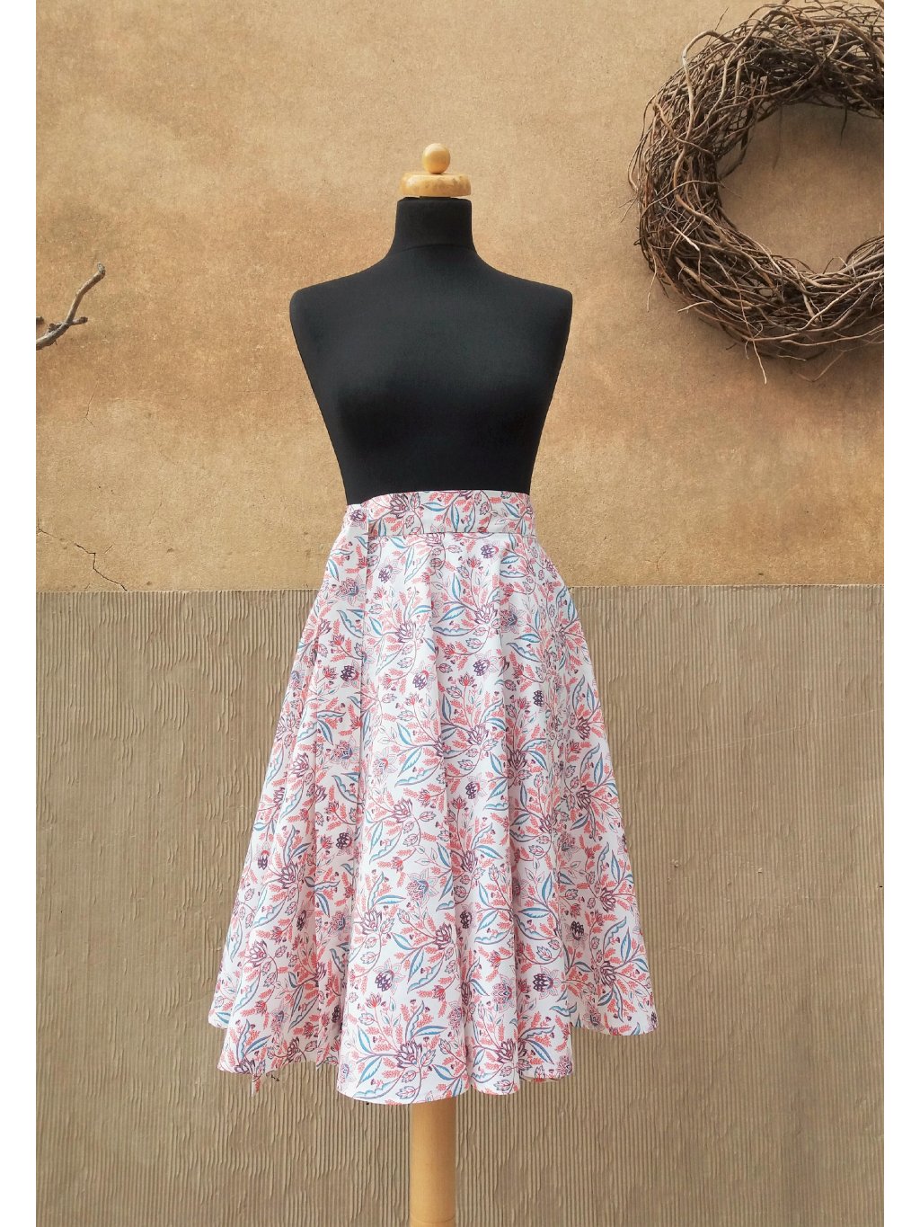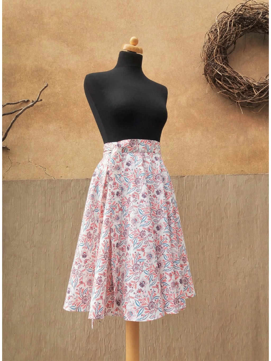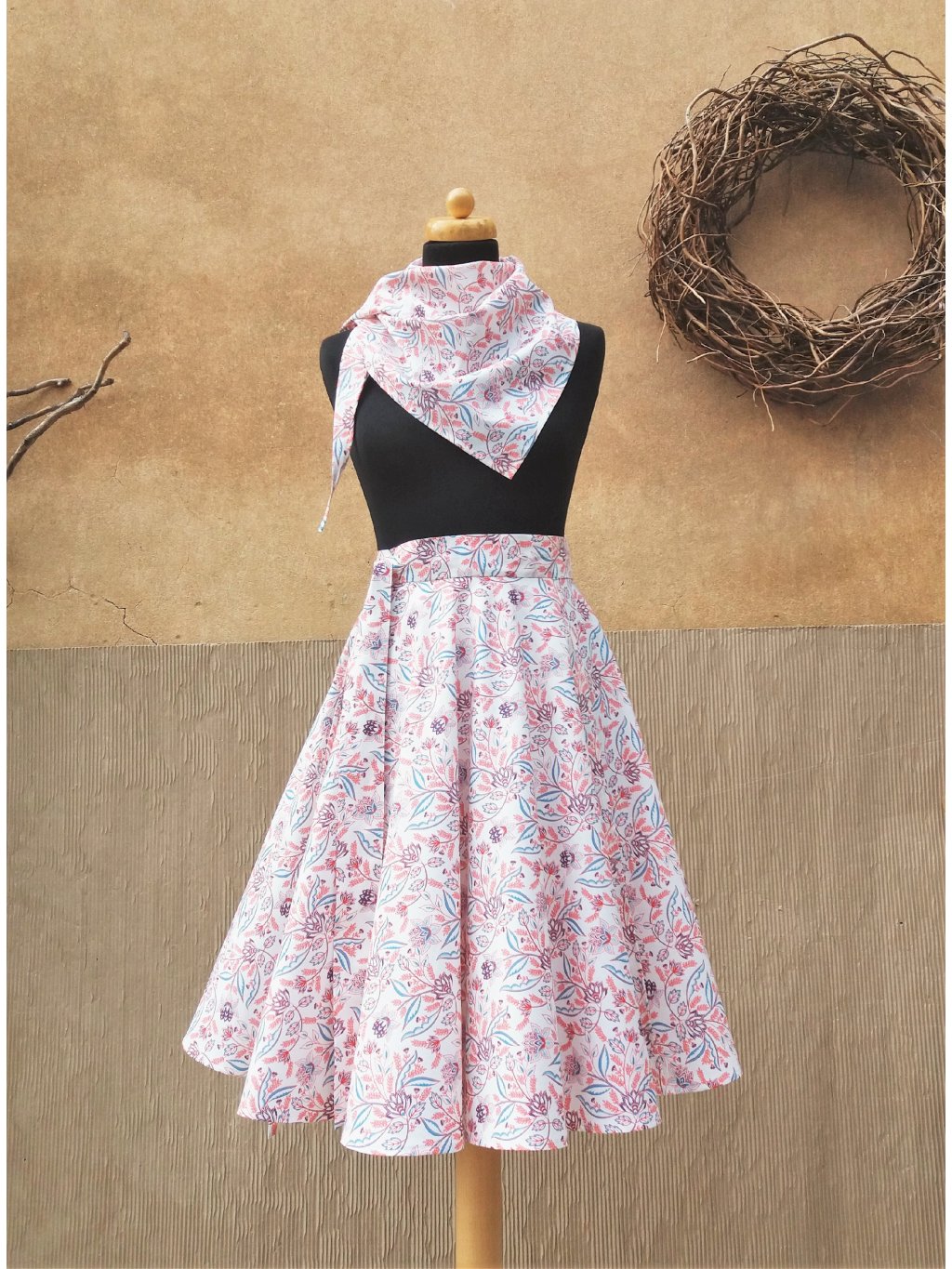 Jemná zavinovací sukně kolového střihu, 100% příjemná bavlna, podklad bílá káva s potiskem kvítků.