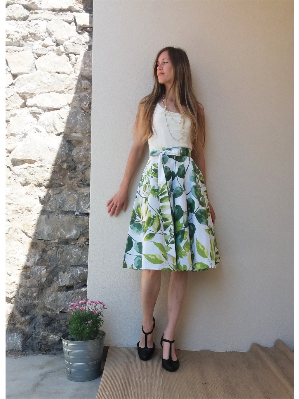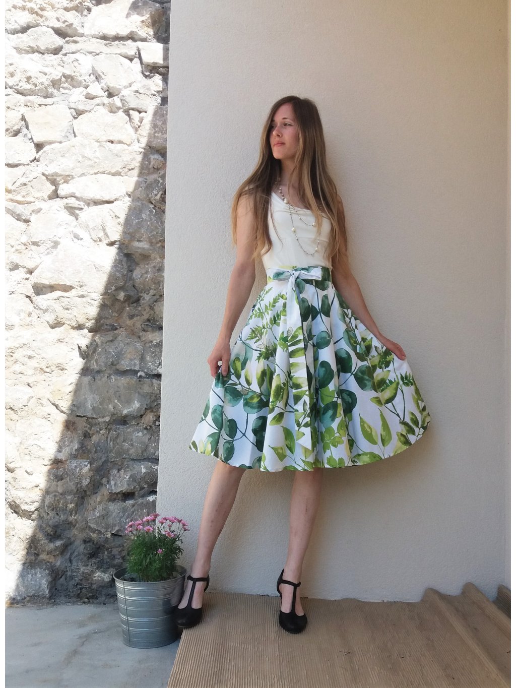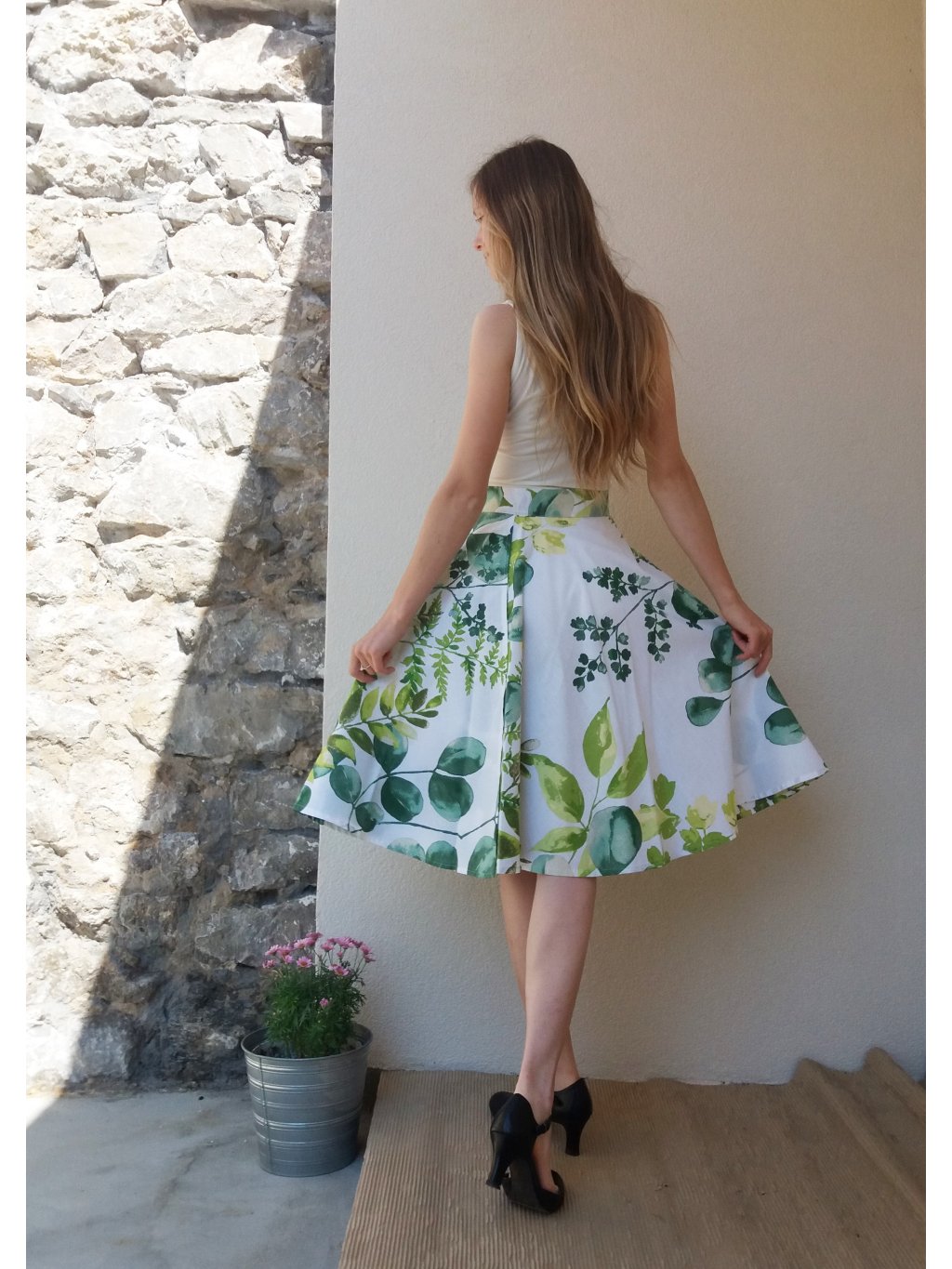 Kolová sukně - akvarel zelené listy