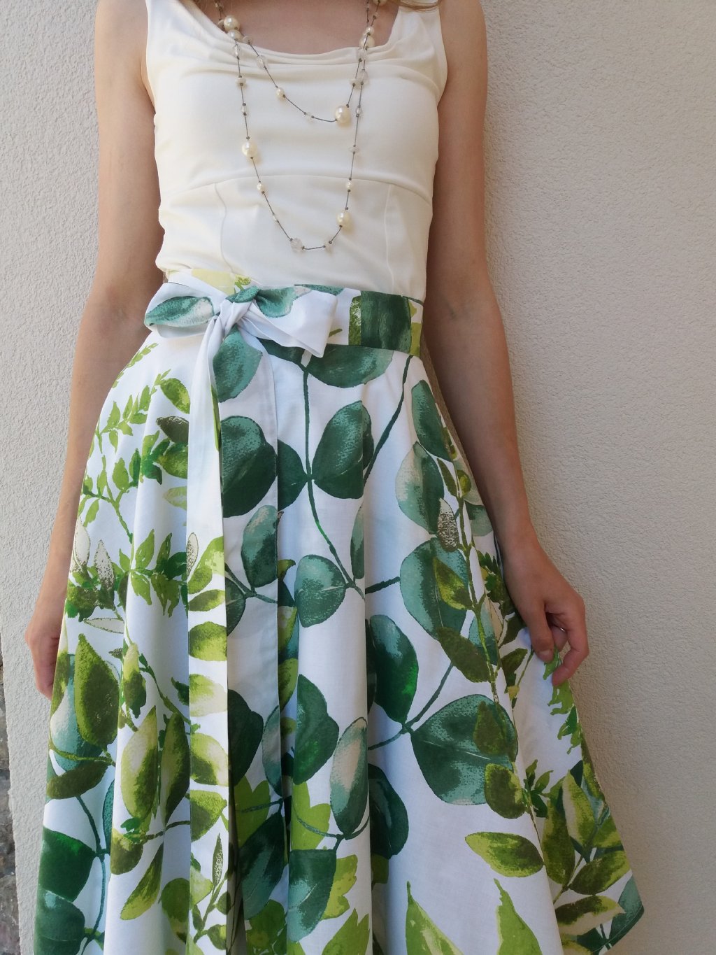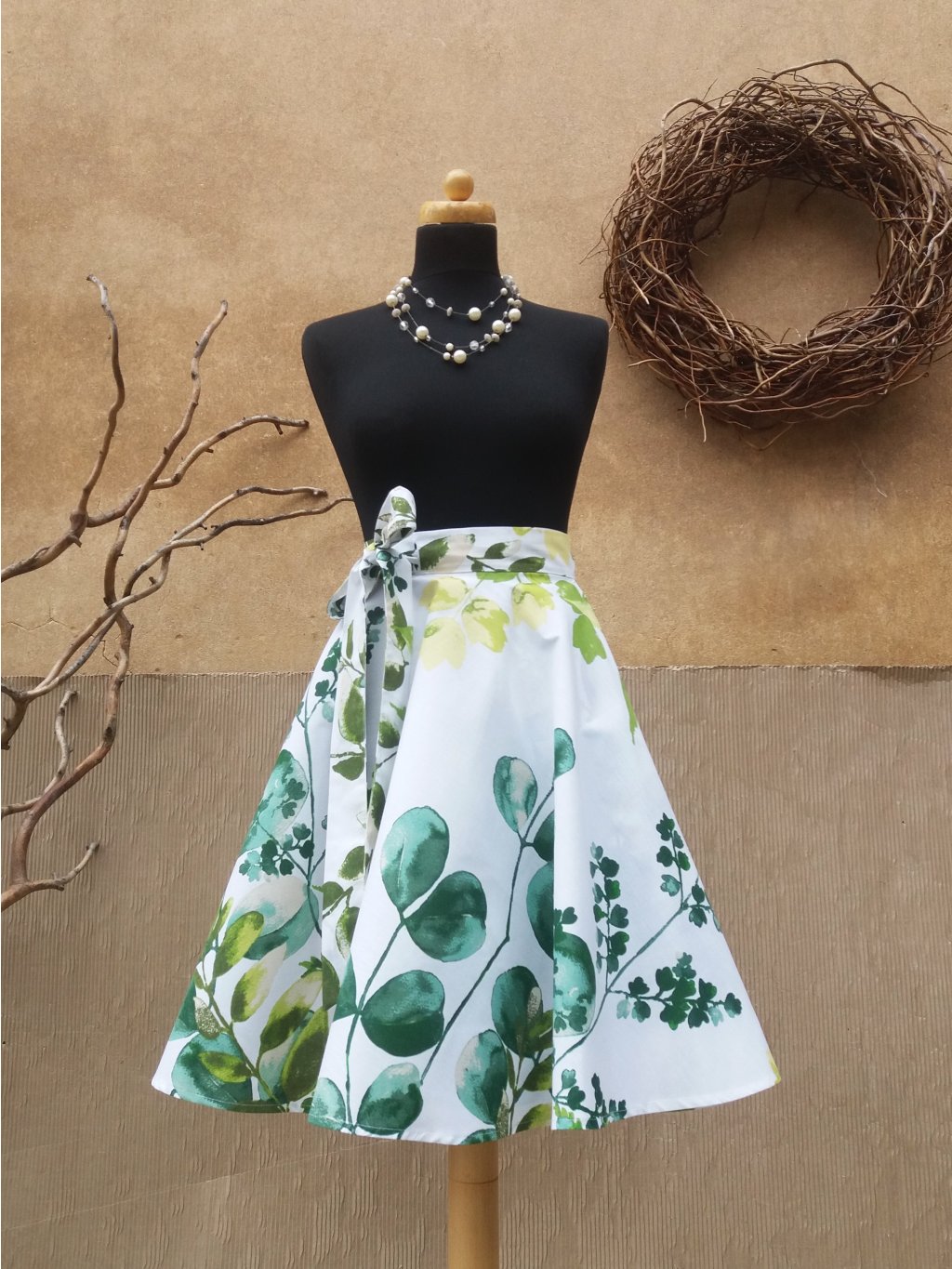 Zavinovací sukně kolového střihu, 100% bavlna s akvarelovým potiskem zelených listů. Krásná látka.