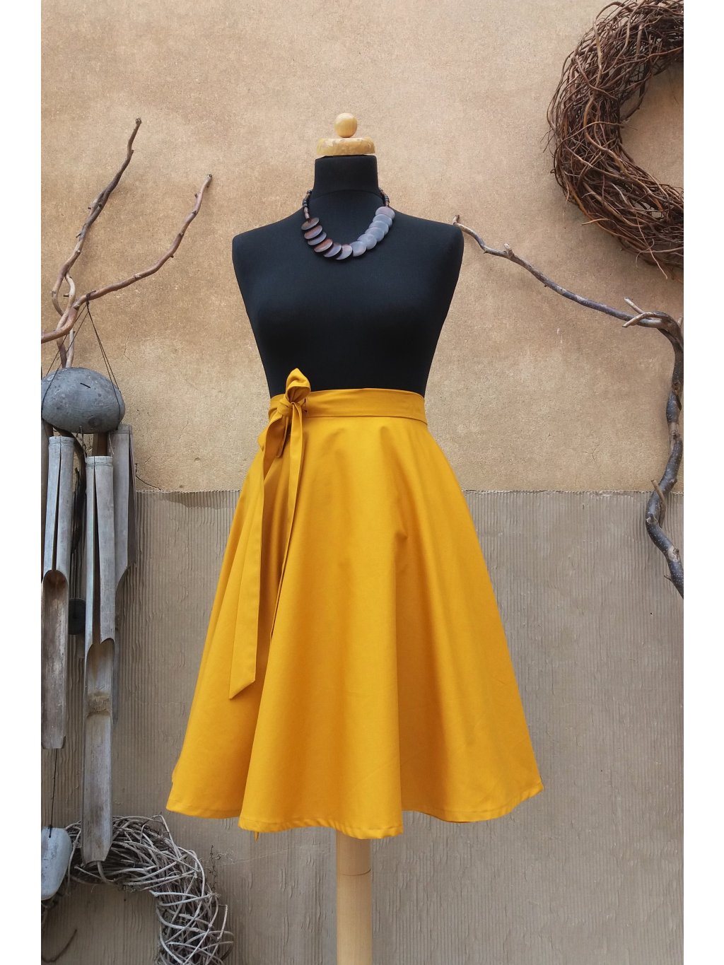 Zavinovací sukně kolového střihu v barvě hořčice.