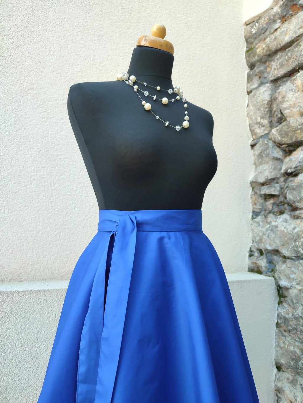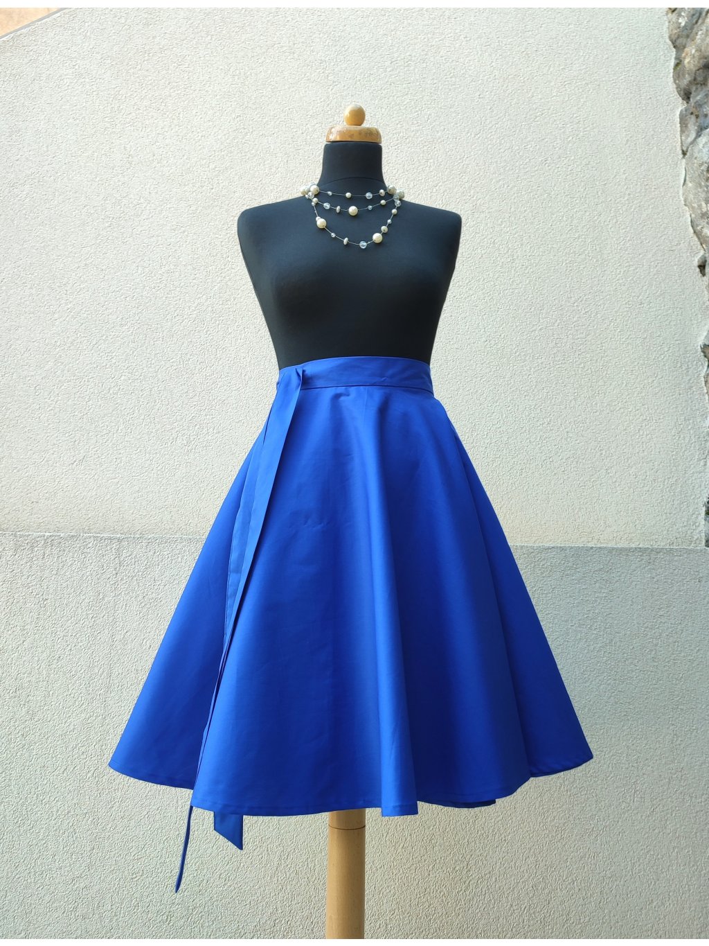 Zavinovací sukně kolového střihu v modré barvě.