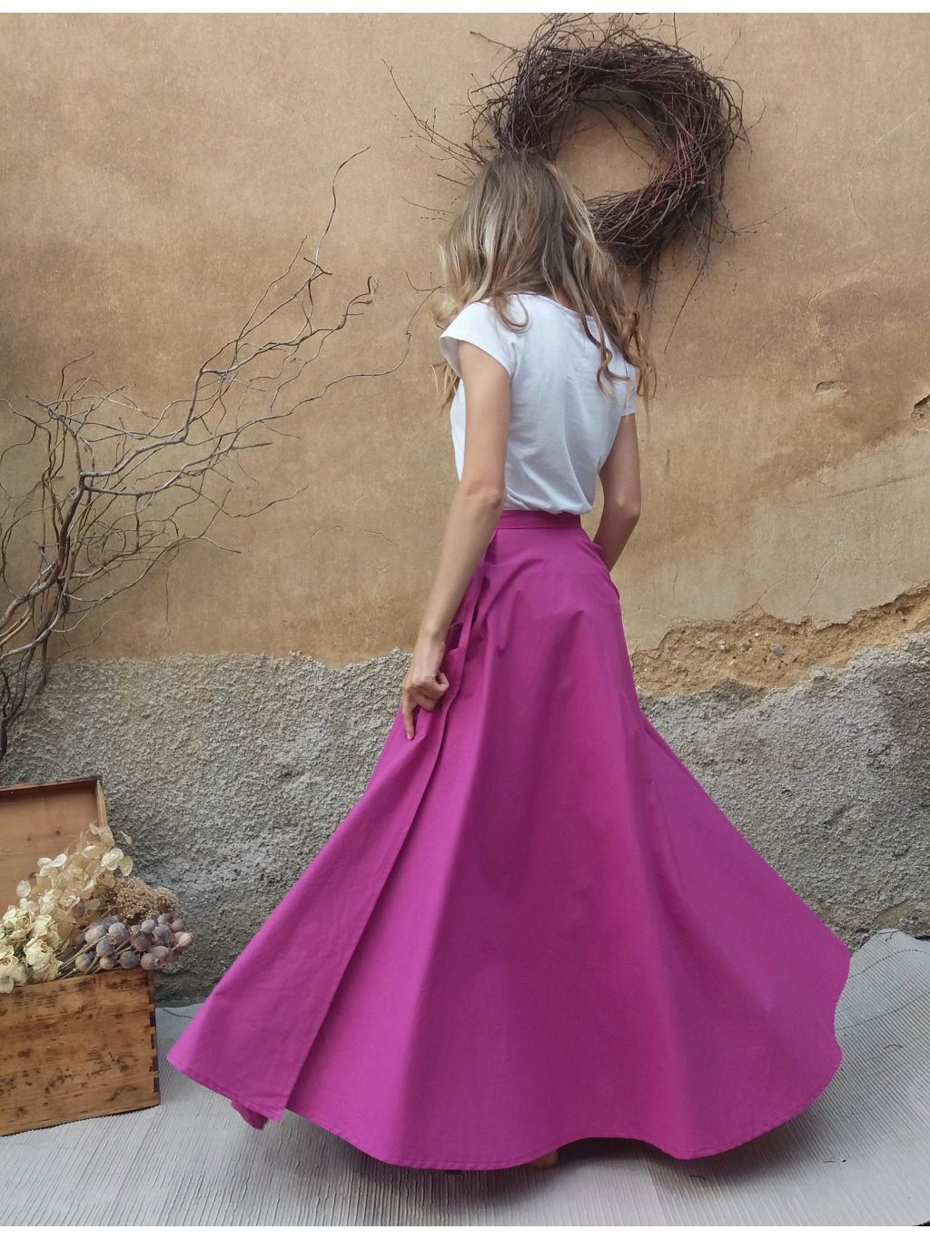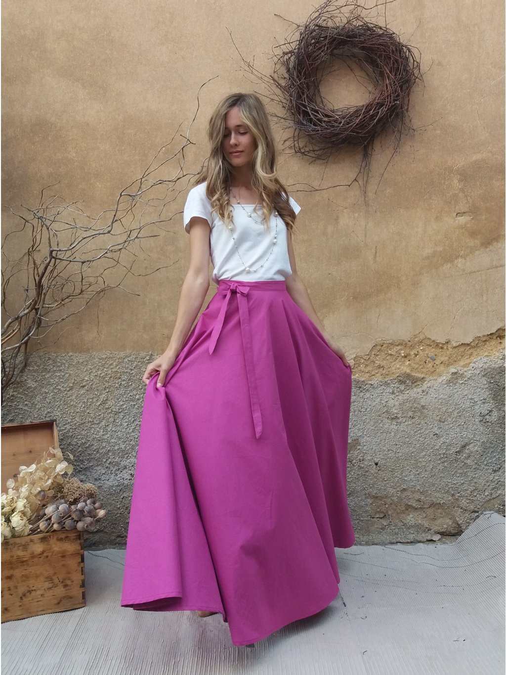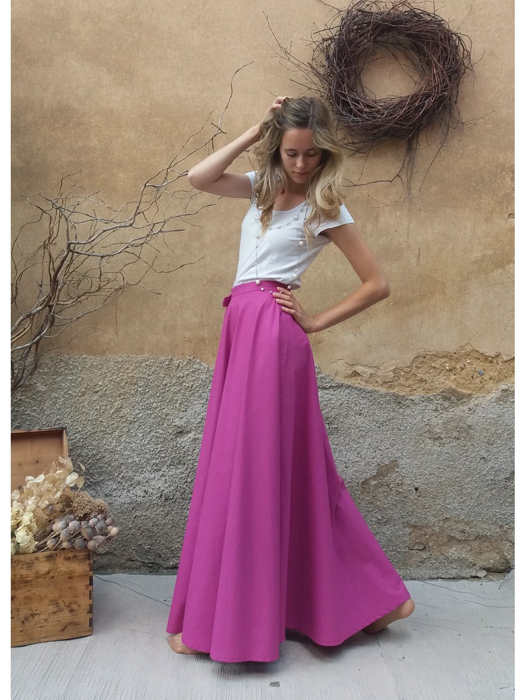 Dlouhá, zavinovací sukně kolového střihu, ušitá ze dvou dílů.