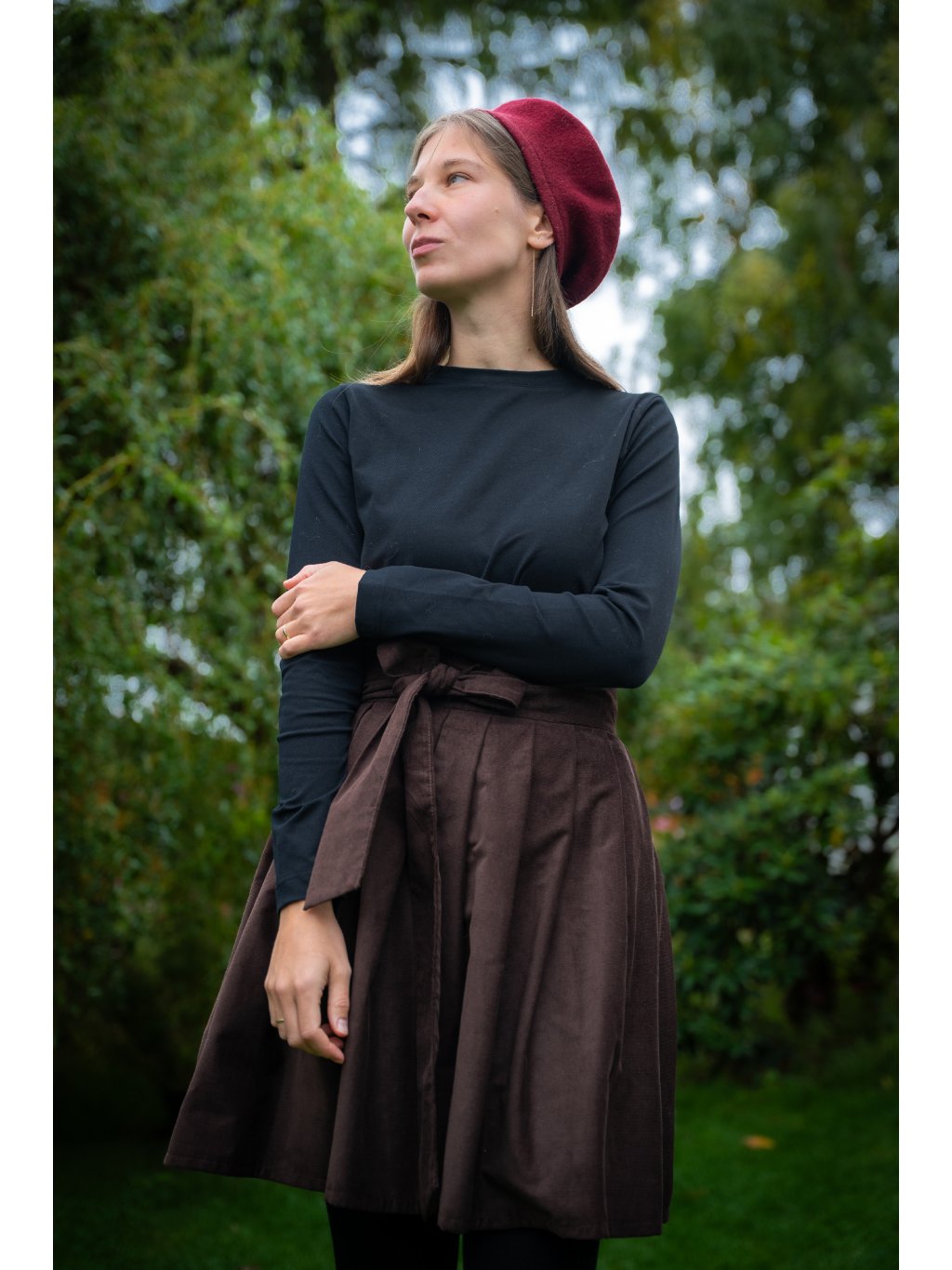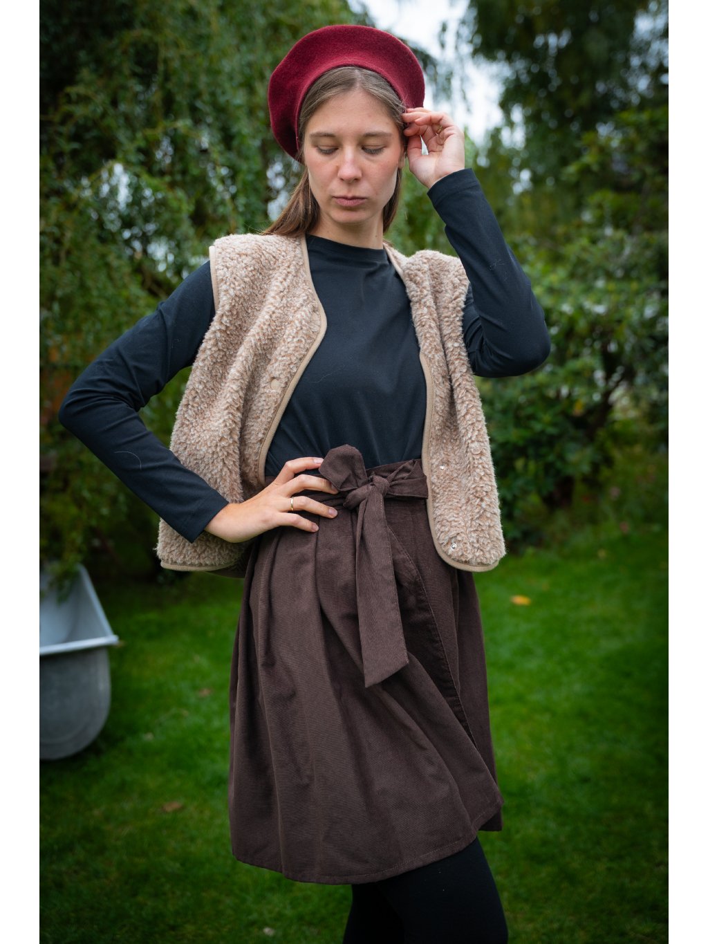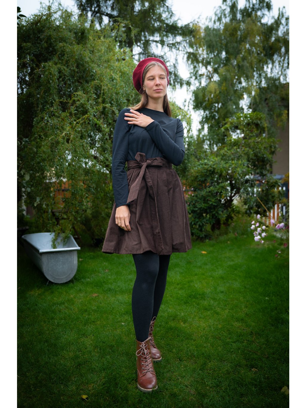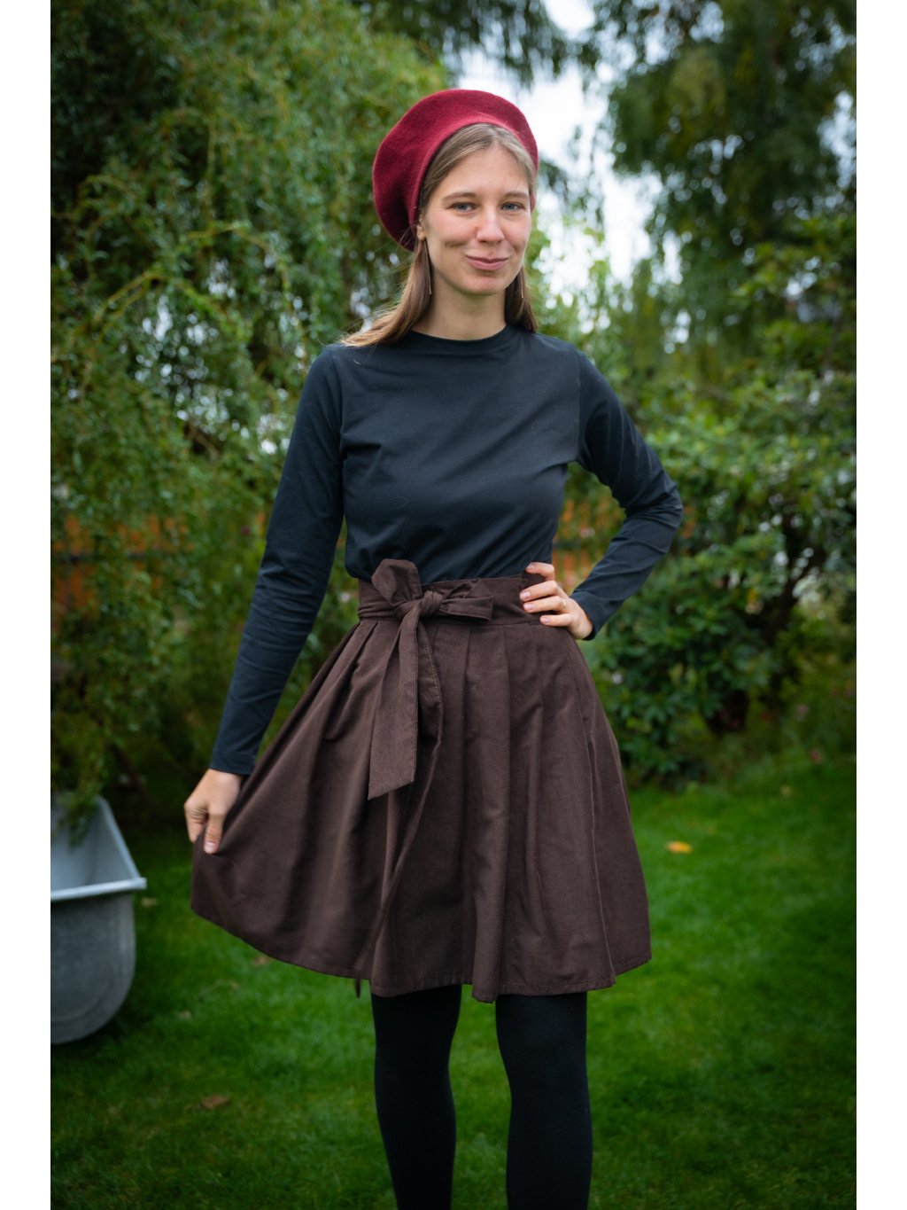 Elegantní zavinovací sukně ušitá ze slabšího manšestru v jasném čokoládovém odstínu.