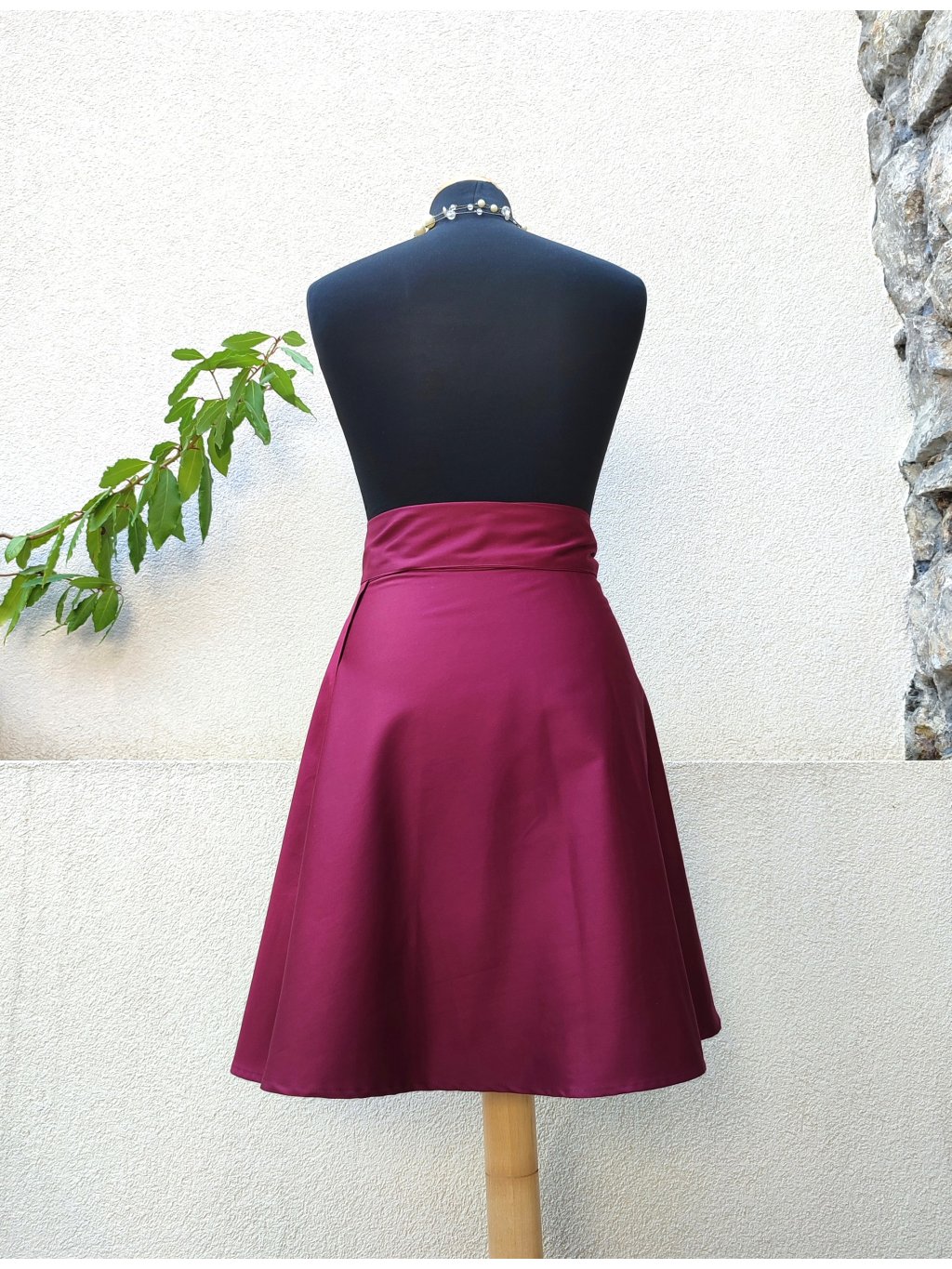 Zavinovací sukně půlkolového střihu, ušitá z hebkého, 100% bavlněného saténu, barva sytá bordó.