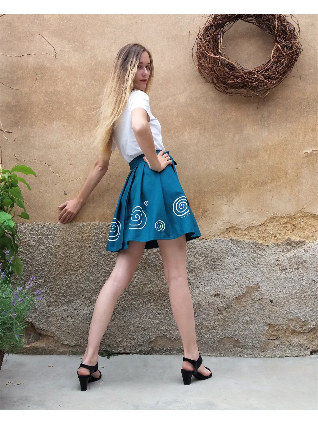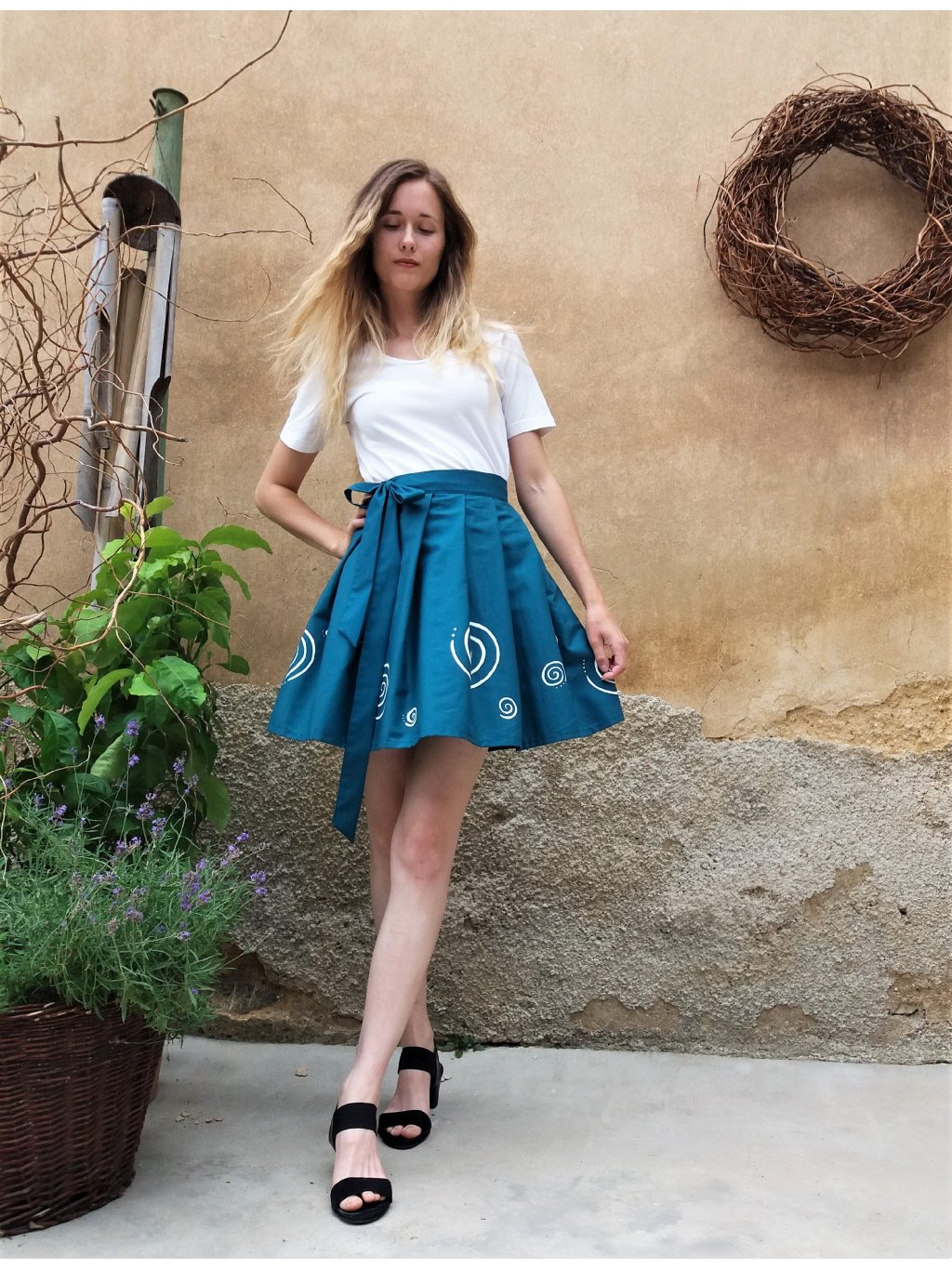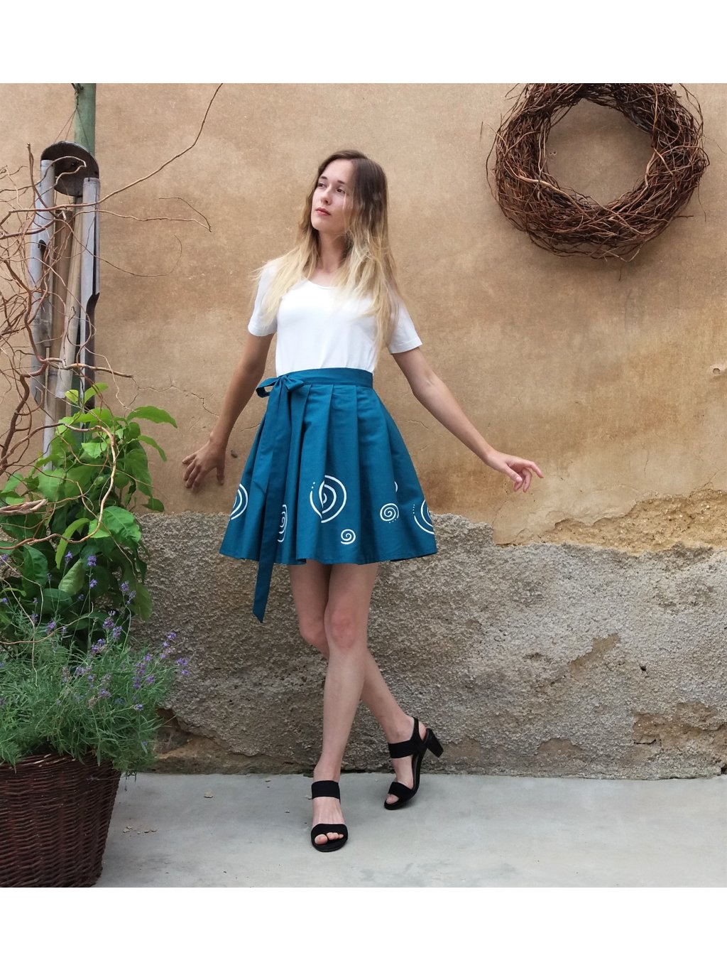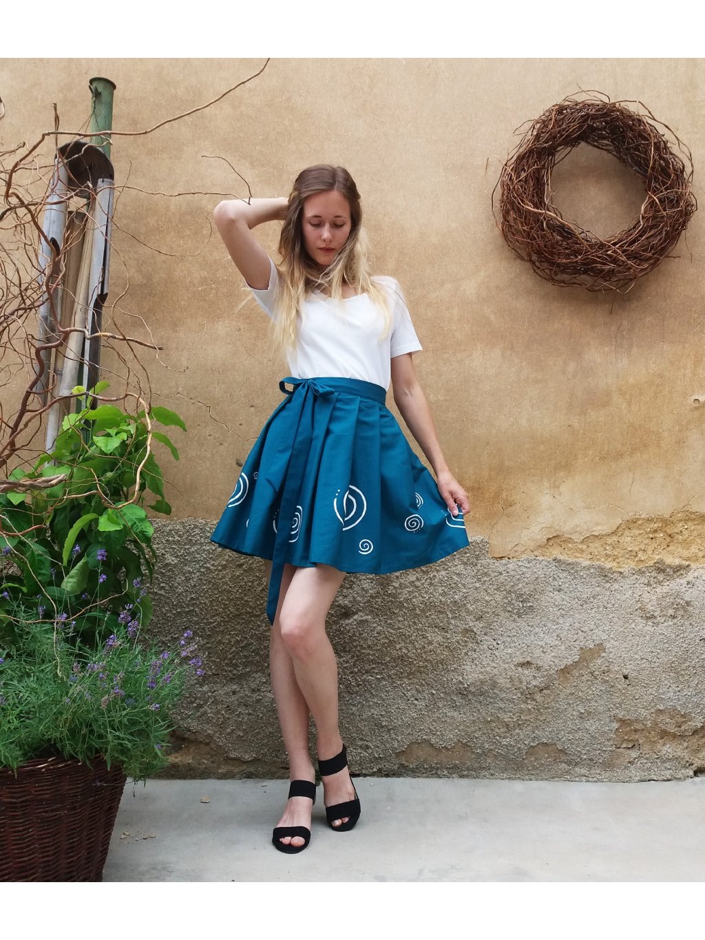 Zavinovací sukně ušitá ze 100% bavlněné látky, jasně petrolejové barvy.