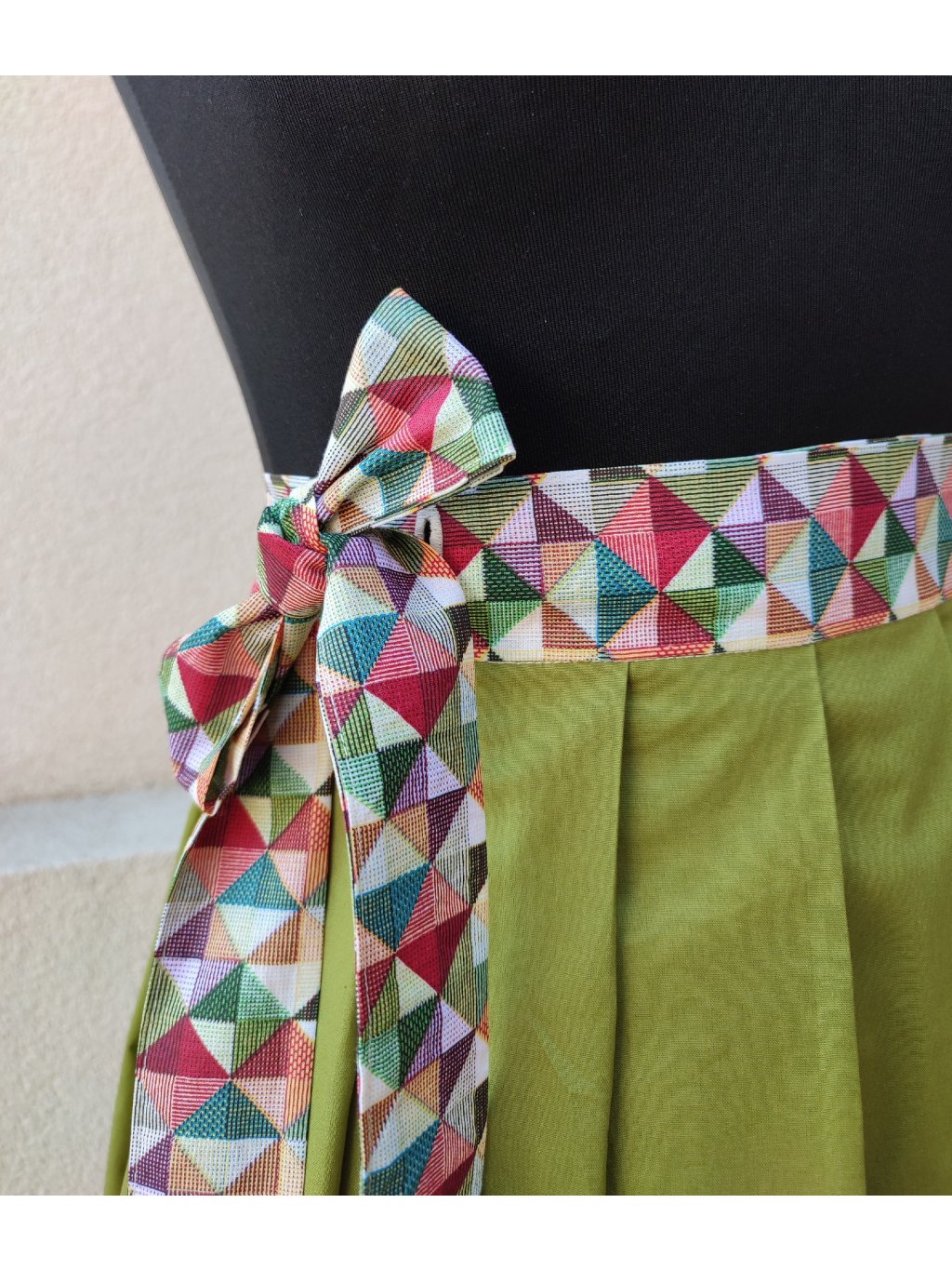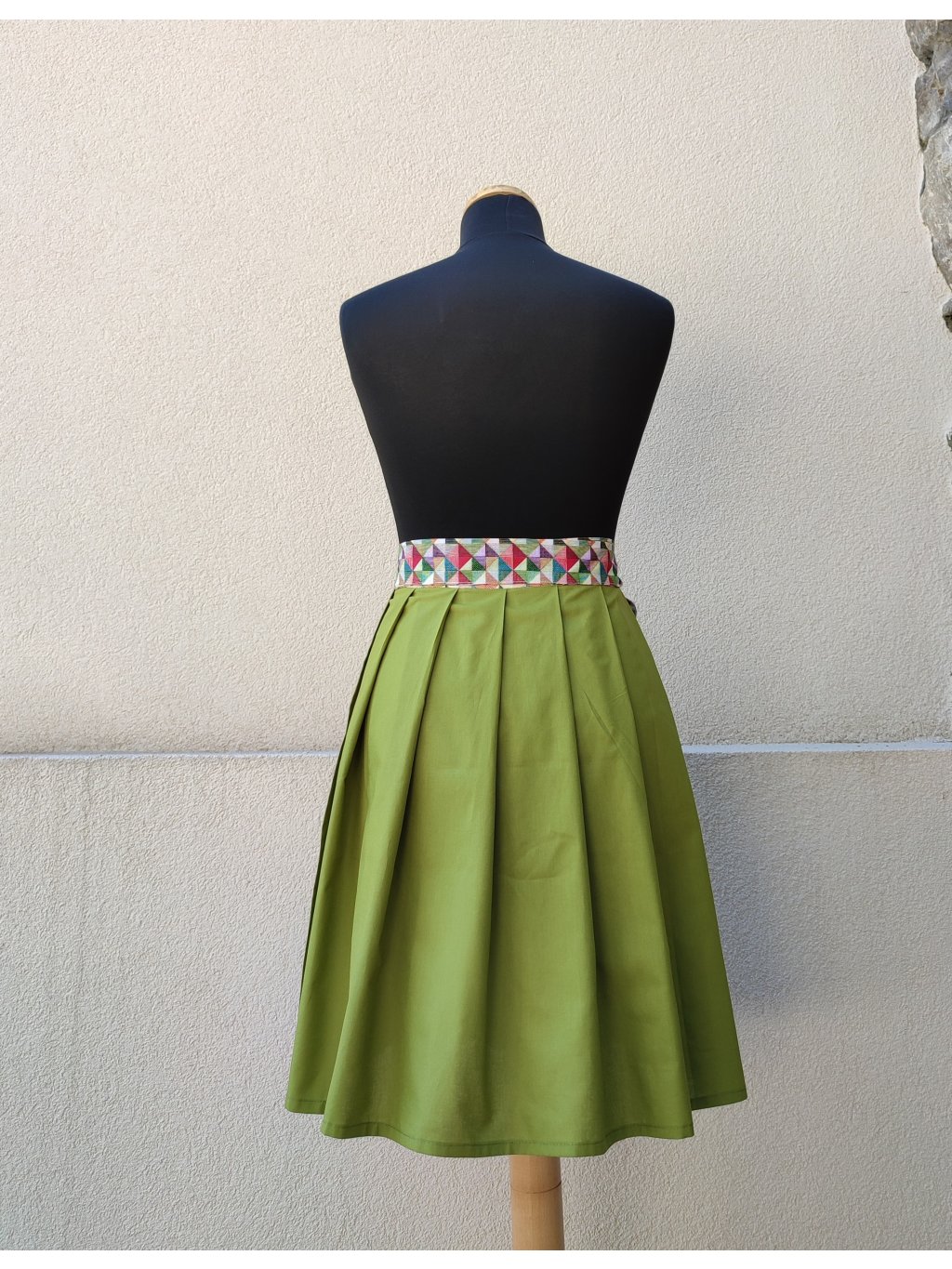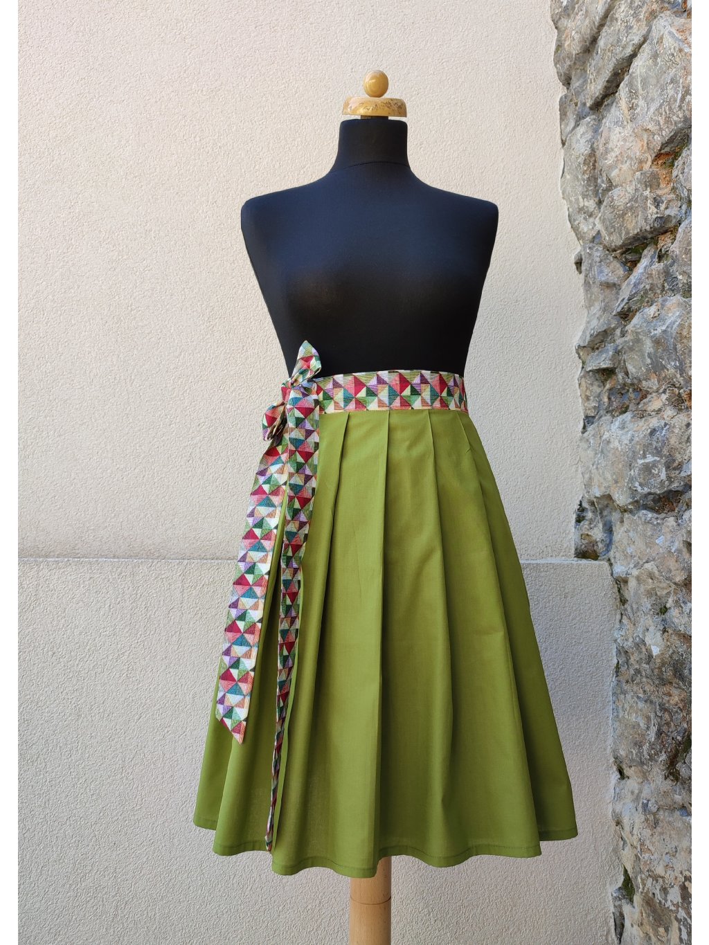 Zavinovací sukénka ušitá ze 100% bavlny, rozzářená barevným páskem.