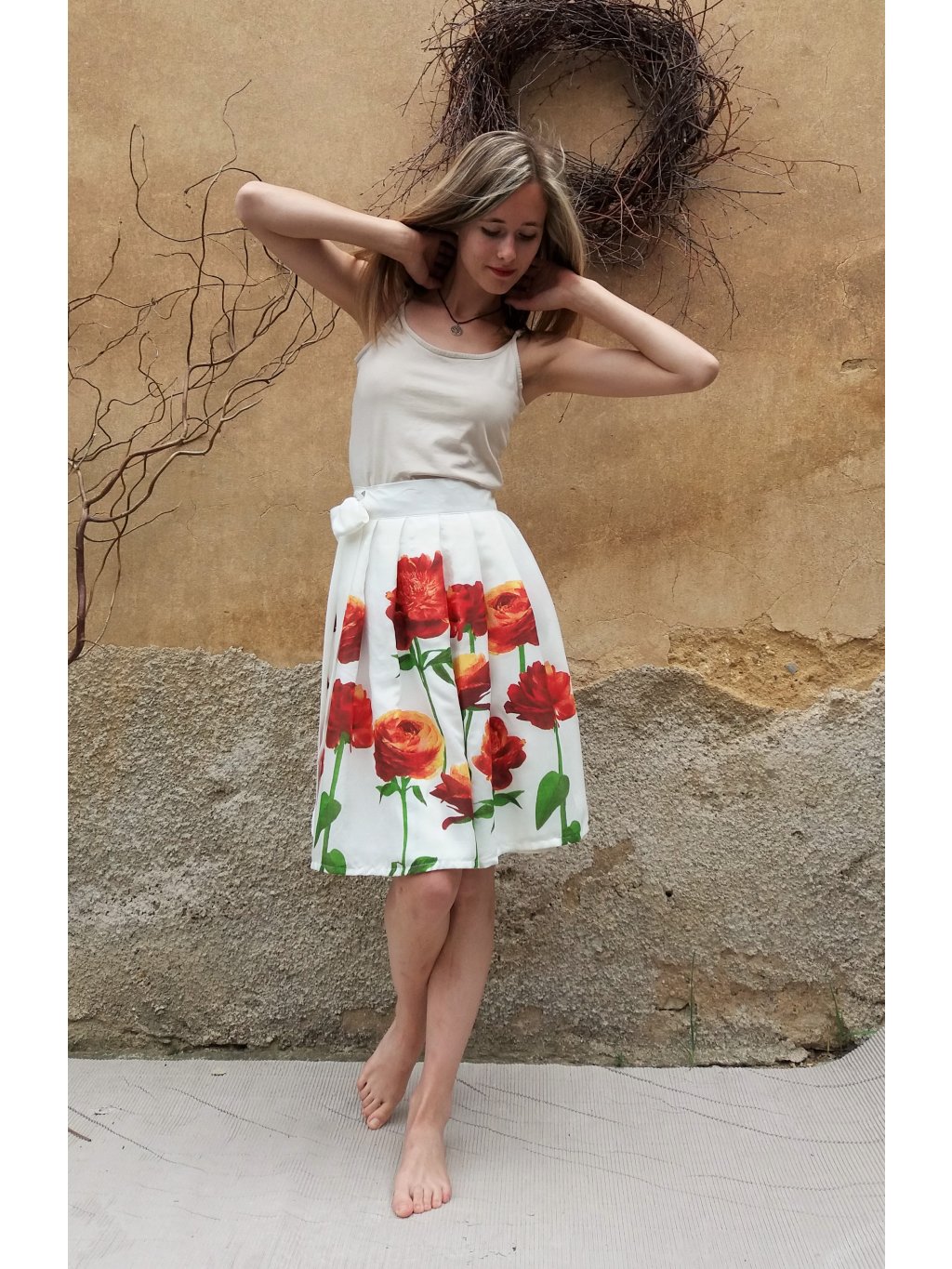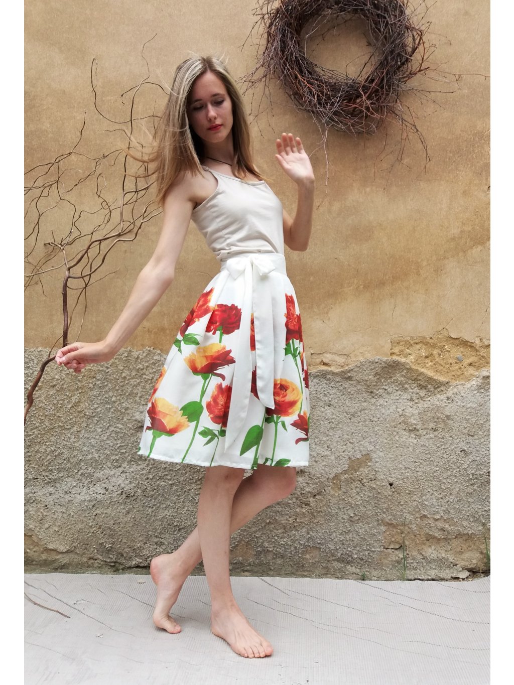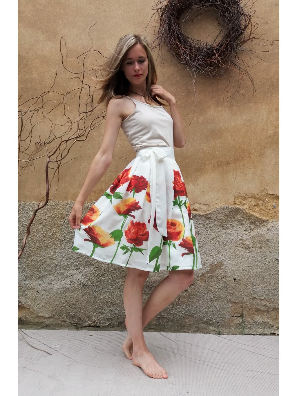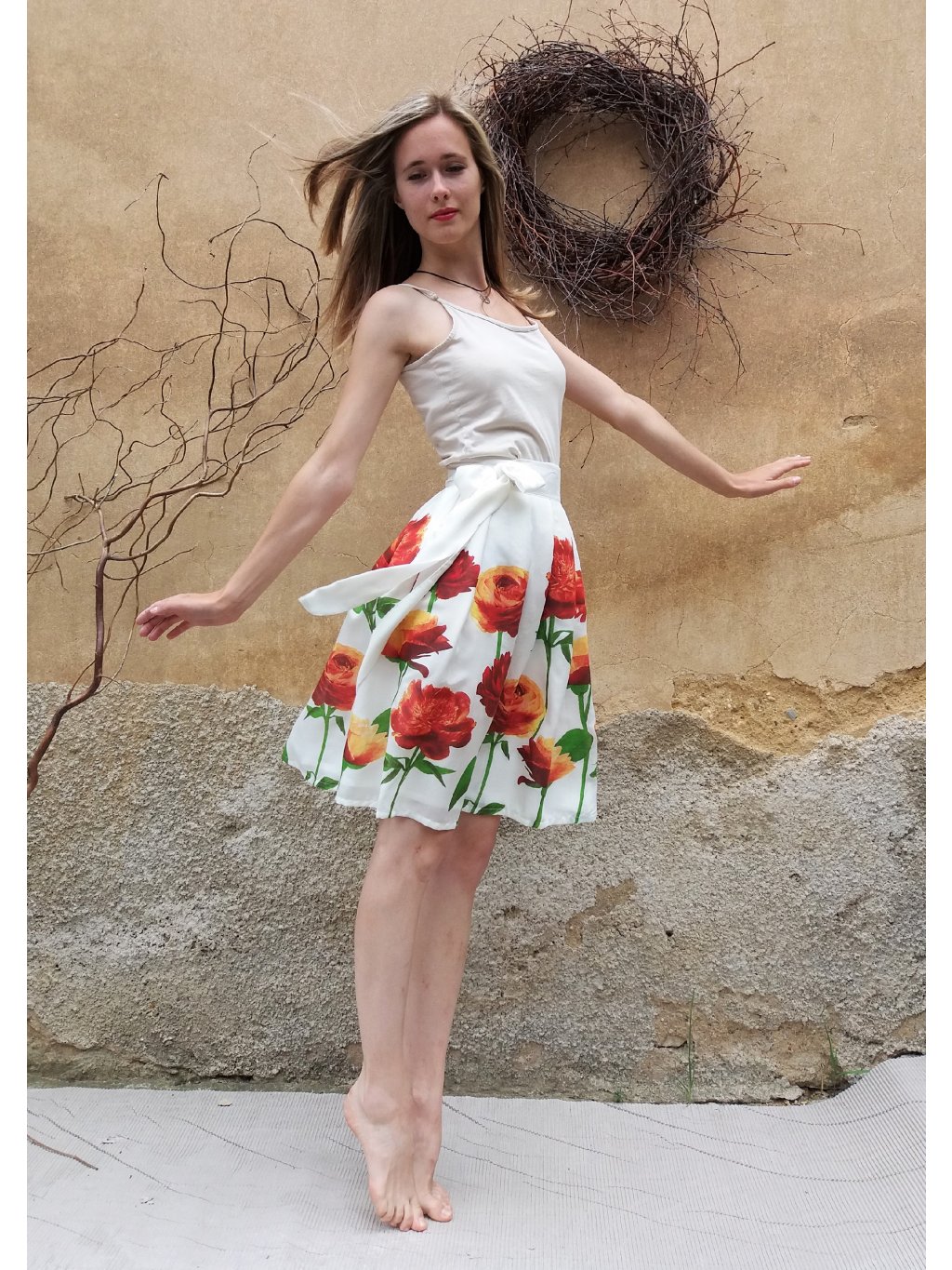 Originální, zavinovací sukénka ušitá z velmi jemné bavlny. Látka je hebká, tenoučká a prosvítá, proto jsem přidala ještě jednu spodní sukni. Obě vrstvy jsou naskládany do pásku, pouze oviňte kolem pasu a uvažte mašli.