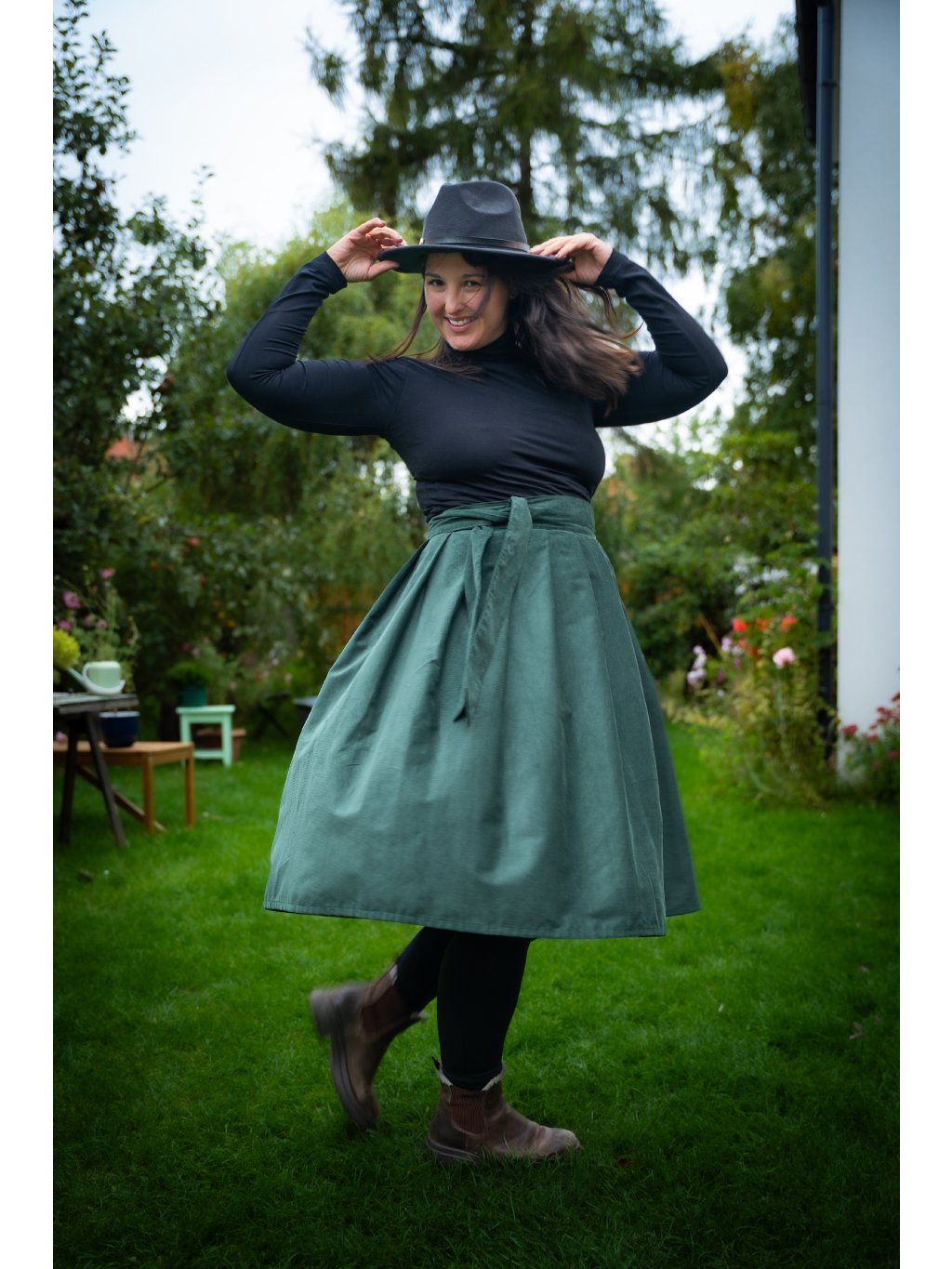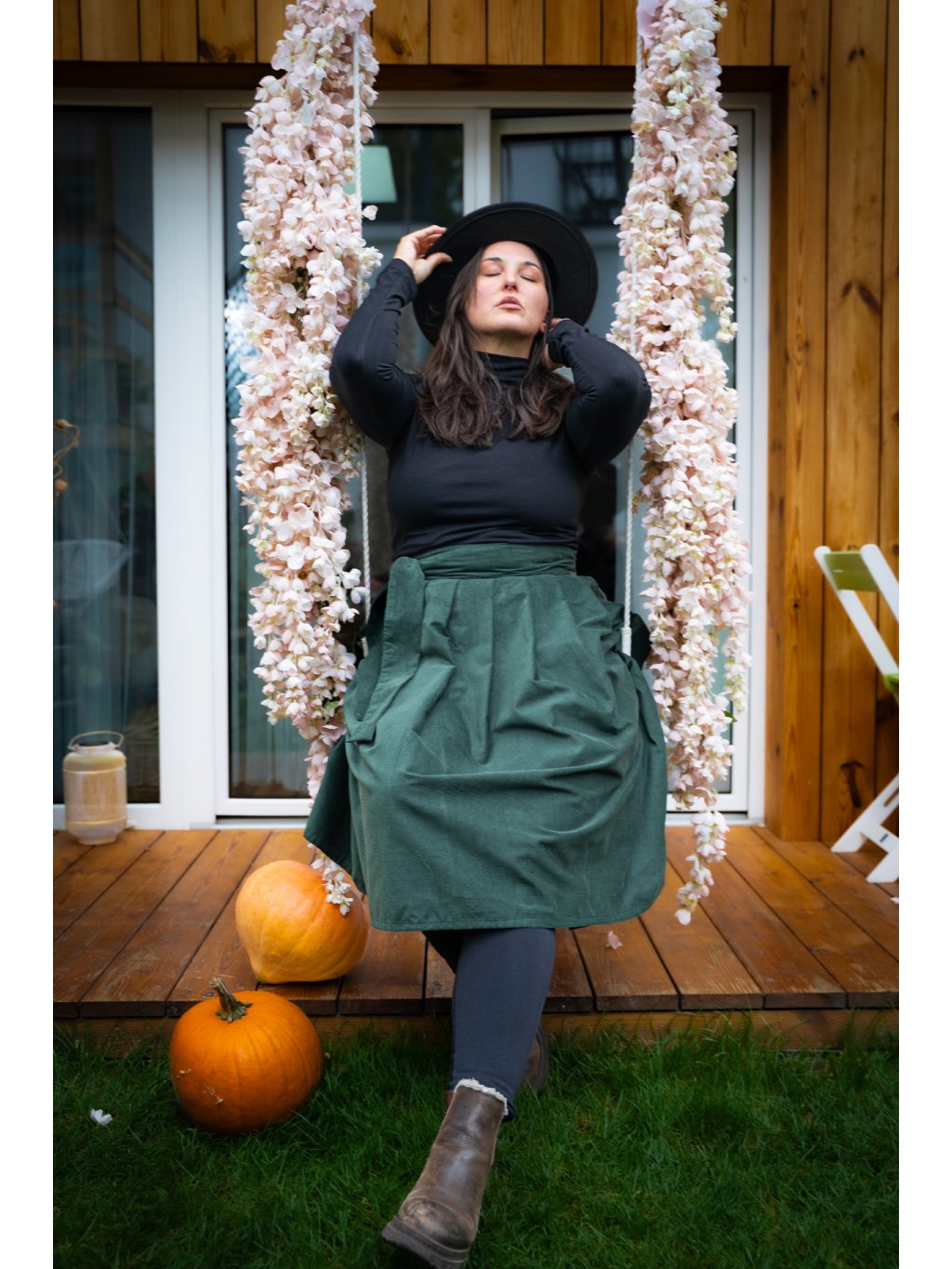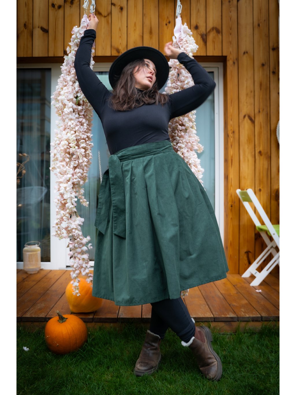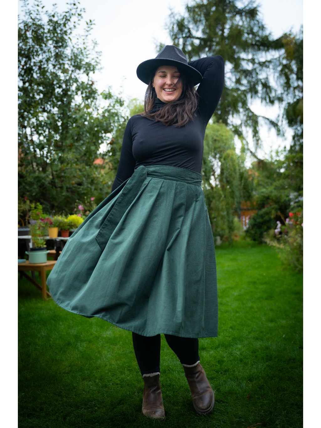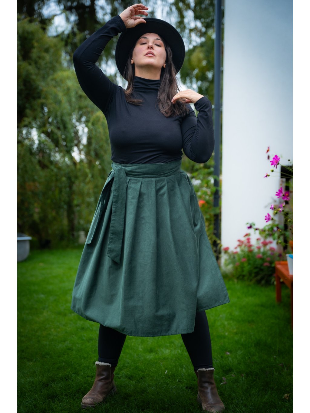 Tato zavinovací manšestrová midi sukně ve smaragdové barvě spojuje elegantní ženskost s přirozeným stylem.