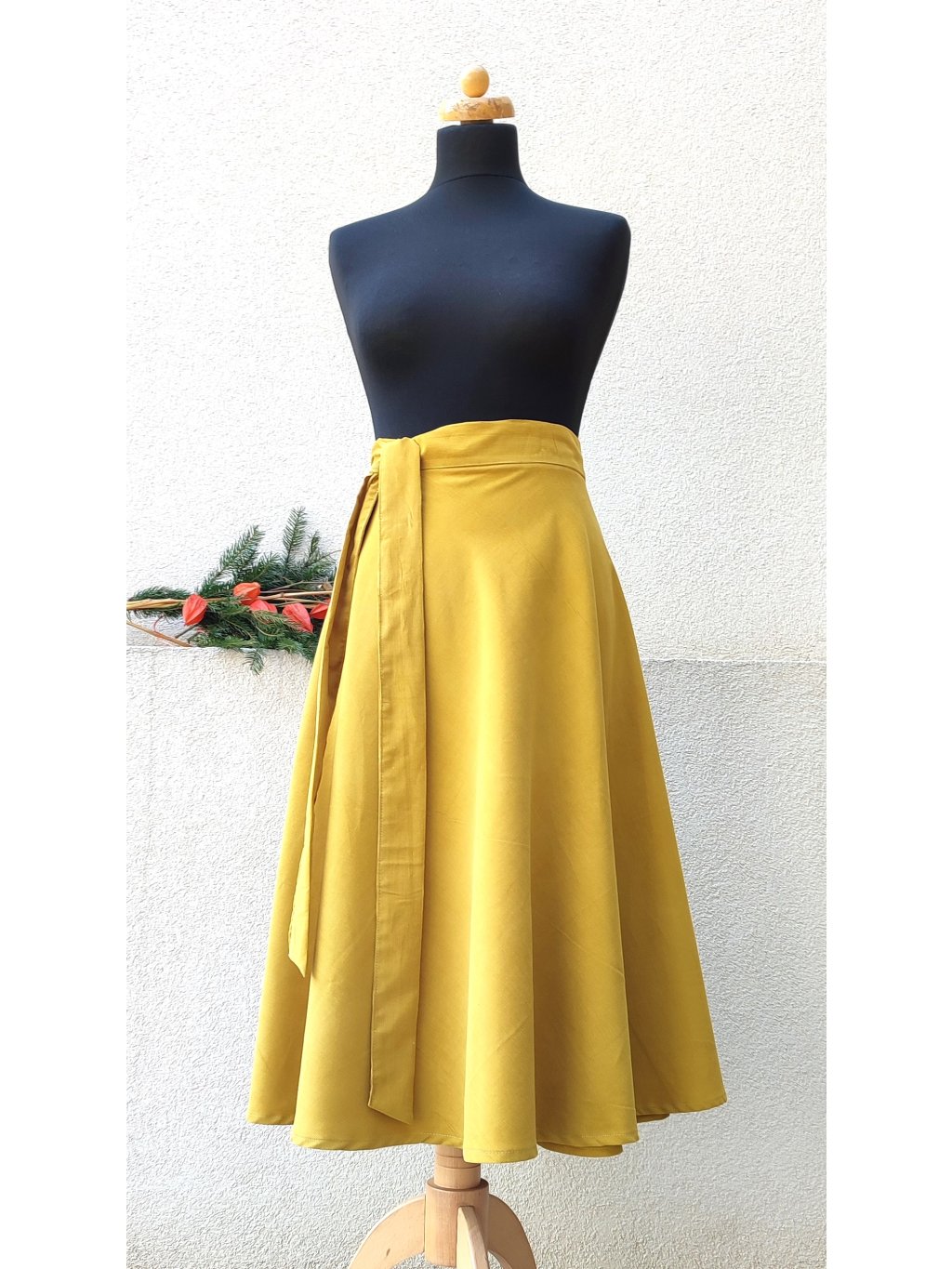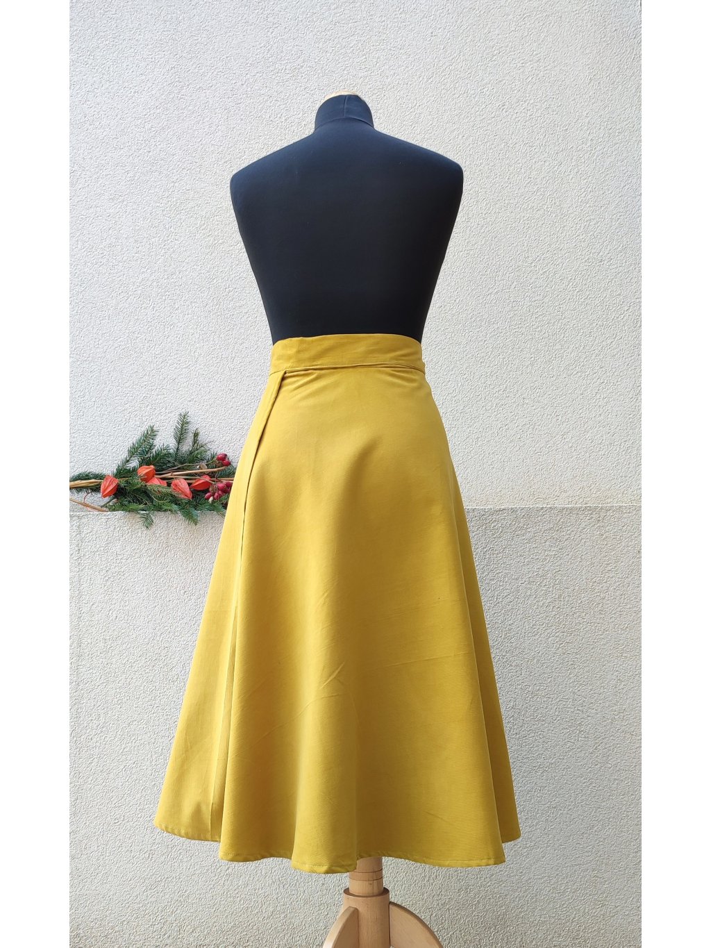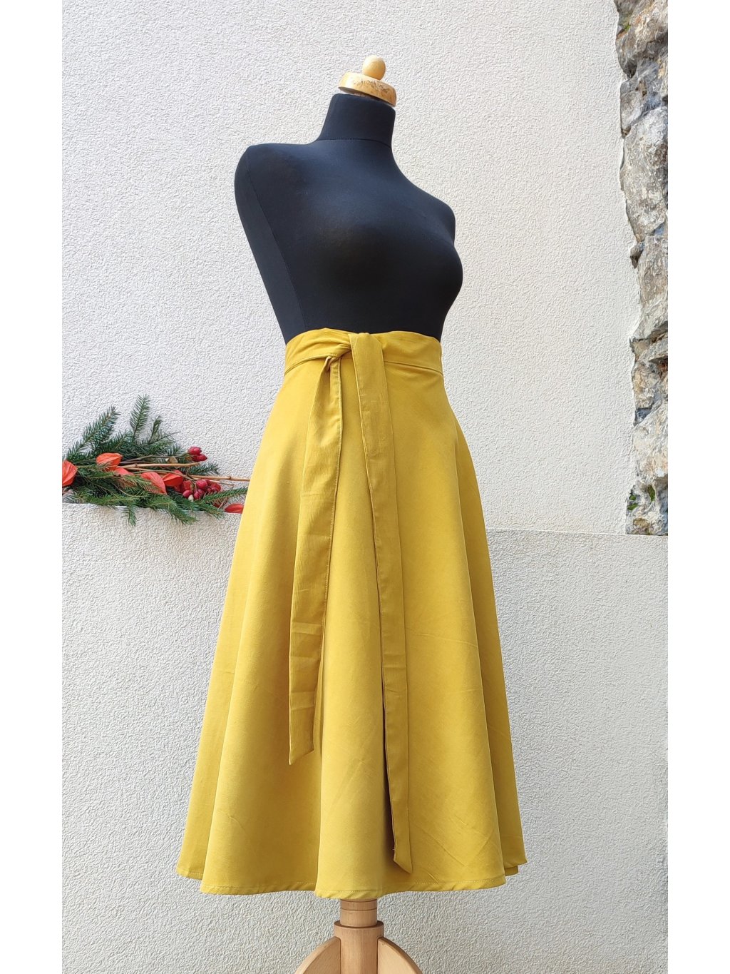 Tato zavinovací manšestrová midi sukně v barvě curry představuje spojení ženskosti, elegance a přírodního komfortu.