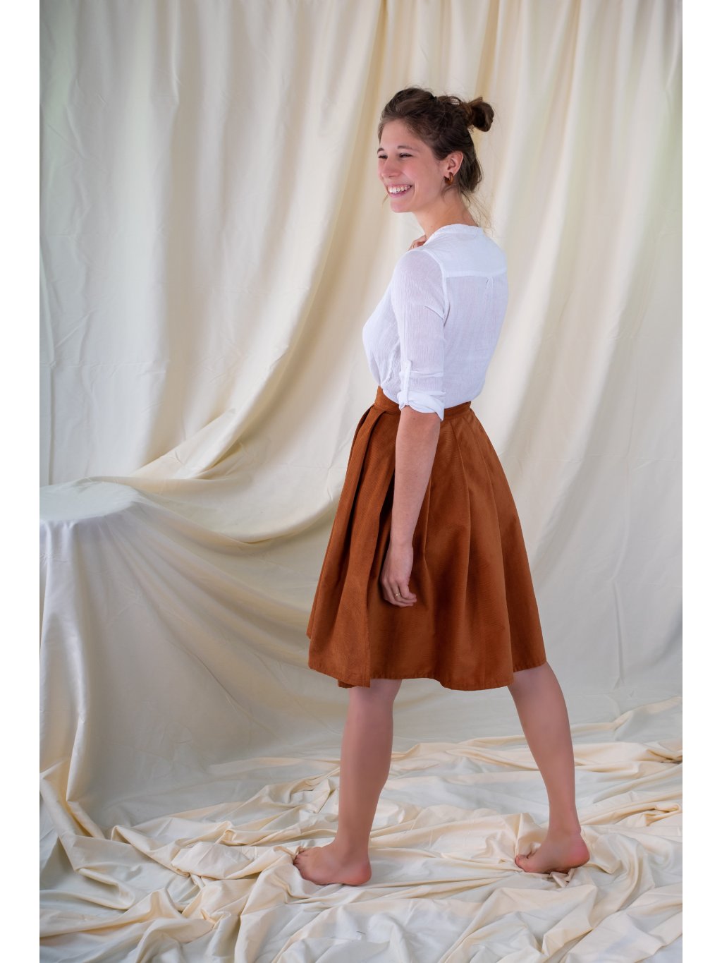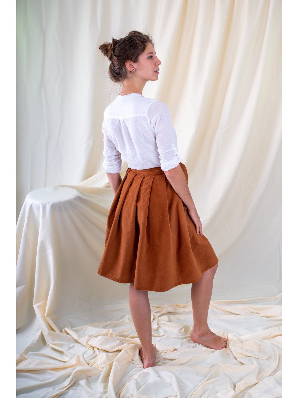 Tato koňaková zavinovací midi sukně z jemného manšestru spojuje eleganci, ženskost a praktičnost v jednom kousku.