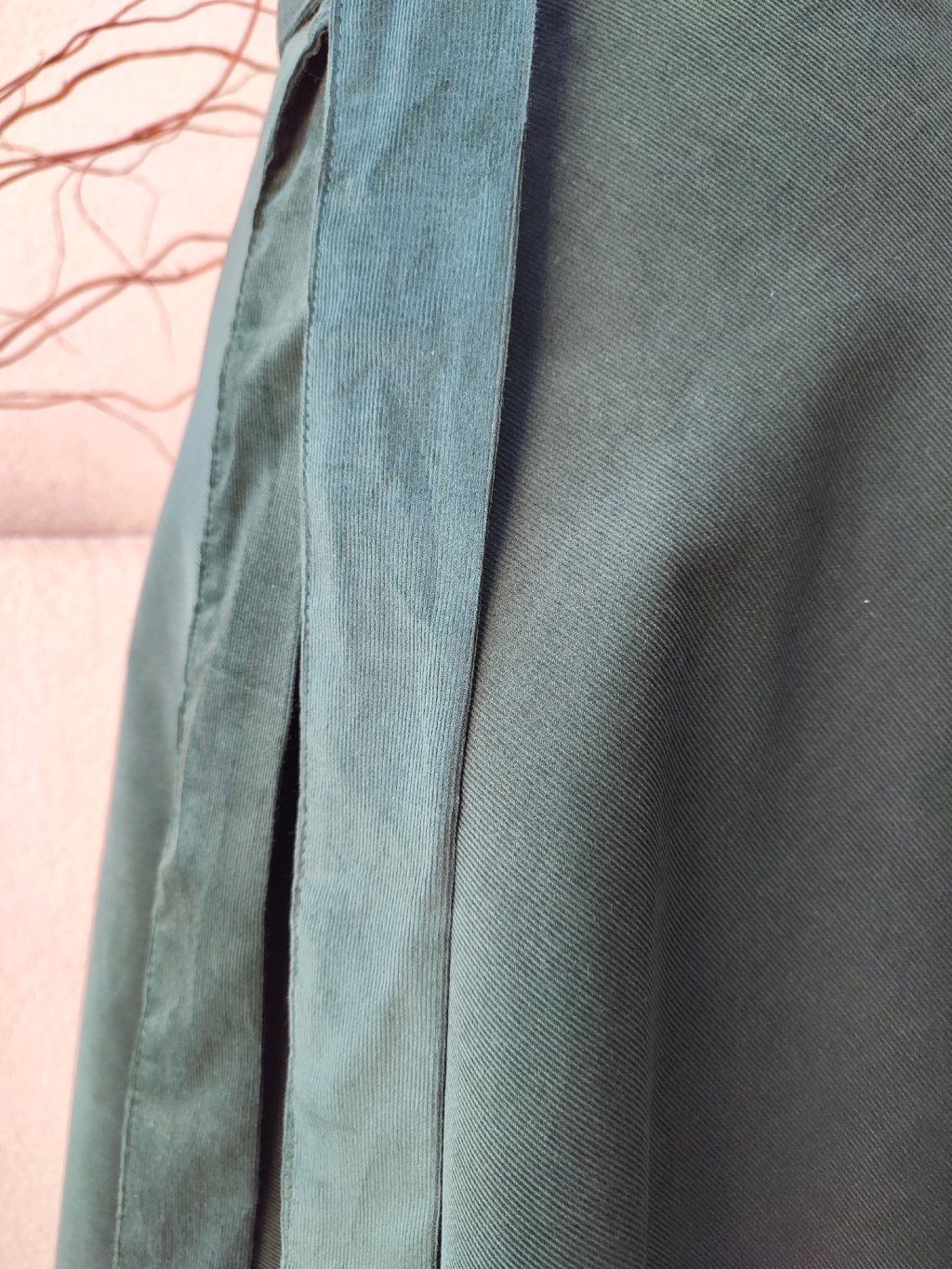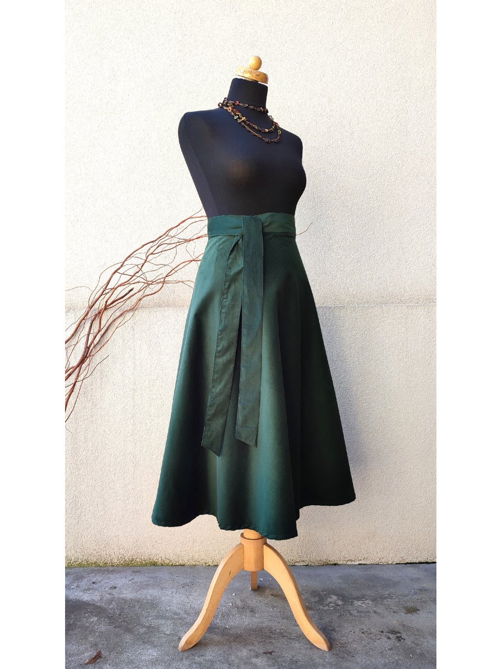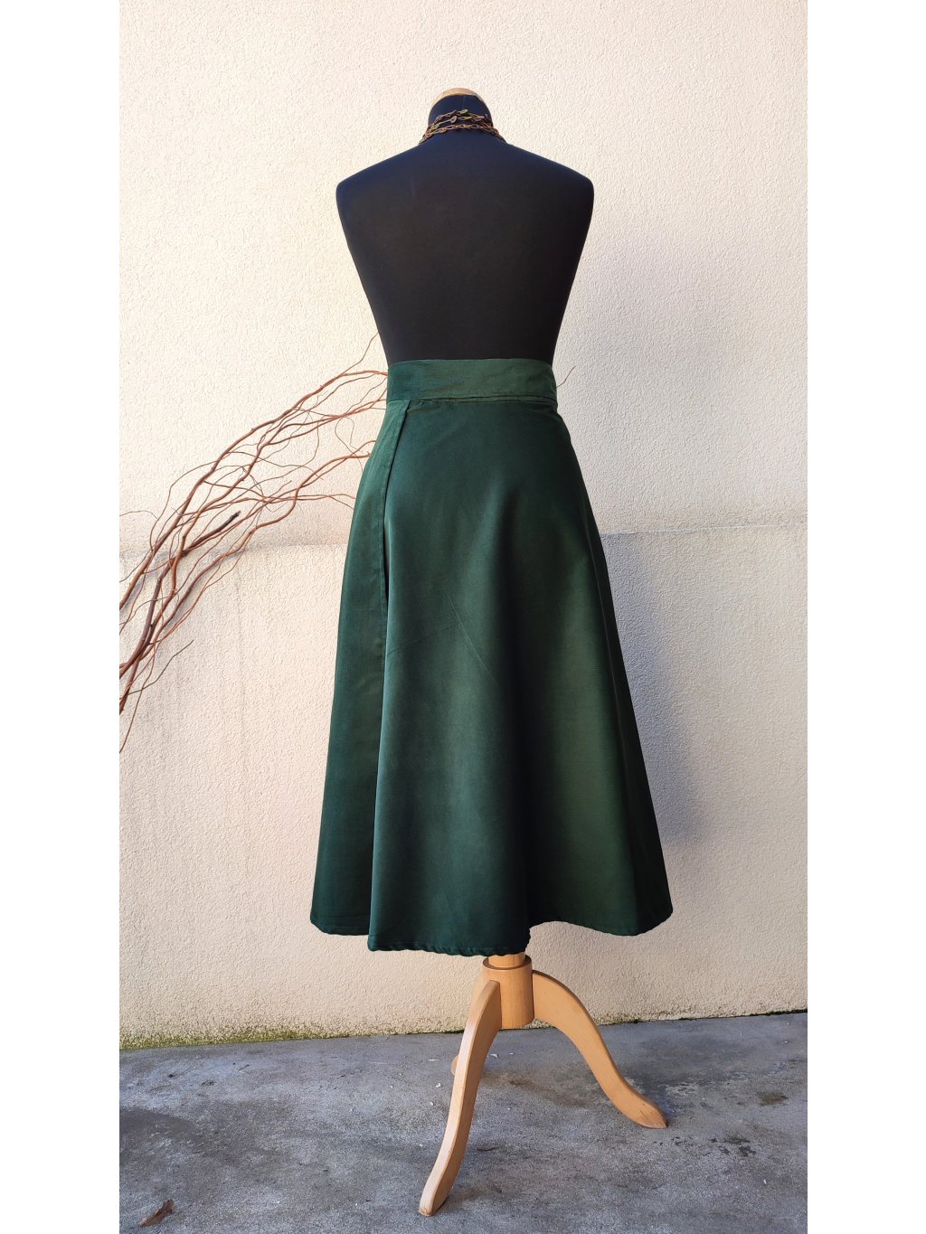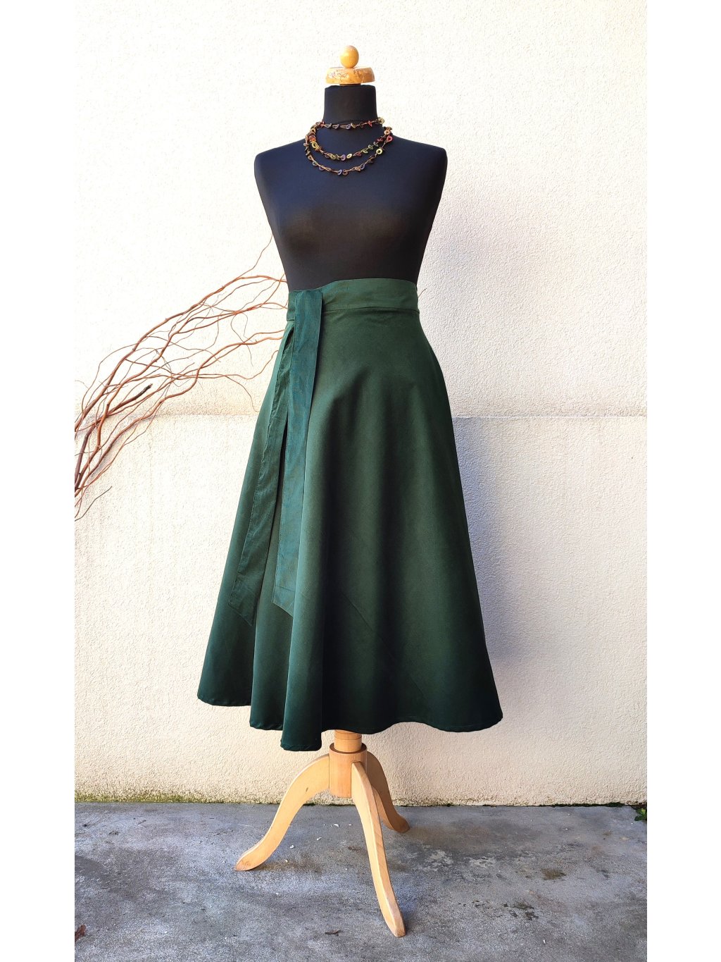 Tato zavinovací manšestrová midi sukně ve smaragdové barvě spojuje elegantní ženskost s přirozeným stylem.