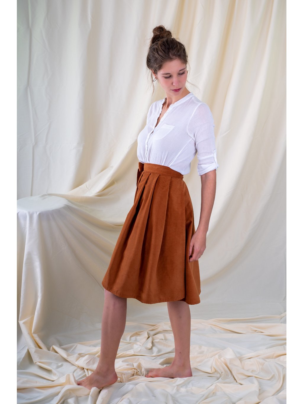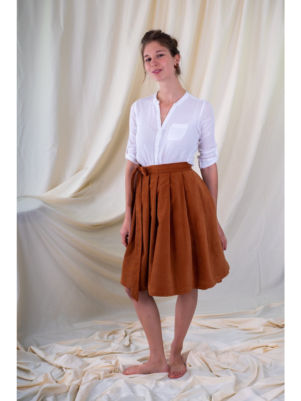 Elegantní zavinovací sukně ušitá z příjemného manšestru v krásné koňakové barvě.
