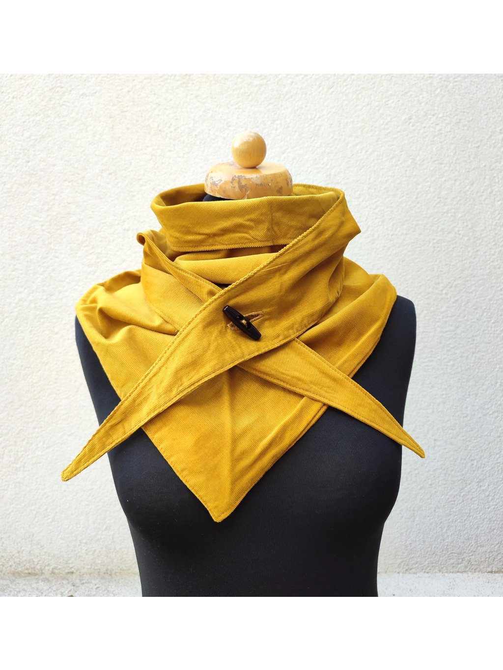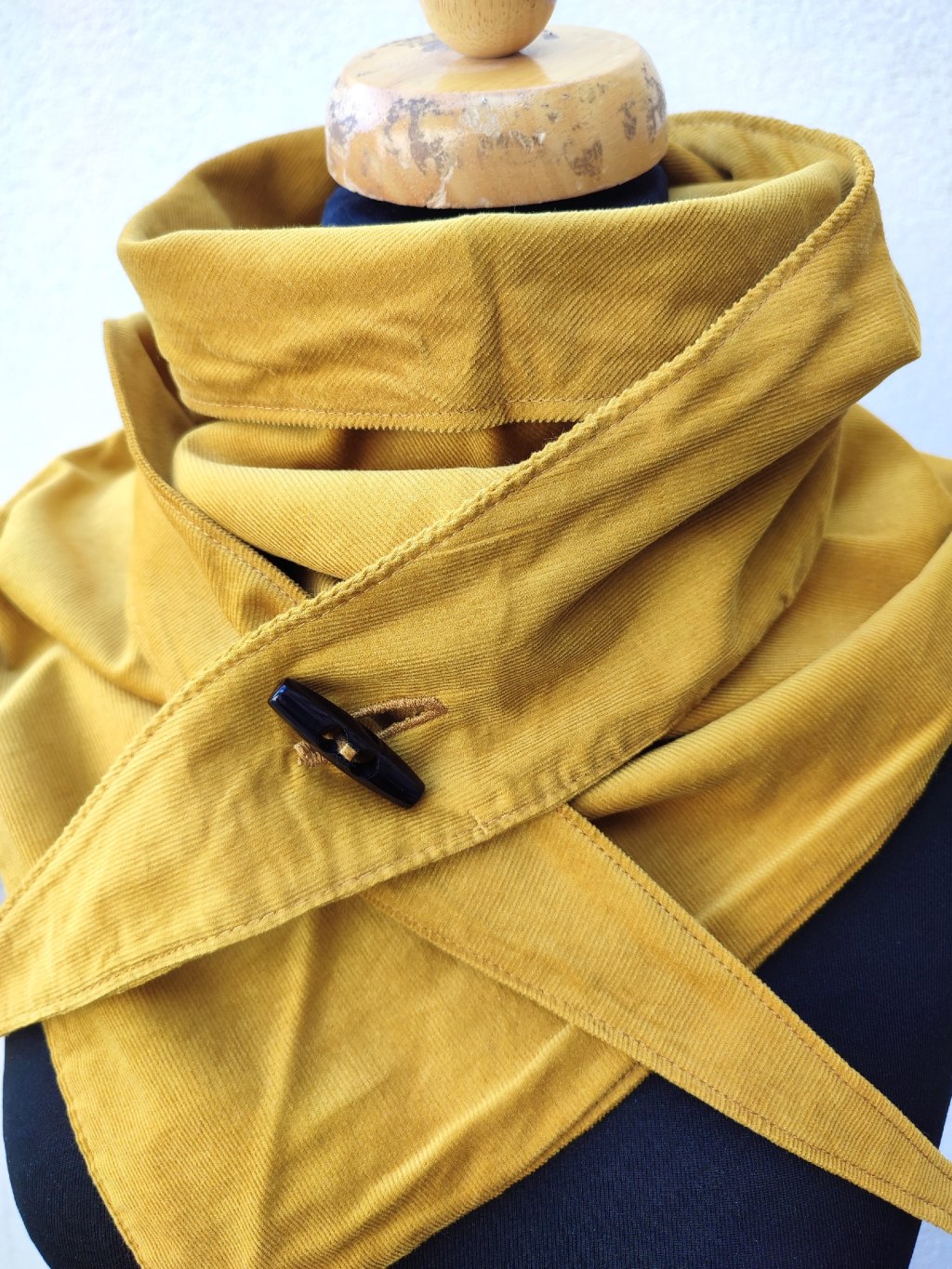 Jemný, hořčicový nákrčník, ušitý z dvojitého, heboučkého manšestru.