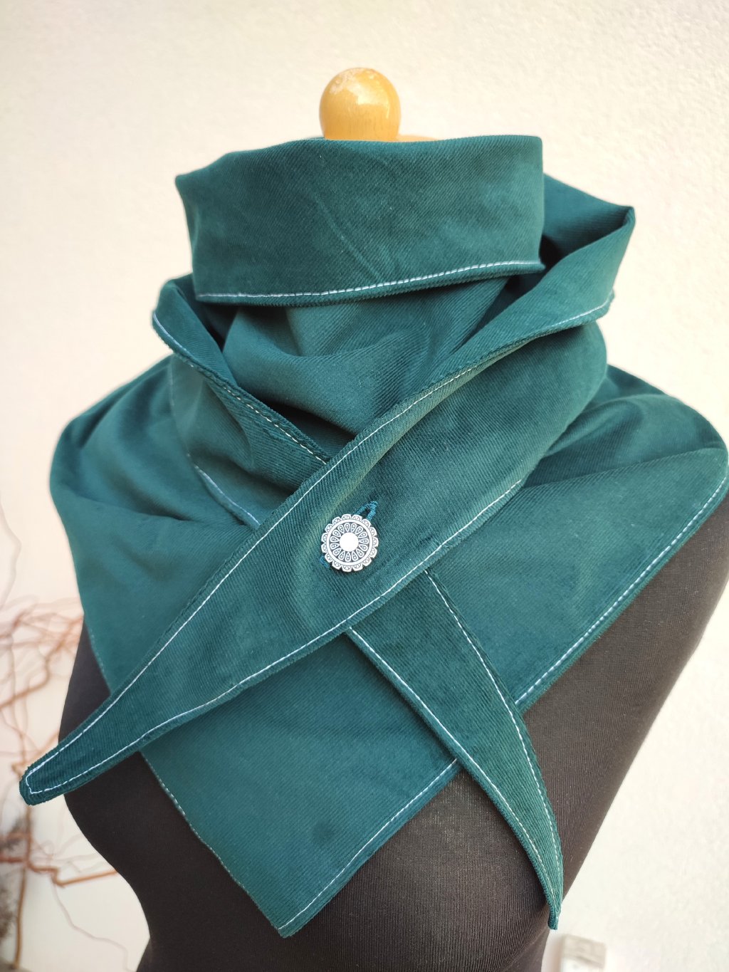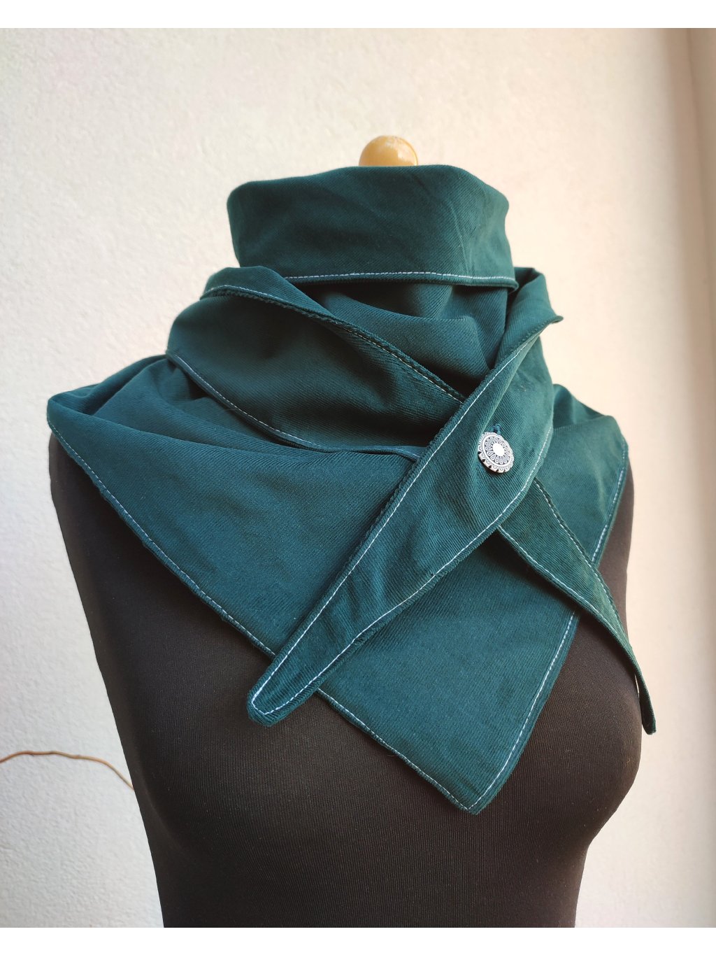 Jemný, zelený nákrčník, ušitý z dvojitého, heboučkého manšestru.