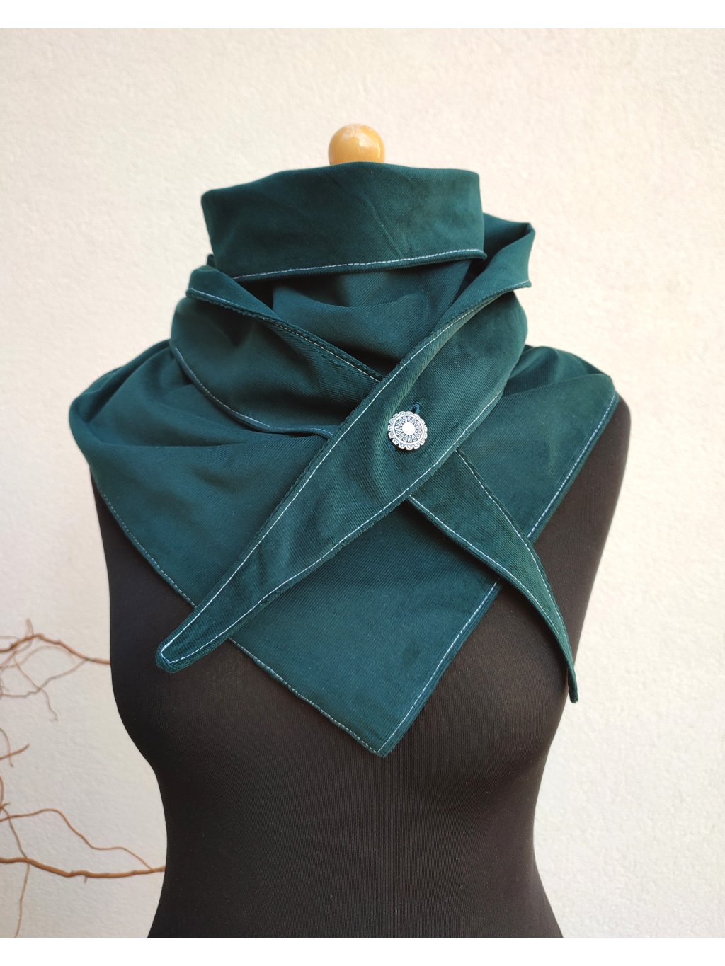 Šátek lemuje rovná steh a zdobí ho zajímavý knoflík.