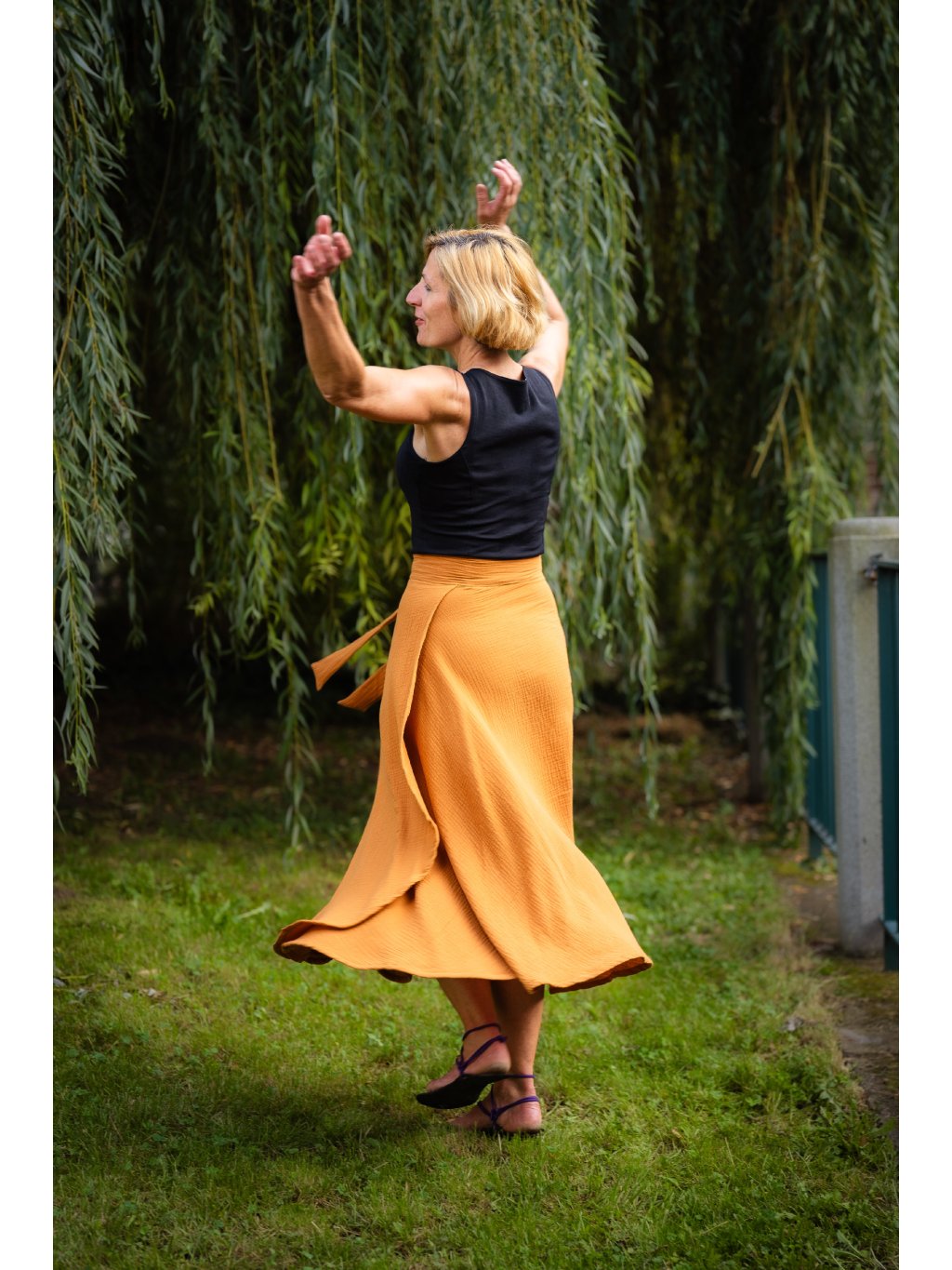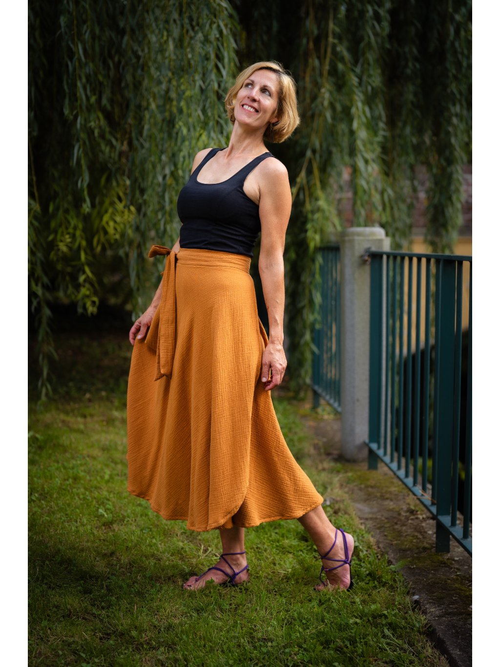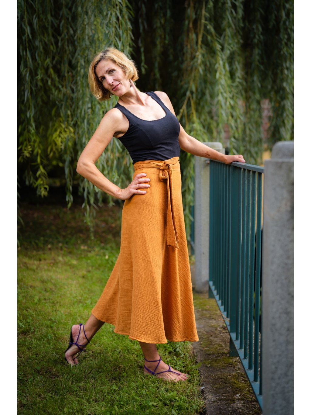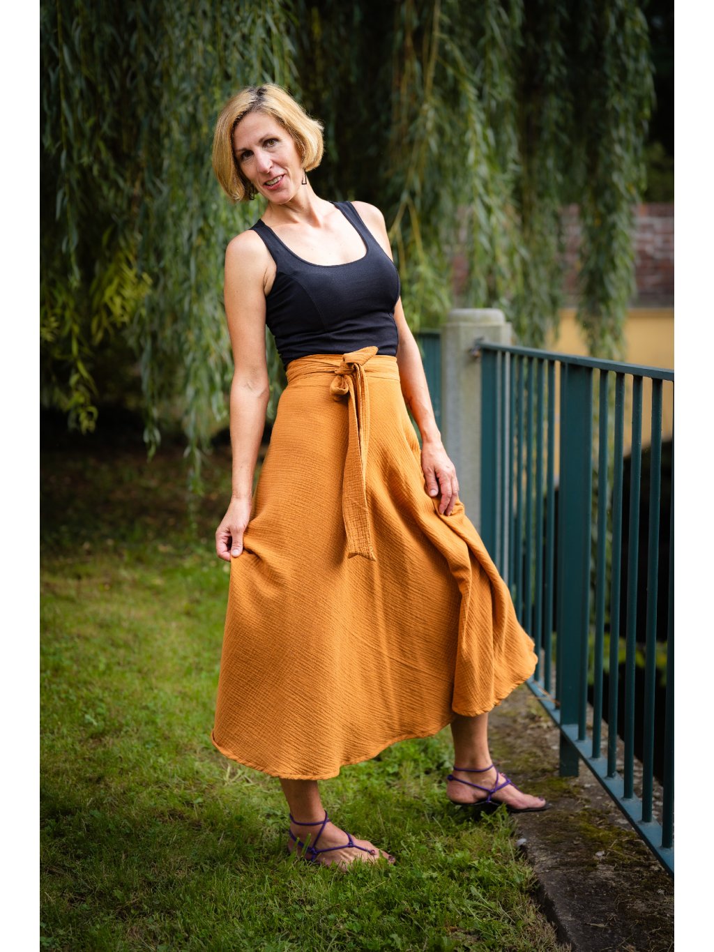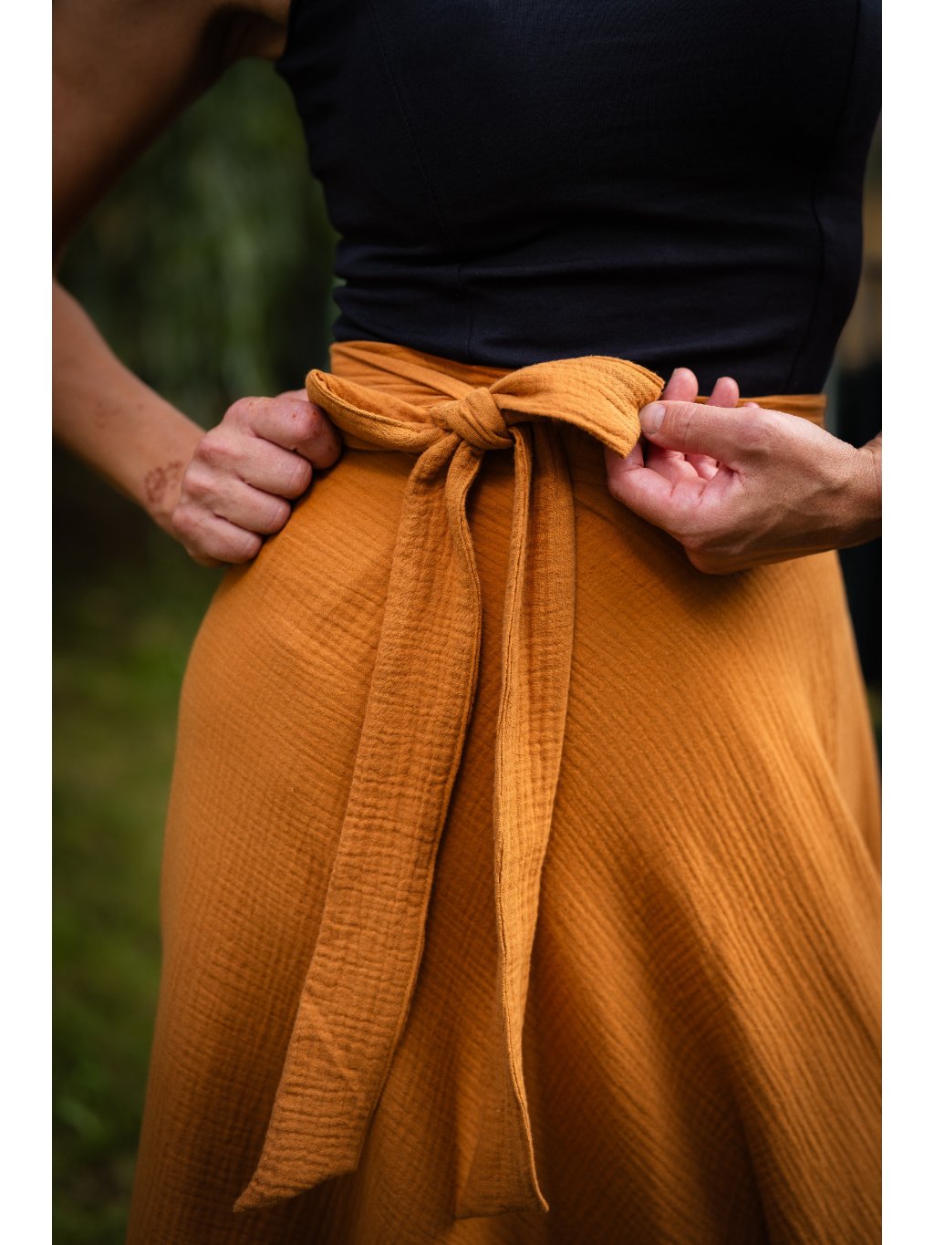 Delší, vzdušná sukně, která voní létem. Ušitá z hebkého mušelínu ze 100% bavlny v tlumeném medovém odstínu, který naživo působí tepleji a jemněji než na fotografii.