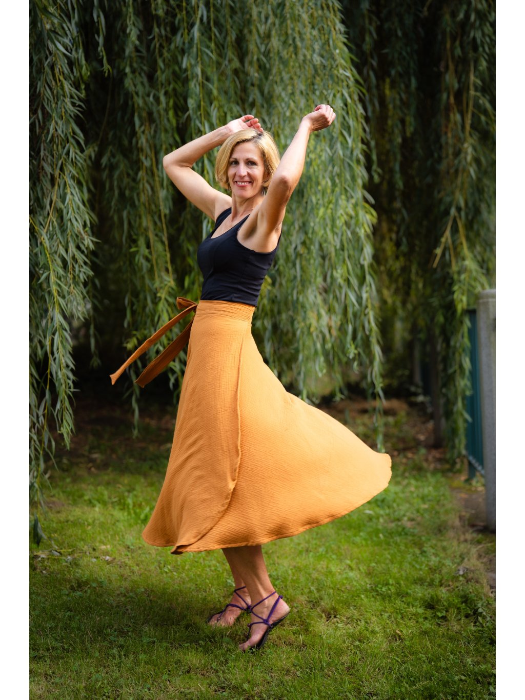 Sukně je šitá v půlkolovém, zavinovacím střihu – elegantním, ale pohodlném, který se krásně přizpůsobí postavě.