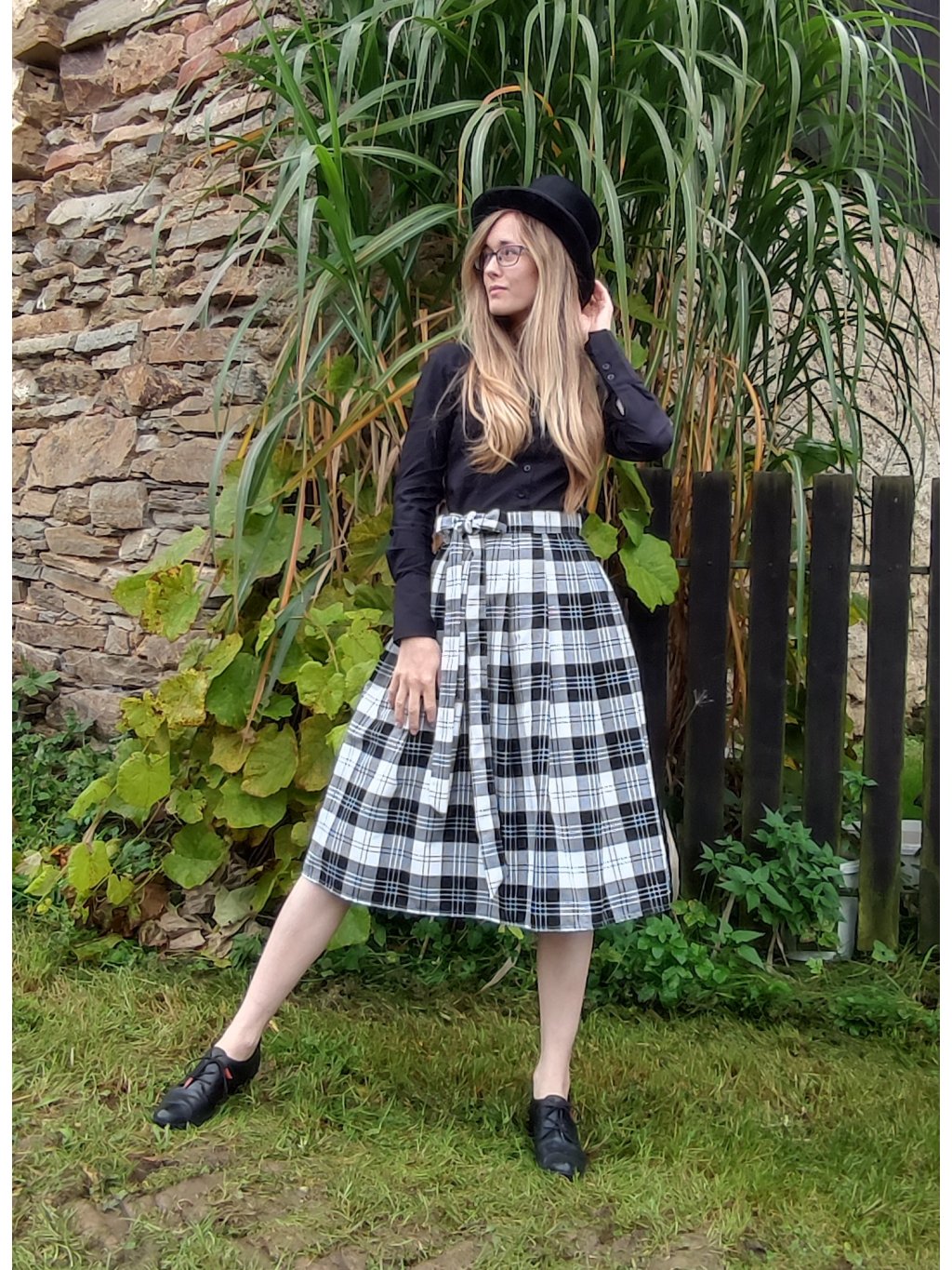 Zavinovací sukně ušitá ze středně silné tkaniny, směs umělého vlákna a bavlny.