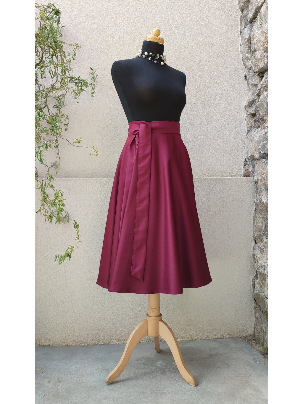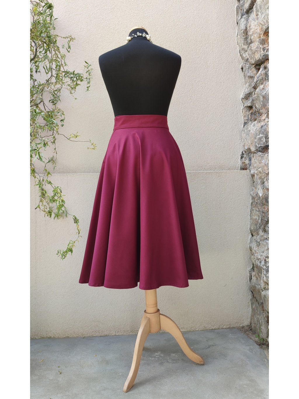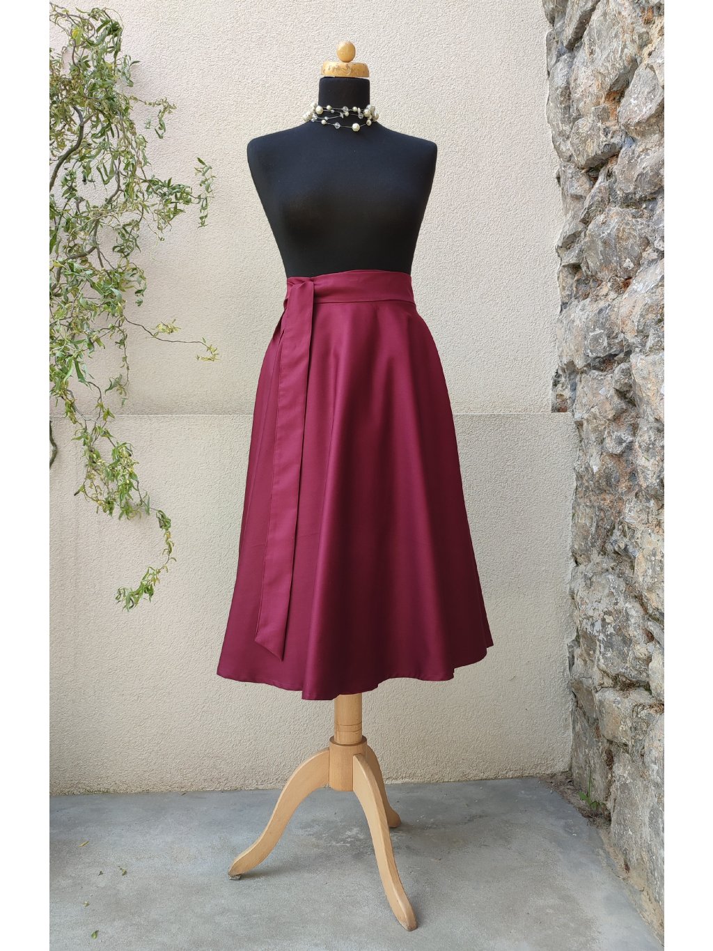 Zavinovací sukně kolového střihu, šitá z bavlněného saténu v syté bordó barvě.