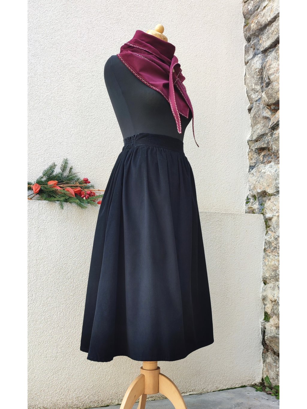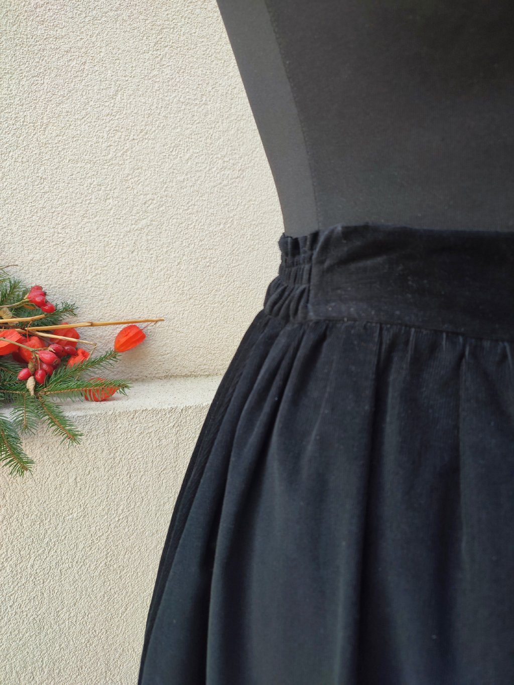 Sukně má kaz, přední díl má na látce vlas opačným směrem než zadní díl (ach to noční šití při špatném světle). Funkčnost sukně to nijak nenarušuje, ani to vlastně není tolik vidět, ale chyba se stala. Sukně je proto levnější.