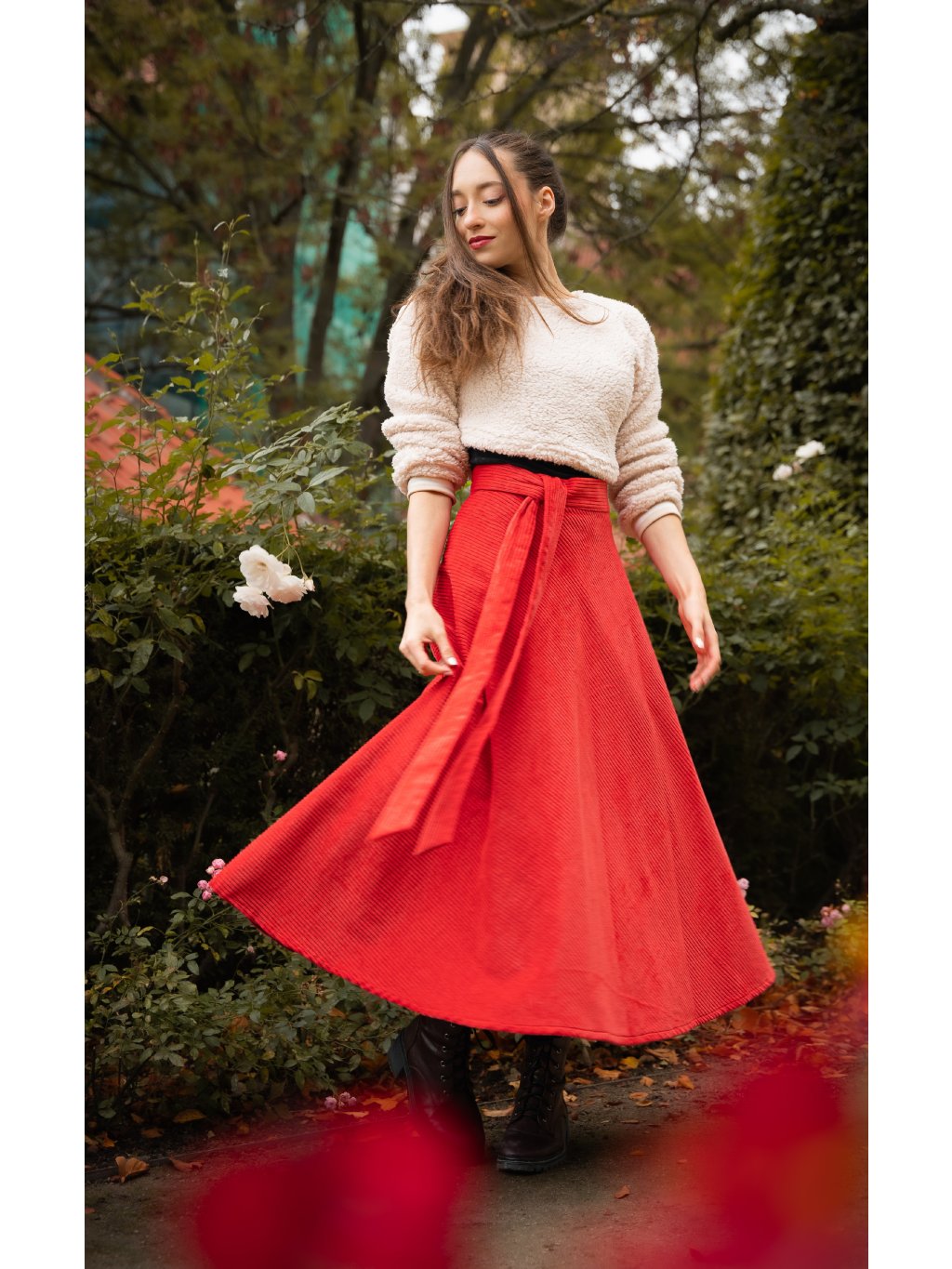 Rozjasněte své podzimní a zimní outfity s naší dlouhou manšestrovou sukní v červené barvě. Ušitá z 100% bavlny, z kvalitního manšestru, který je pevnější, ale zároveň jemný a příjemný na dotek. Díky půlkolovému zavinovacímu střihu krásně splývá, lichotí postavě a zvýrazňuje ženskost.