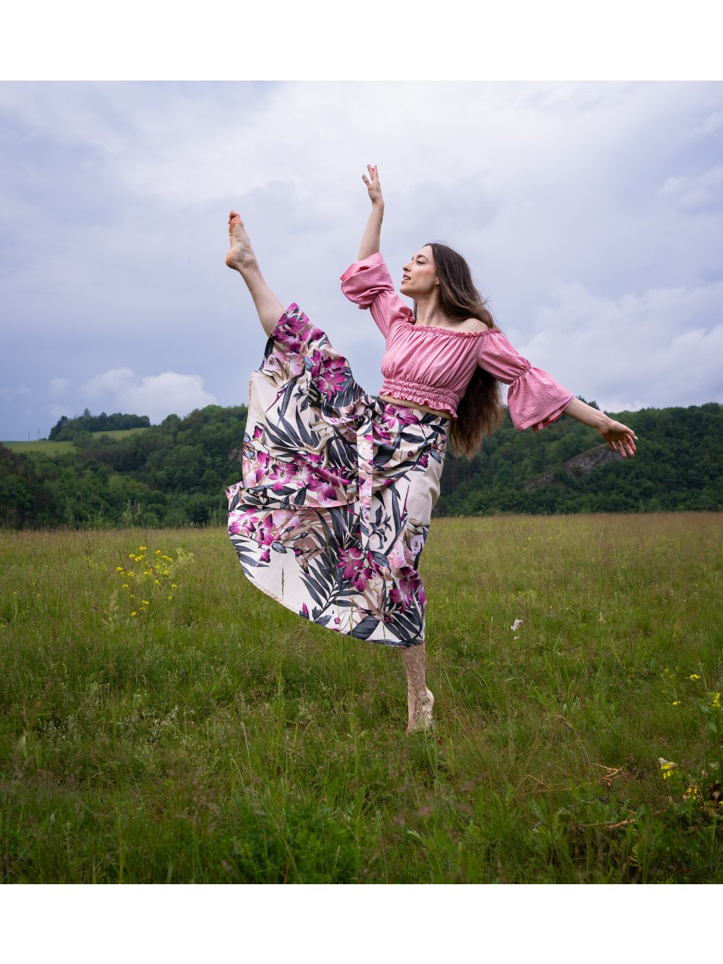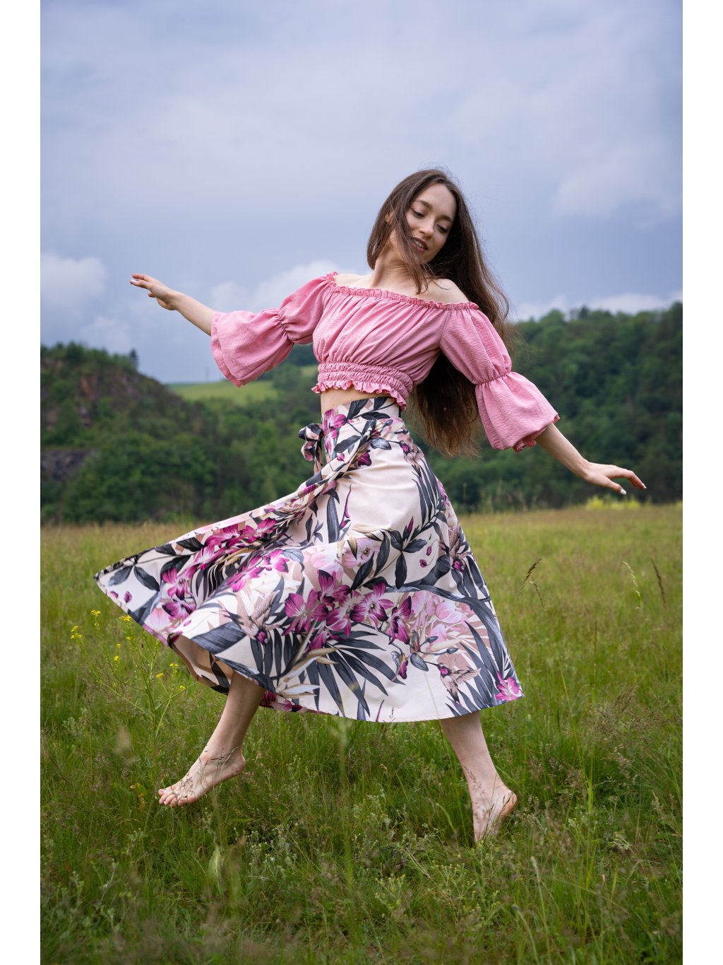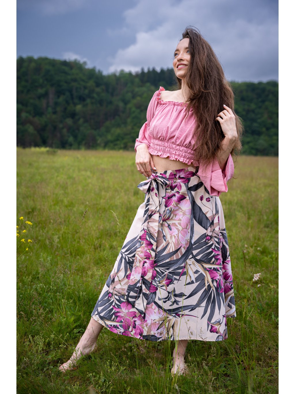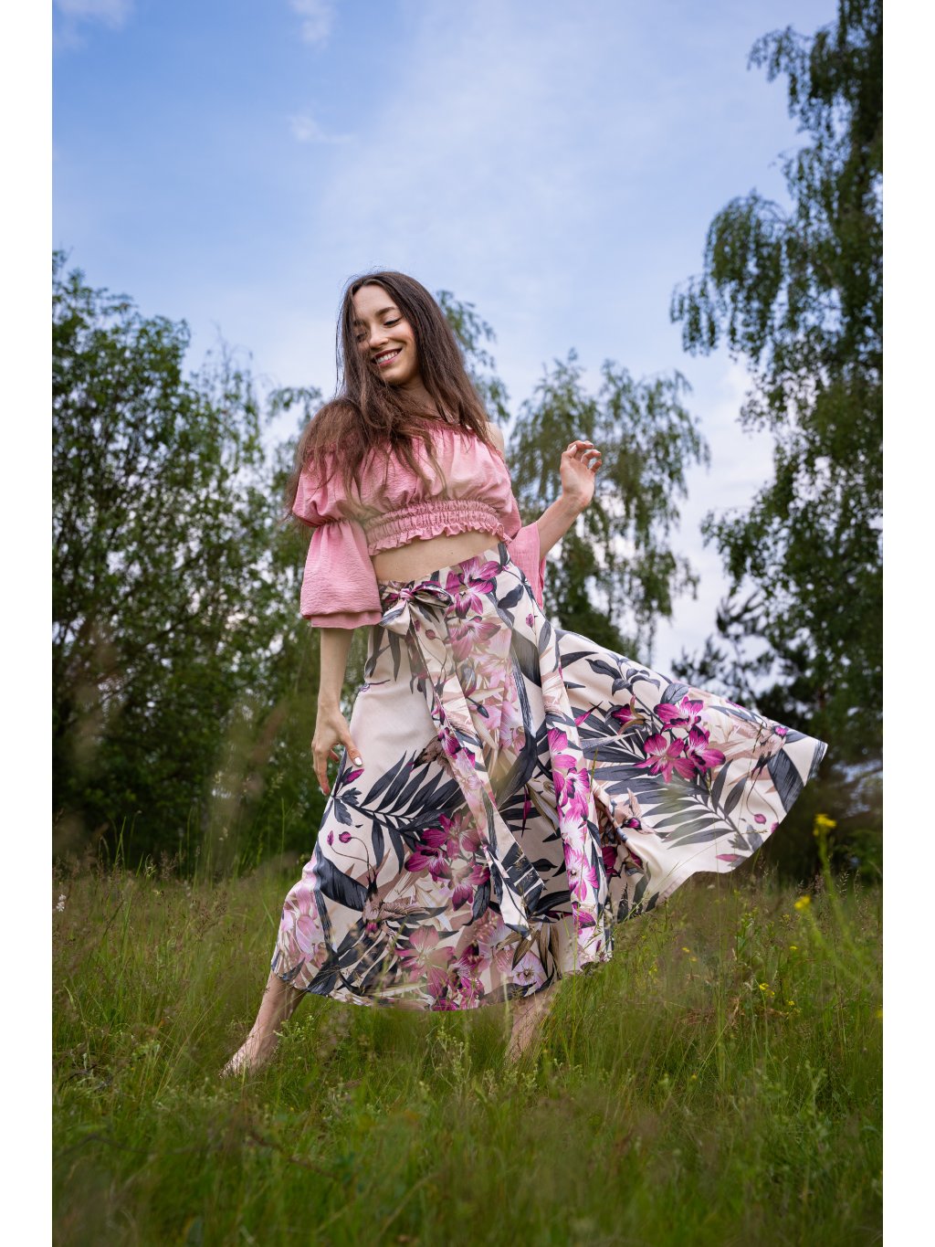 Zavinovací sukně půlkolového střihu, 100% bavlna s krásným potiskem lístků a květin.