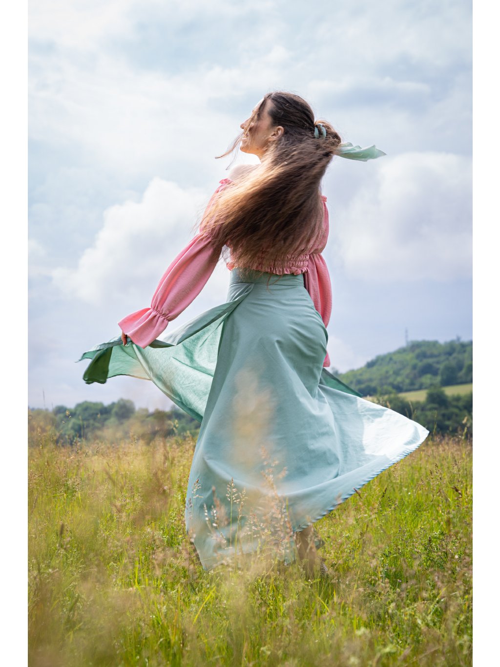 Jemná, svěží a ručně šitá s láskou. Tato dlouhá půlkolová sukně z 100 % bavlny v něžném odstínu mentolové přináší do outfitu lehkost, eleganci a ženskost.