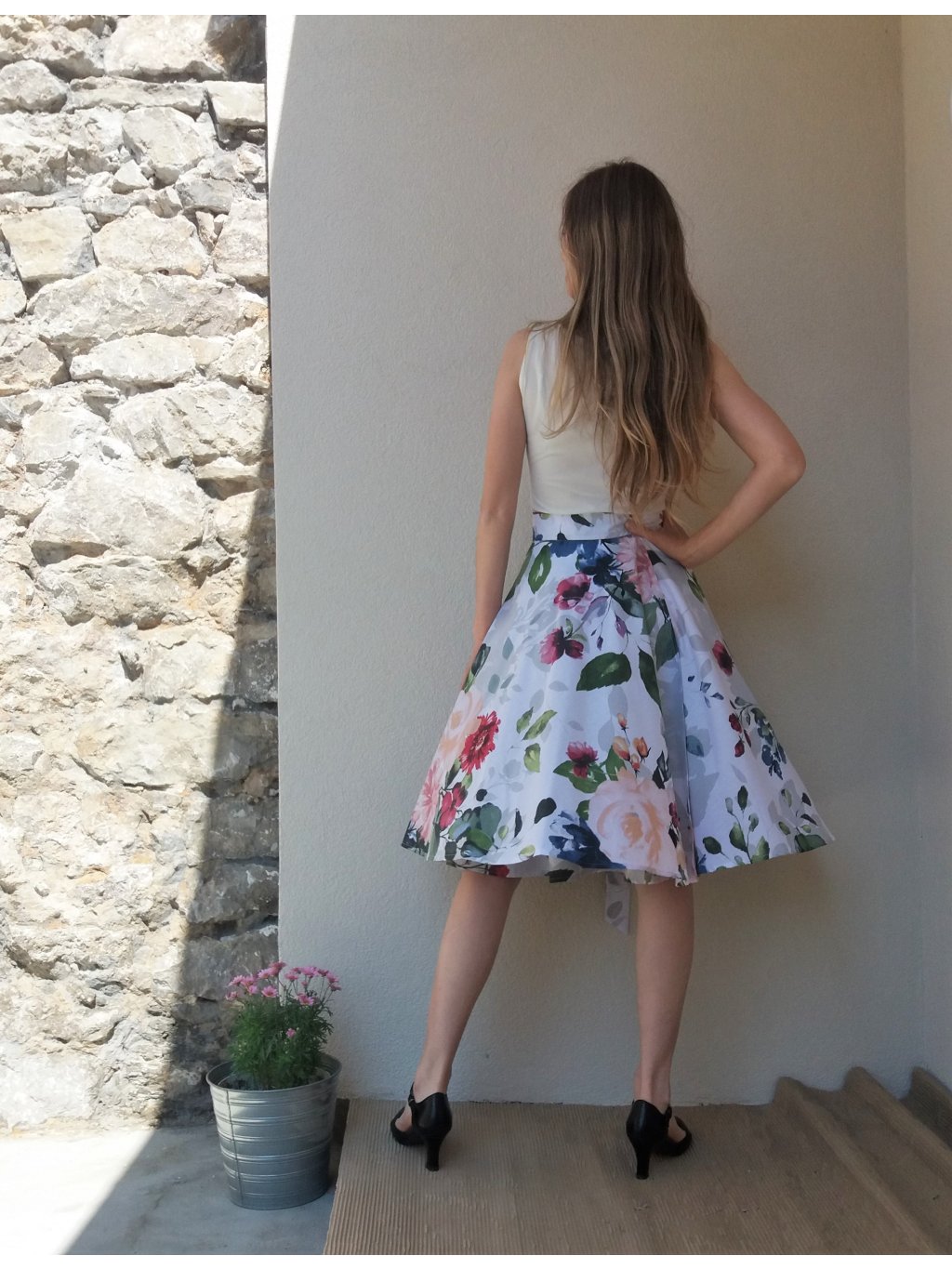 Zavinovací sukně kolového střihu ušitá z krásné, něžné látky. Květy v akvarelu, pestré barvy, krásné provedení.